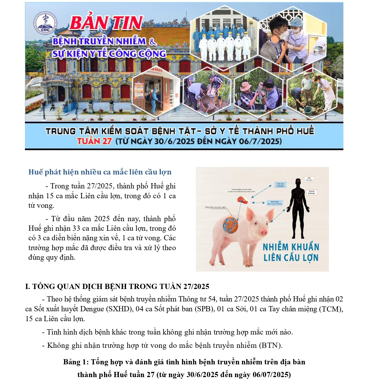 Bản tin bệnh truyền nhiễm và sự kiện y tế công cộng - Tuần 27 (từ ngày 30/6/2025 đến ngày 06/7/2025)