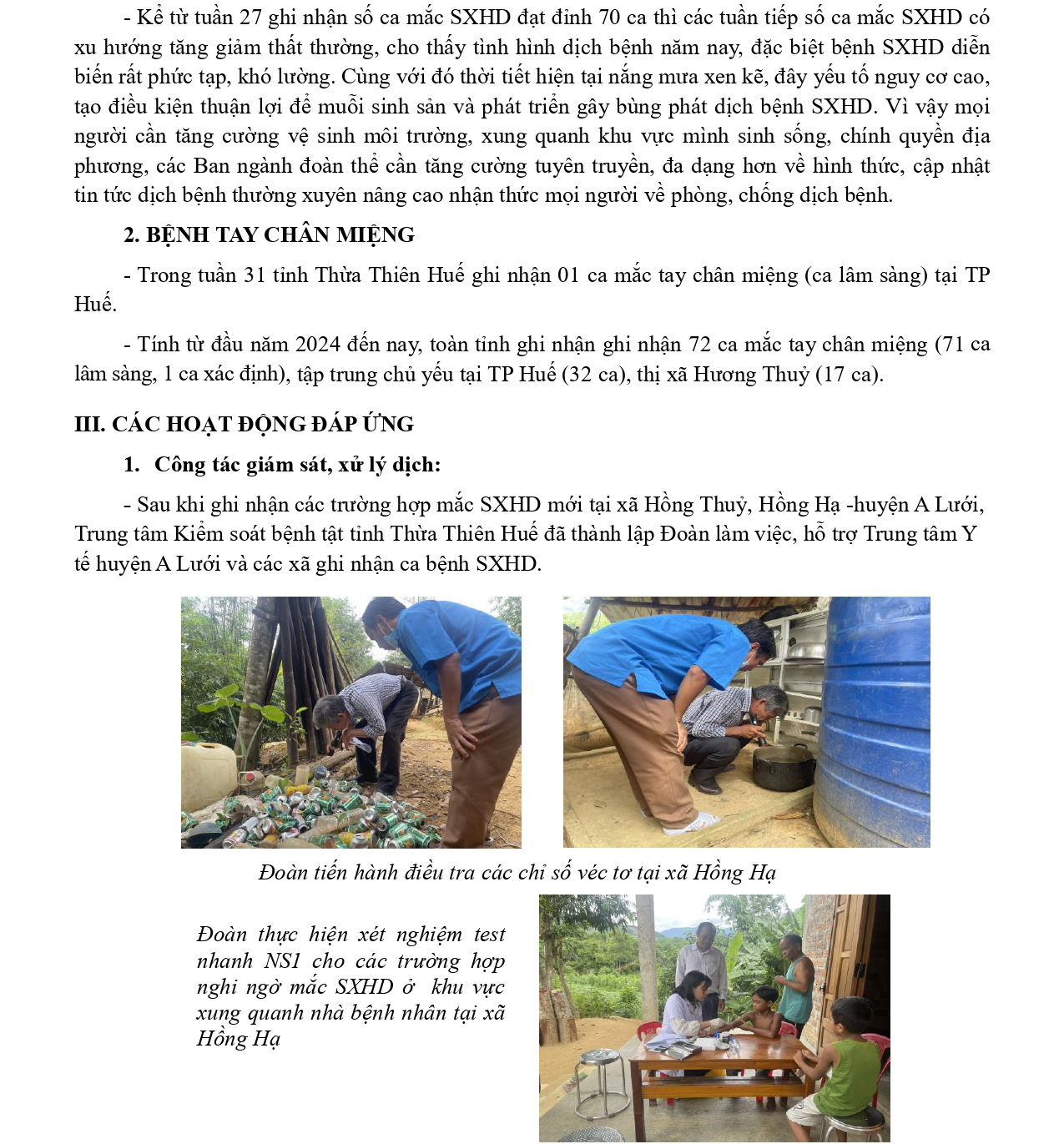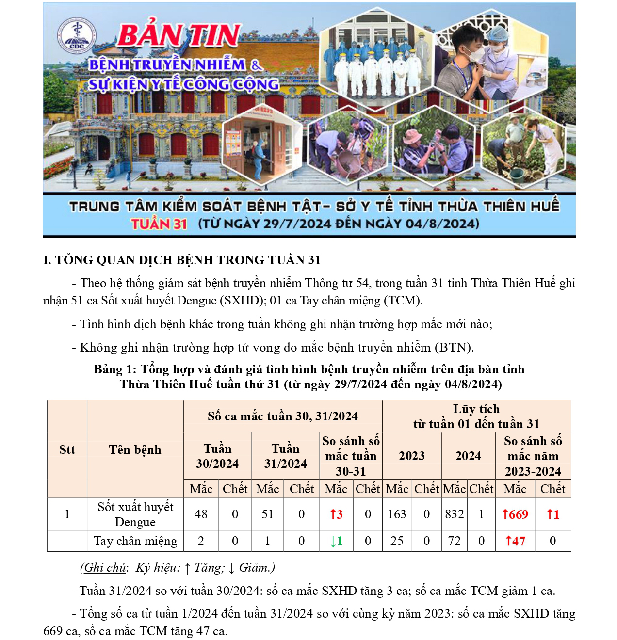 Bản tin bệnh truyền nhiễm và sự kiện y tế công cộng - Tuần 31 (từ ngày 29/7/2024 đến ngày 04/8/2024)
