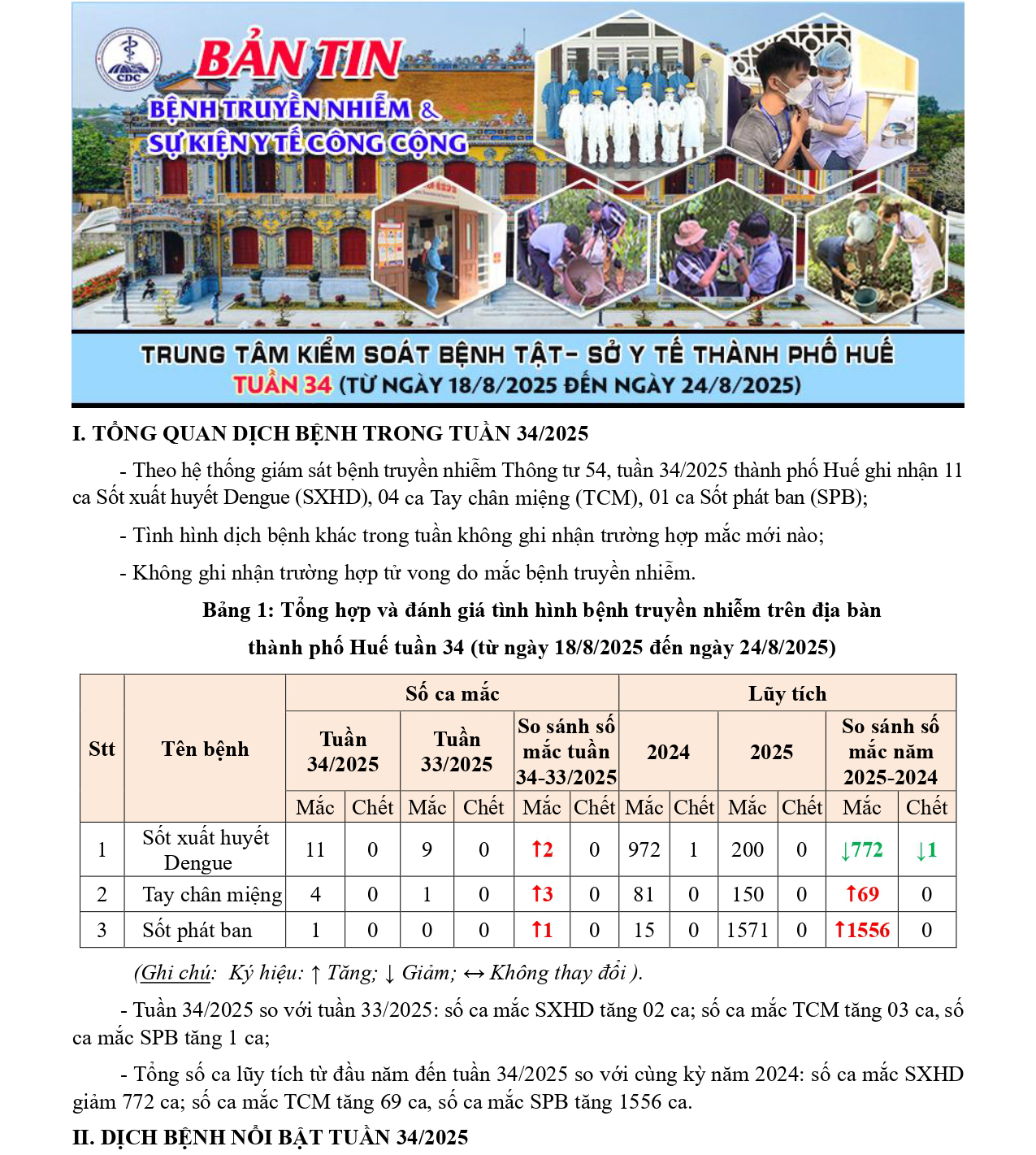 Bản tin bệnh truyền nhiễm và sự kiện y tế công cộng - Tuần 34 (từ ngày 18/8/2025 đến ngày 24/8/2025)