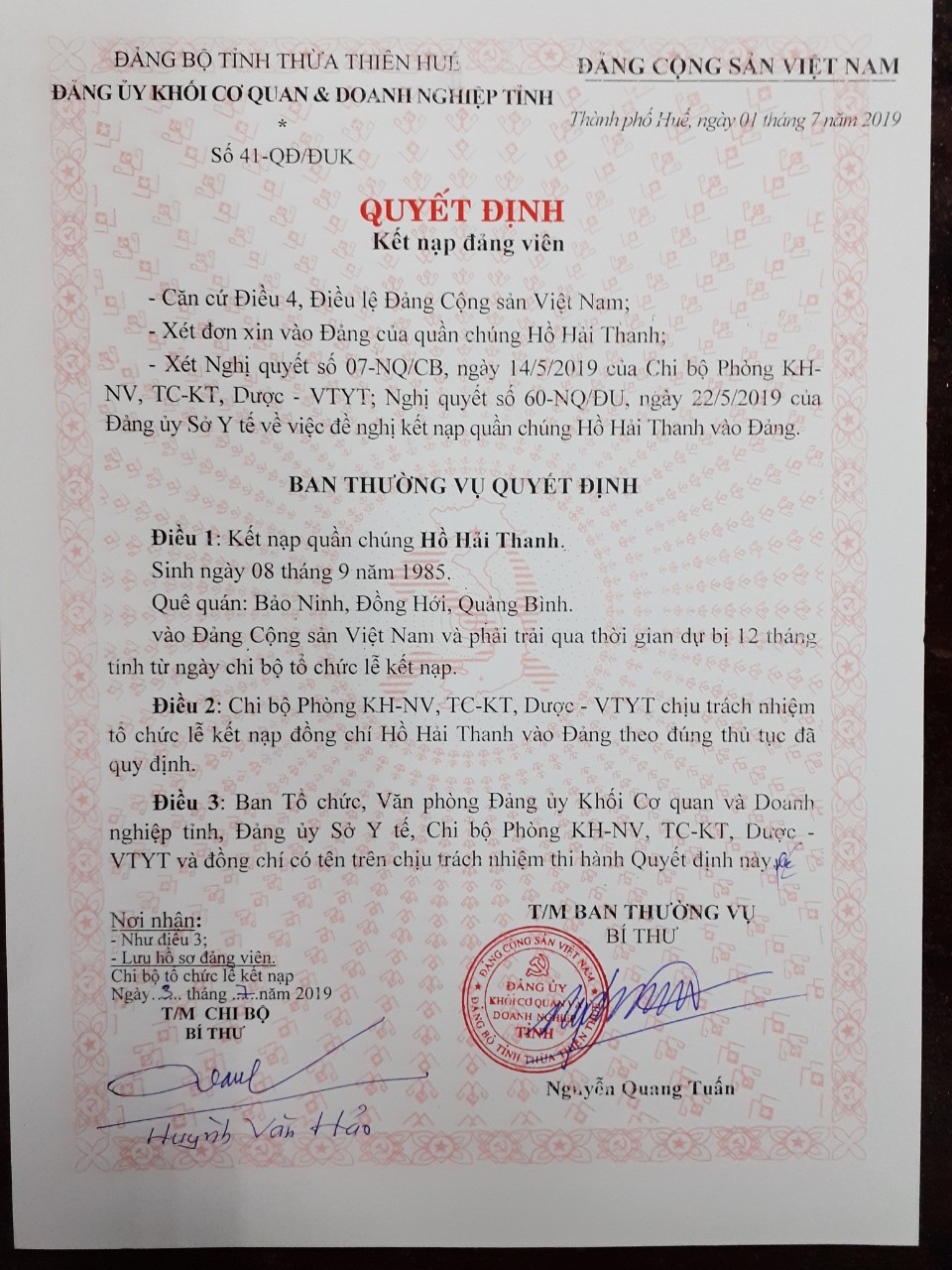 Với tinh thần chỉ đạo của cấp ủy đảng cấp trên, Chi bộ Phòng KHNV, Tài chính kế toán, Dược VTYT đã chỉ đạo tổ chức nhiều phong trào thi đua, lập thành tích trong thực hiện nhiệm vụ và luôn tích cực bồi dưỡng, giúp đỡ các quần chúng ưu tú để kết nạp vào Đảng. Qua thời gian tích cực phấn đấu của quần chúng Hồ Hải Thanh và được sự giáo dục, giúp đỡ của Chi bộ, quần chúng Hồ Hải Thanh đã tự khẳng định được năng lực và tự nguyện xin vào Đảng CSVN. Chiều ngày 03/7/2019 Chi bộ phòng KHNV, TCKT, DVTYT tiến hành tổ chức Lễ kết nạp đảng viên cho đồng chí Hồ Hải Thanh. Đến dự Lễ kết nạp đảng viên có: Đồng chí Nguyễn Đình Sơn, đảng ủy viên đảng bộ SYT, Bí thư đảng bộ bộ phận, phó GĐ phụ trách TTKSBT, các đ/c trong BCH đảng ủy bộ phận và các đ/c cấp ủy Chi bộ và toàn thể đảng viên, cán bộ viên chức của phòng KHNV, Phòng TCKT, khoa Dược VTYT. Lễ kết nạp được tổ chức long trọng và thành công.