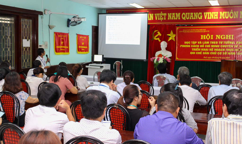 Với chủ đề “Xây dựng ý thức tôn trọng nhân dân, phát huy dân chủ, chăm lo đời sống nhân dân theo tư tưởng, đạo đức, phong cách Hồ Chí Minh”, ngày 10/4/2019, Đảng bộ Trung tâm Kiểm soát bệnh tật tỉnh đã tổ chức Hội nghị chuyên đề học tập và làm theo tấm gương đạo đức Hồ Chí Minh -Triển khai kế hoạch thực hiện qui chế dân chủ cơ sở năm 2019. Tham dự Hội nghị có đồng chí Nguyễn Đình Sơn-Bí thư Đảng bộ bộ phận-Phó Giám đốc phụ trách Trung tâm Kiểm soát bệnh tật tỉnh cùng toàn thể Đảng viên trong đơn vị.