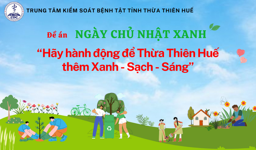 Thực hiện Chỉ thị số 07-CT/TU ngày 05/7/2021 của Ban Thường vụ Tỉnh ủy về việc tiếp tục đẩy mạnh các phong trào xây dựng Thừa Thiên Huế xanh, sạch, sáng; Chỉ thị số 42-CT/TU ngày 08/8/2023 của Ban Thường vụ Tỉnh uỷ về phát huy sức mạnh của hệ thống chính trị và toàn dân, quyết tâm thực hiện thắng lợi mục tiêu trở thành thành phố trực thuộc Trung ương trước năm 2025; Kế hoạch số 55/KH-UBND ngày 05/02/2024 của Ủy ban nhân dân tỉnh Thừa Thiên Huế, Sở Y tế, TTKSBT đã ban hành Kế hoạch tổ chức, triển khai thực hiện Đề án Ngày Chủ nhật xanh “Hãy hành động để Thừa Thiên Huế thêm Xanh - Sạch - Sáng” năm 2024.