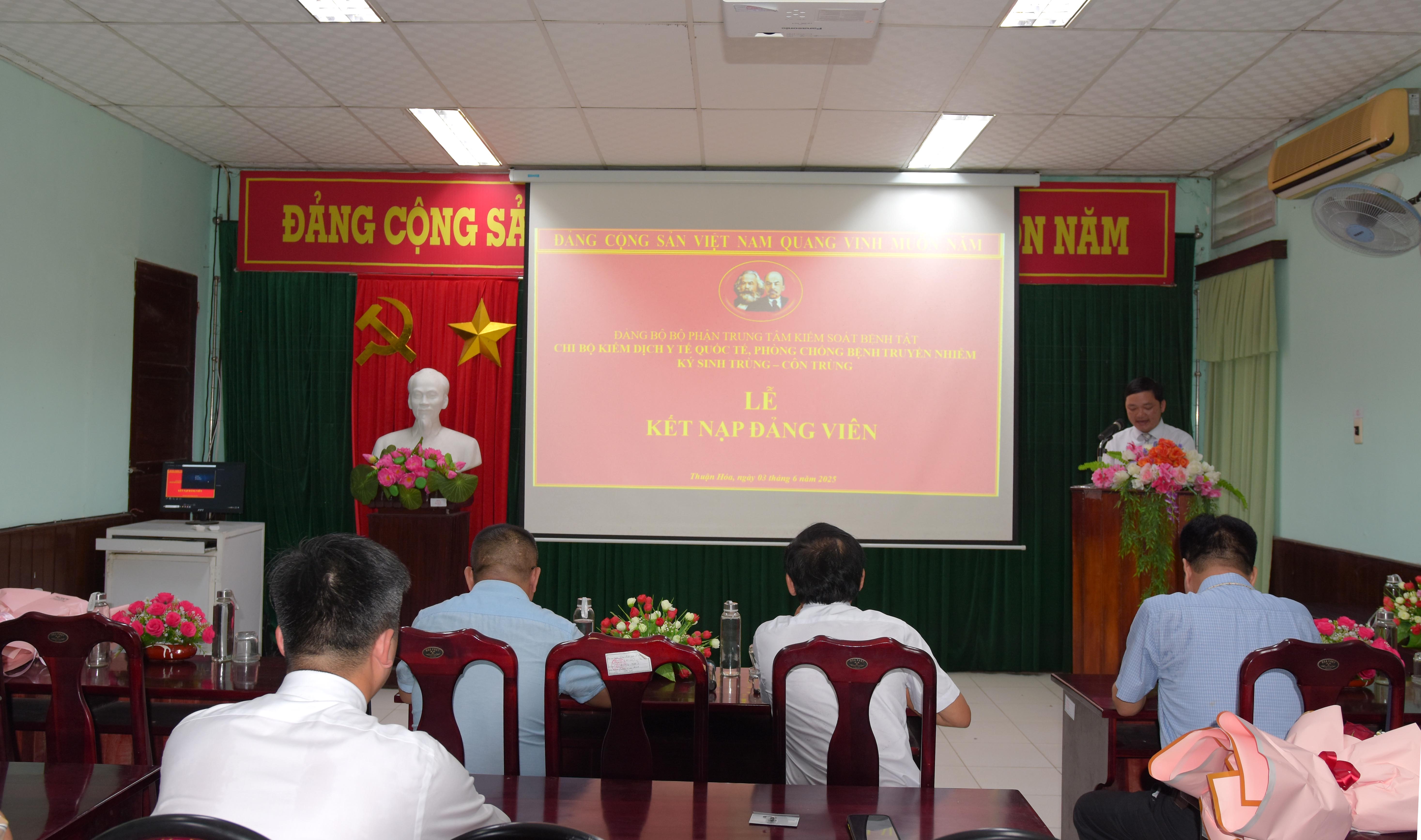 Ngày 03/6, Chi bộ Kiểm dịch Y tế Quốc tế - Phòng chống bệnh Truyền nhiễm, Ký sinh trùng côn trùng, trực thuộc Đảng bộ Bộ phận Trung tâm Kiểm soát bệnh tật thành phố Huế (CDC Huế) tổ chức Lễ kết nạp Đảng viên mới. Tham dự Lễ kết nạp có đồng chí Hồ Xuân Vũ - UVBCH Đảng bộ Bộ phận, Phó Giám đốc CDC Huế, các đồng chí trong Cấp ủy Chi bộ và các đảng viên của Chi bộ KDYTQT-PCBTN, KSTCT.