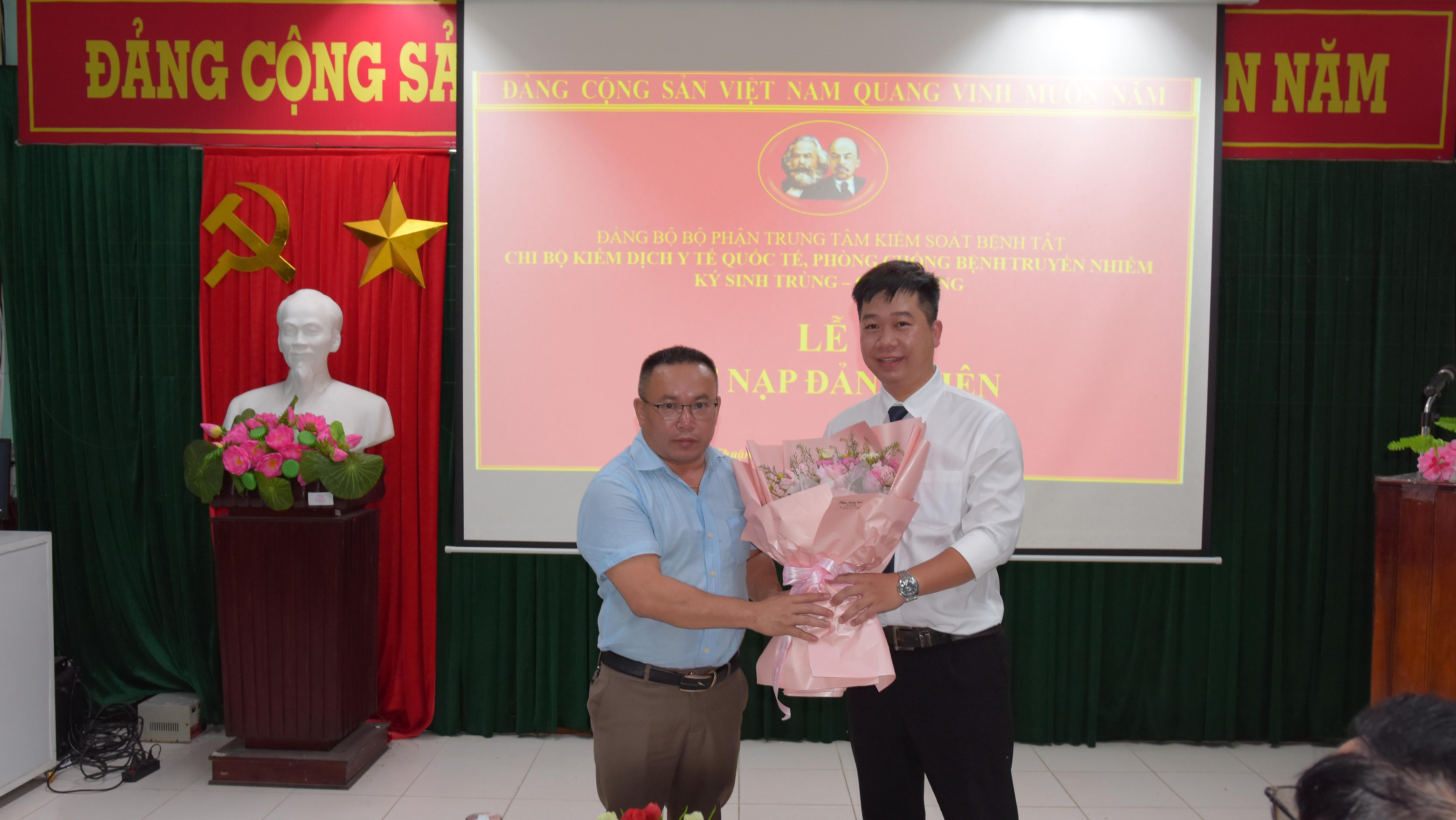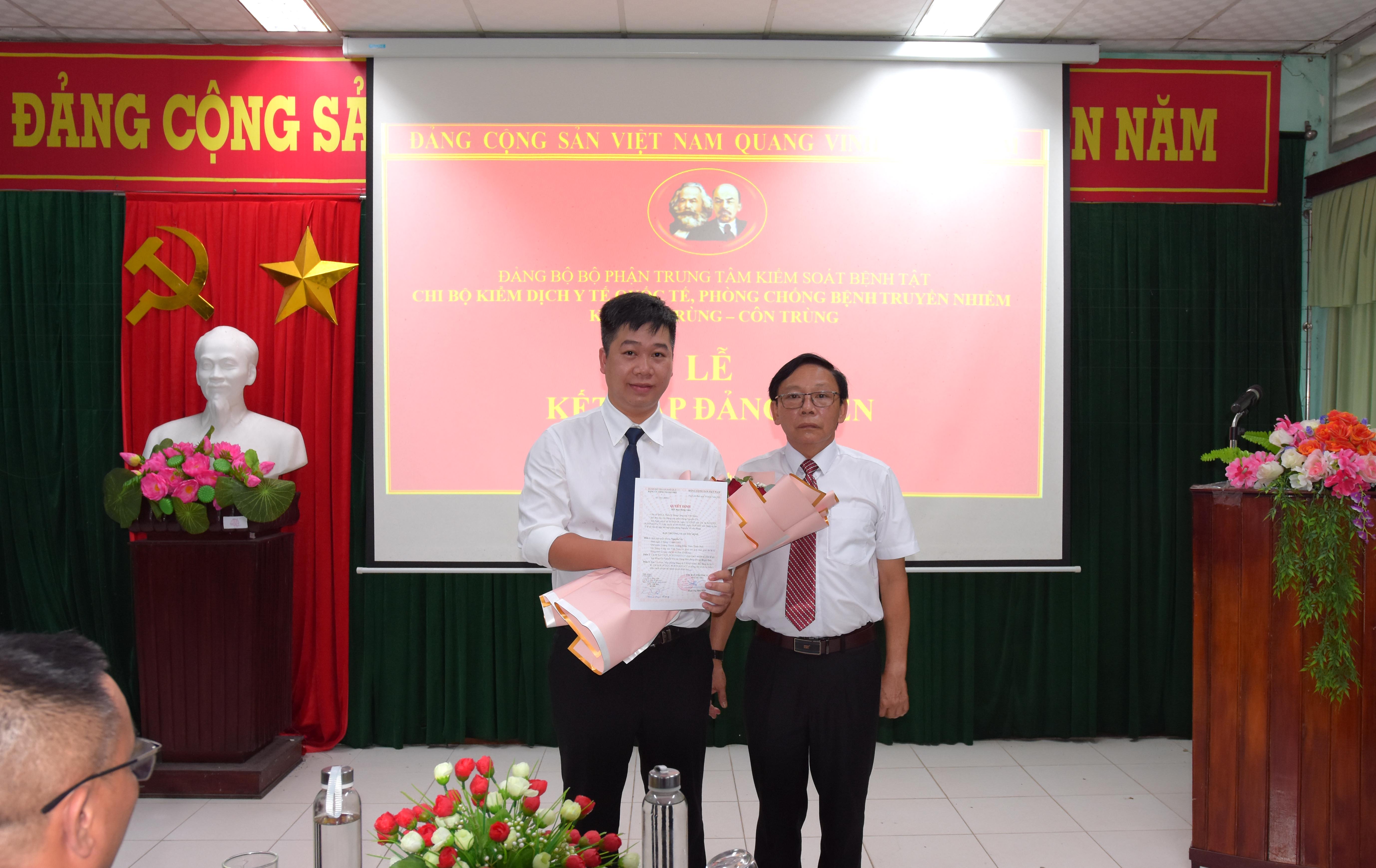 Đồng chí Trần Đạo Phong - Bí thư Chi bộ KDYTQT-PCBTN, KSTCT công bố và trao Quyết định kết nạp Đảng, đồng chí Nguyễn Vũ đọc Lời tuyên thề trước cờ Đảng, cờ Tổ quốc và chân dung Chủ tịch Hồ Chí Minh.
