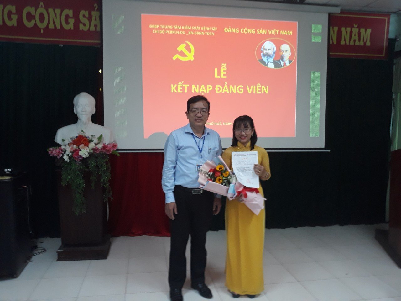 Đến tham dự buổi lễ có đồng chí Nguyễn Lê Tâm- Phó Bí thư Đảng bộ bộ phận – Phó Giám đốc phụ trách Trung tâm Kiểm soát bệnh tật, đồng chí Hoàng Văn Thám – Đảng ủy viên ĐBBP- Phó giám đốc TTKSBT, và toàn thể đảng viên thuộc Chi bộ PCBKLN-DD–XN-CĐHA-TDCN. Buổi lễ kết nạp được diễn ra trong không khí trang nghiêm, đúng trình tự, thủ tục của Điều lệ Đảng.