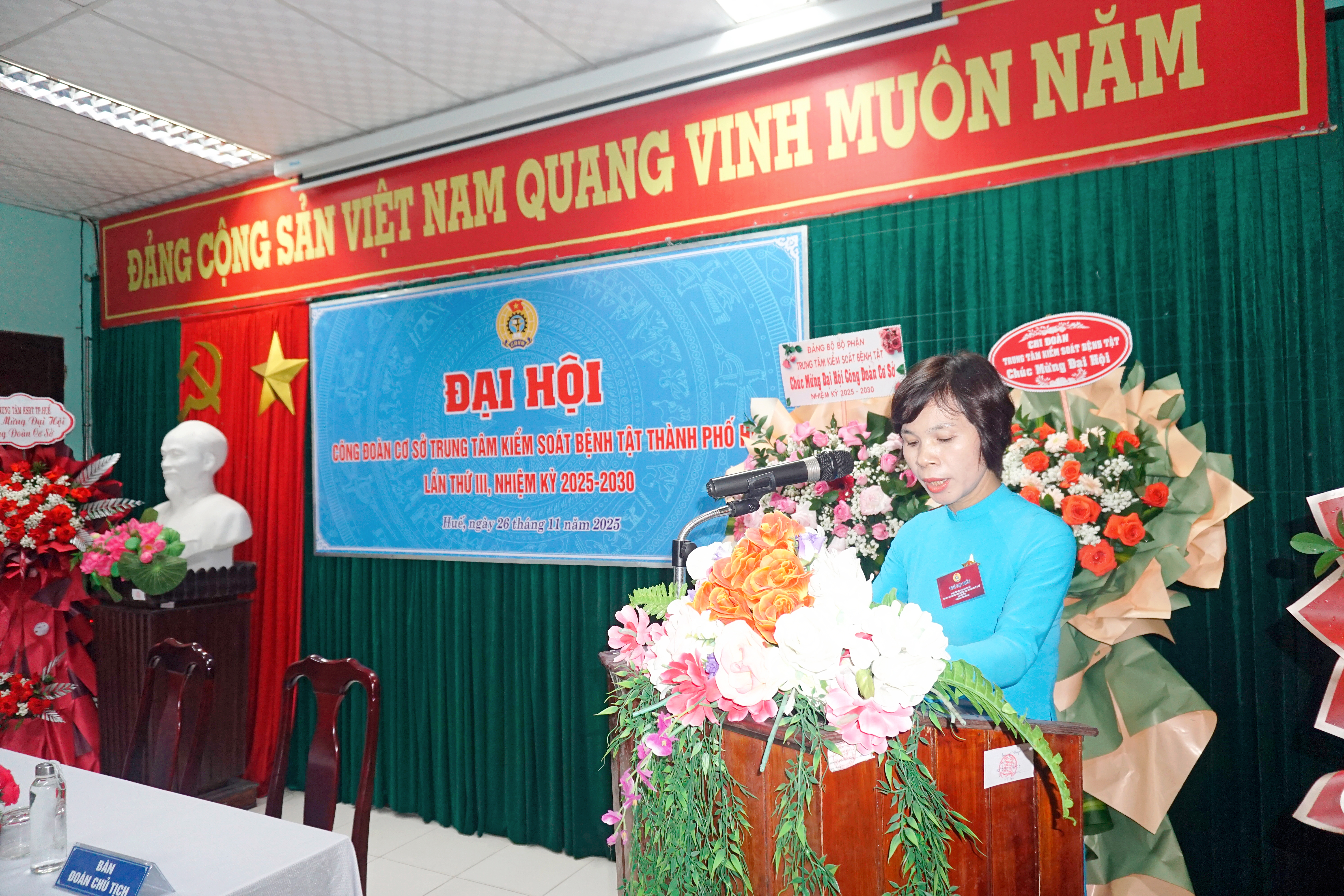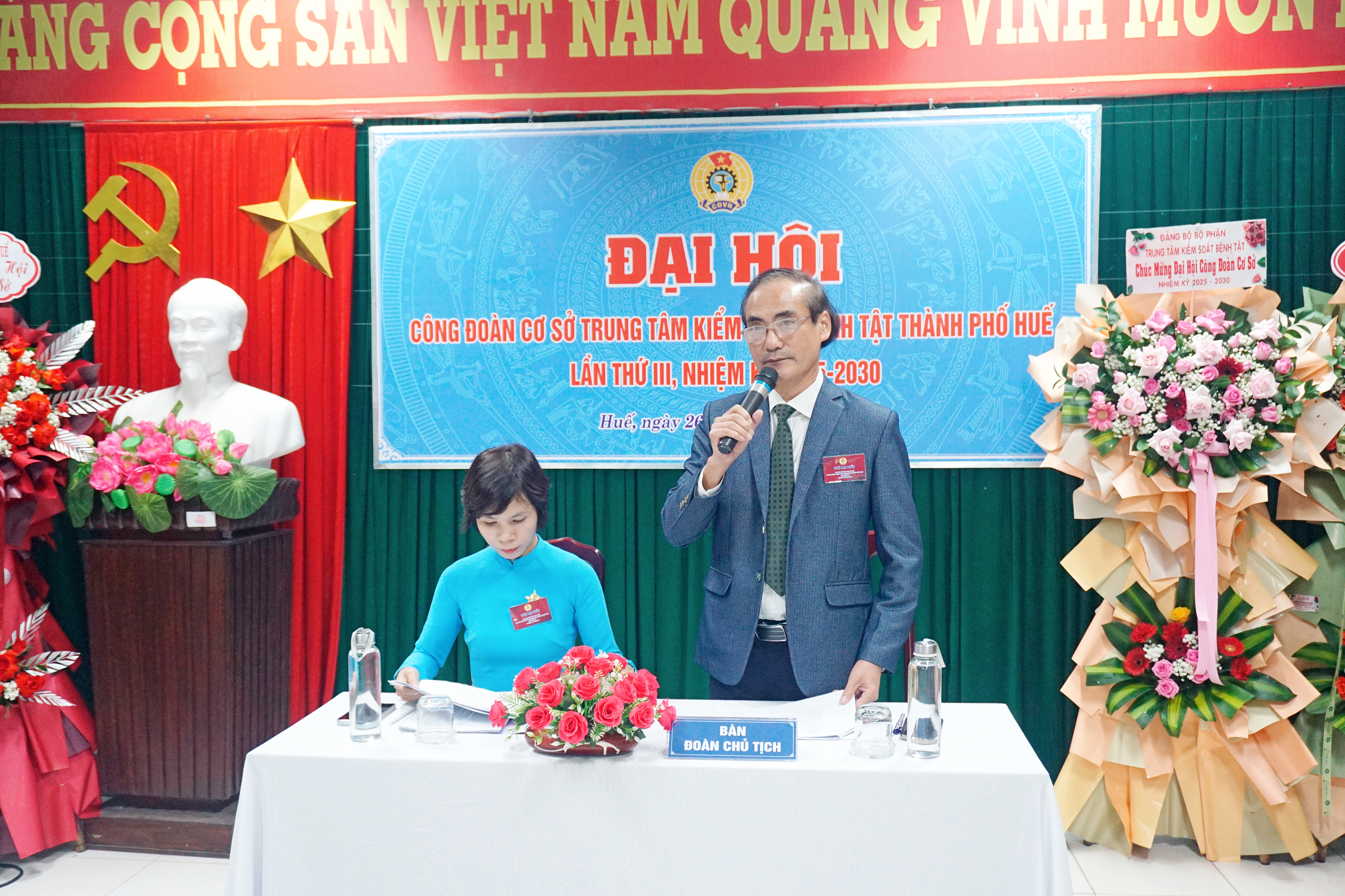 Phát biểu chỉ đạo tại Đại hội, Ông Nguyễn Trung Dũng - Chủ tịch Công đoàn Phường Thuận Hóa, thành phố Huế cho rằng trong nhiệm kỳ qua, Công đoàn Trung tâm Kiểm soát bệnh tật đã có nhiều nỗ lực cố gắng, nhất là trong công tác phòng, chống dịch bệnh còn gặp nhiều khó khăn. Công đoàn đã làm tốt vai trò đồng hành, chăm lo đời sống đoàn viên; phối hợp chặt chẽ với chuyên môn để động viên viên chức, người lao động vượt qua áp lực công việc; tổ chức các phong trào thi đua thiết thực; duy trì khối đoàn kết nội bộ; và giữ vững vai trò là điểm tựa tinh thần cho người lao động. Phát huy kết quả đạt được, Công đoàn đơn vị cần quan tâm tập trung thực hiện tốt một số nội dung như tiếp tục chăm lo đời sống đoàn viên, đẩy mạnh phong trào thi đua trong đoàn viên, gắn với nhiệm vụ chính trị của đơn vị; khuyến khích sáng kiến, cải tiến chuyên môn và nâng cao tinh thần phục vụ người dân. Xây dựng tổ chức Công đoàn vững mạnh, tăng cường phối hợp với chính quyền chuyên môn, đảm bảo tiếng nói của Công đoàn trong các vấn đề liên quan đến chế độ, chính sách, điều kiện làm việc của đoàn viên. Quan tâm đời sống tinh thần, tổ chức các hoạt động văn hóa, văn nghệ, thể thao; kịp thời động viên, hỗ trợ đoàn viên có hoàn cảnh khó khăn. Đồng chí tin tưởng rằng, với tinh thần đoàn kết, trách nhiệm và sự năng động của đội ngũ đoàn viên, cùng sự lãnh đạo của Ban Chấp hành khóa mới, Công đoàn Trung tâm sẽ tiếp tục phát triển vững mạnh, hoàn thành xuất sắc nhiệm vụ được giao.