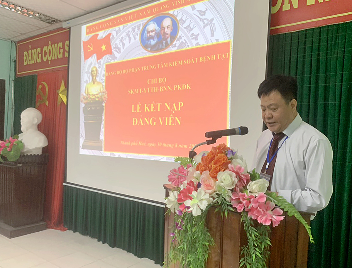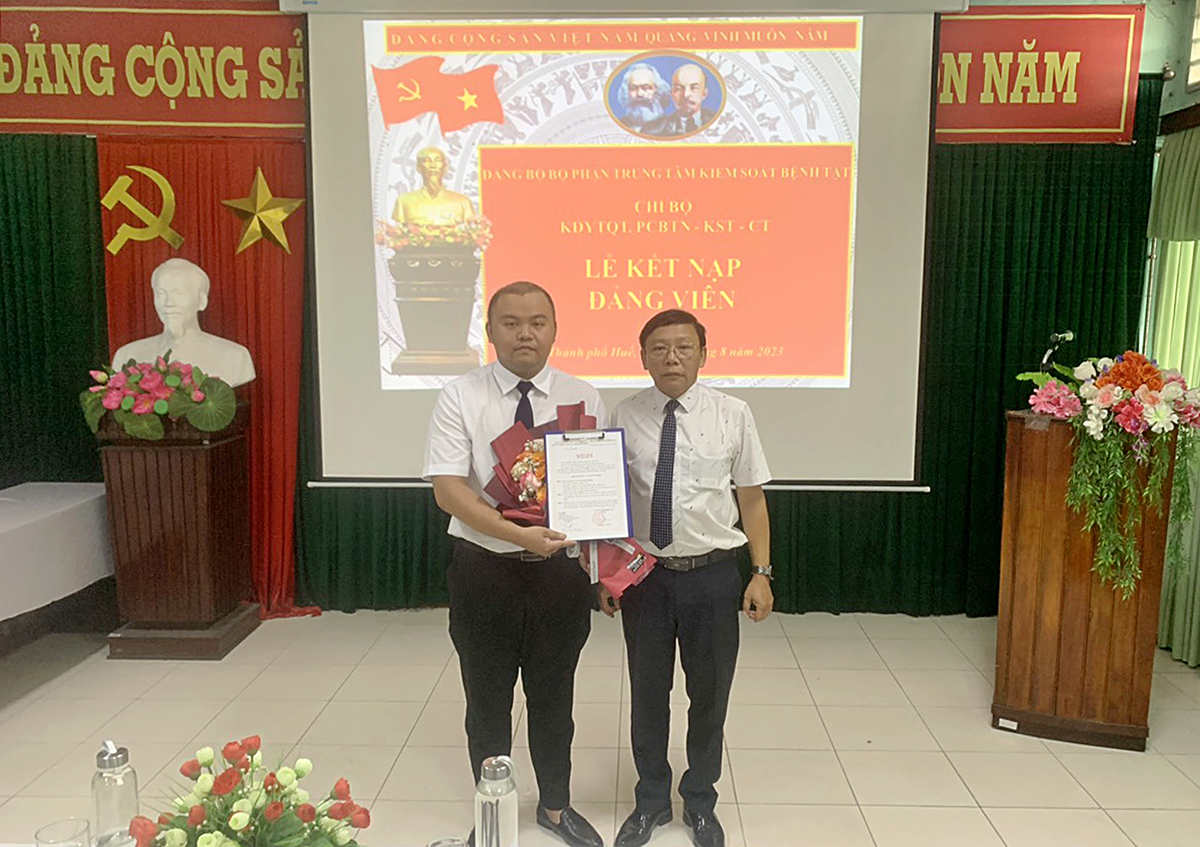 Sáng ngày 30/8, Đảng bộ Bộ phận Trung tâm Kiểm soát bệnh tật (TTKSBT) tổ chức Lễ kết nạp Đảng viên cho 2 quần chúng ưu tú thuộc Chi bộ Sức khỏe môi trường - Y tế trường học - Bệnh nghề nghiệp - Phòng khám Đa khoa (SKMT-YTTH-BNN-PKĐK) và Chi bộ Kiểm dịch Y tế quốc tế - Phòng chống bệnh truyền nhiễm - Ký sinh trùng Côn trùng (KDYTQT-PCBTN-KSTCT). Tham dự Lễ kết nạp có đồng chí Hồ Xuân Vũ - UVBCH Đảng bộ Bộ phận, Phó Giám đốc TTKSBT, các đồng chí Bí thư/Cấp ủy Chi bộ và các Đảng viên của Chi bộ SKMT-YTTH-BNN-PKĐK và Chi bộ KDYTQT-PCBTN-KSTCT.