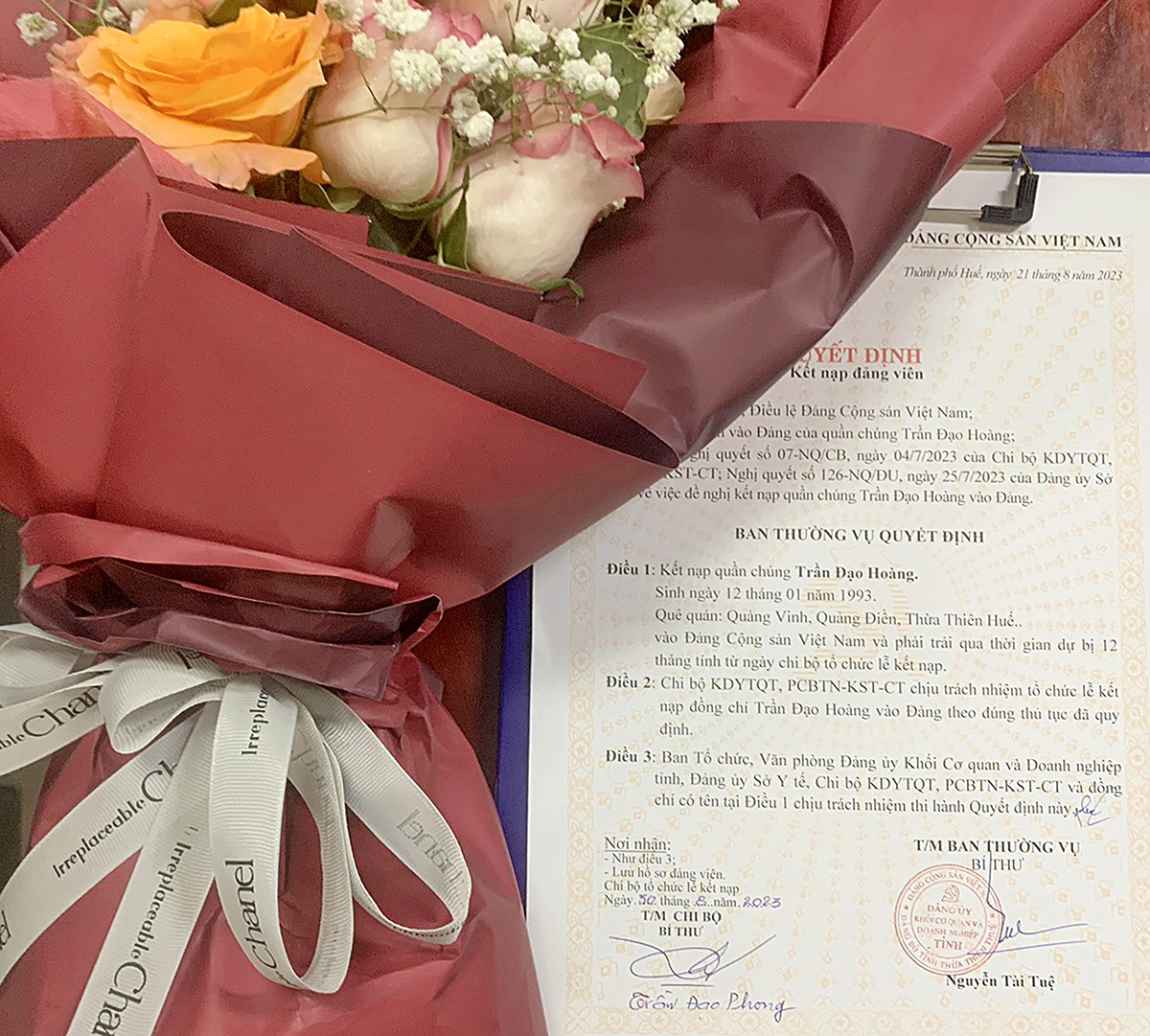 Đ/chí Trần Đạo Phong - Bí thư chi bộ KDYTQT-PCBTN-KSTCT công bố và trao Quyết định Kết nạp đảng. Đảng viên mới Trần Đạo Hoàng đọc Lời tuyên thệ và nghe Bí thư Chi bộ nói về nghĩa vụ và quyền hạn của người Đảng viên.