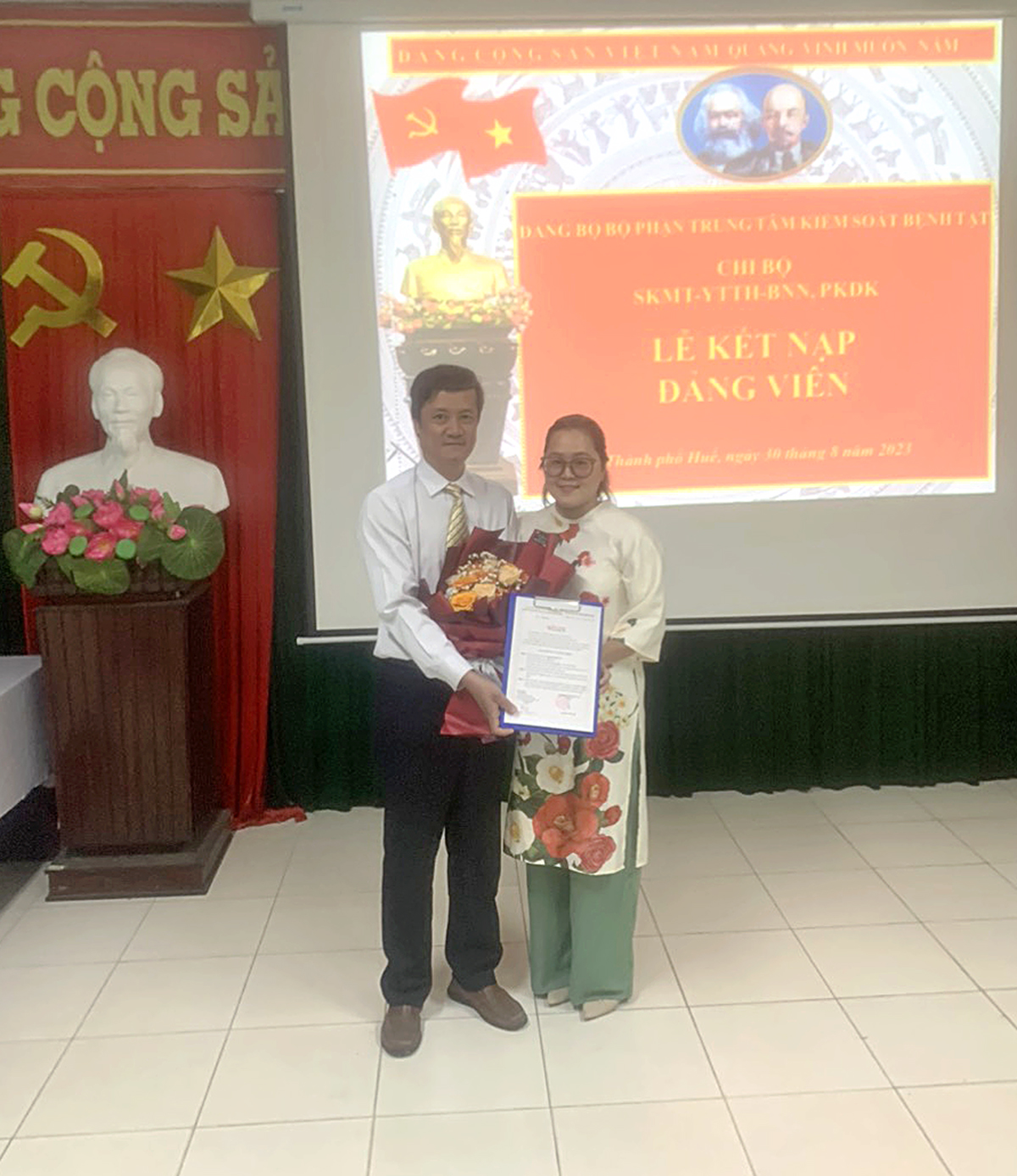 Trong không khí trang trọng, Lễ kết nạp Đảng viên được diễn ra đúng quy định Điều lệ Đảng và trình tự theo Hướng dẫn số 12-HD/BTCTW của Ban Chấp hành Trung ương ngày 18/01/2022. Bí thư Chi bộ SKMT-YTTH-BNN-PKĐK và Chi bộ KDYTQT-PCBTN-KSTCT đã công bố và trao Quyết định kết nạp Đảng của Ban Thường vụ Đảng ủy Khối Cơ quan và Doanh nghiệp thuộc Đảng bộ tỉnh Thừa Thiên Huế cho 2 quần chúng Nguyễn Hữu Trí thuộc Chi bộ SKMT-YTTH-BNN-PKĐK và quần chúng Trần Đạo Hoàng thuộc Chi bộ KDYTQT-PCBTN-KSTCT.
