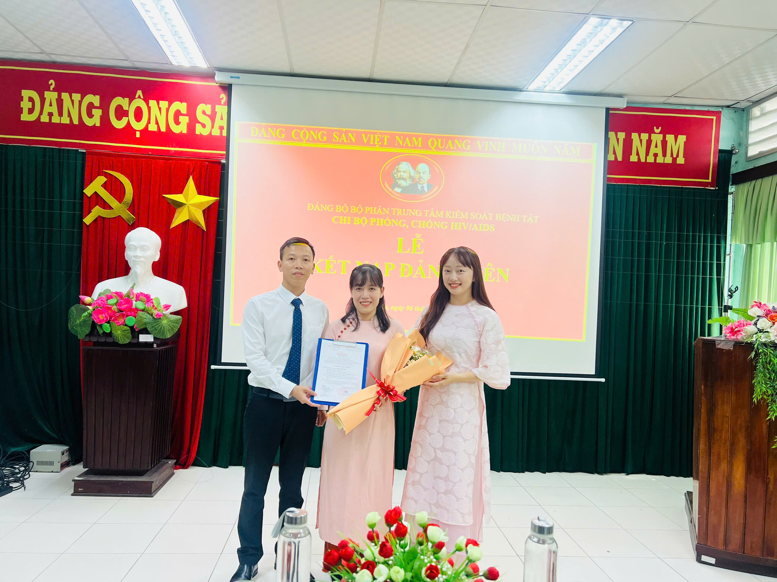 Thay mặt Chi bộ phòng, chống HIV/AIDS, đồng chí Nguyễn Văn Mỹ – Bí thư Chi bộ đã đọc và trao quyết định kết nạp Đảng viên cho quần chúng ưu tú Phạm Thị Mỹ Hạnh. Đồng chí đảng viên mới sẽ phải trải qua thời gian dự bị 12 tháng.