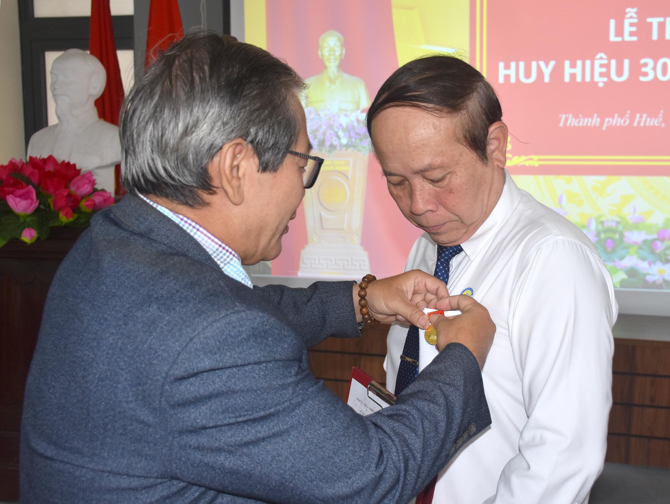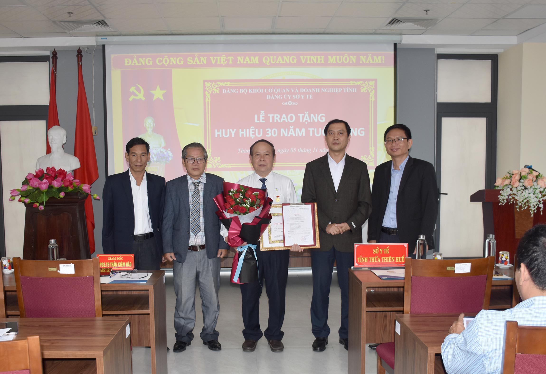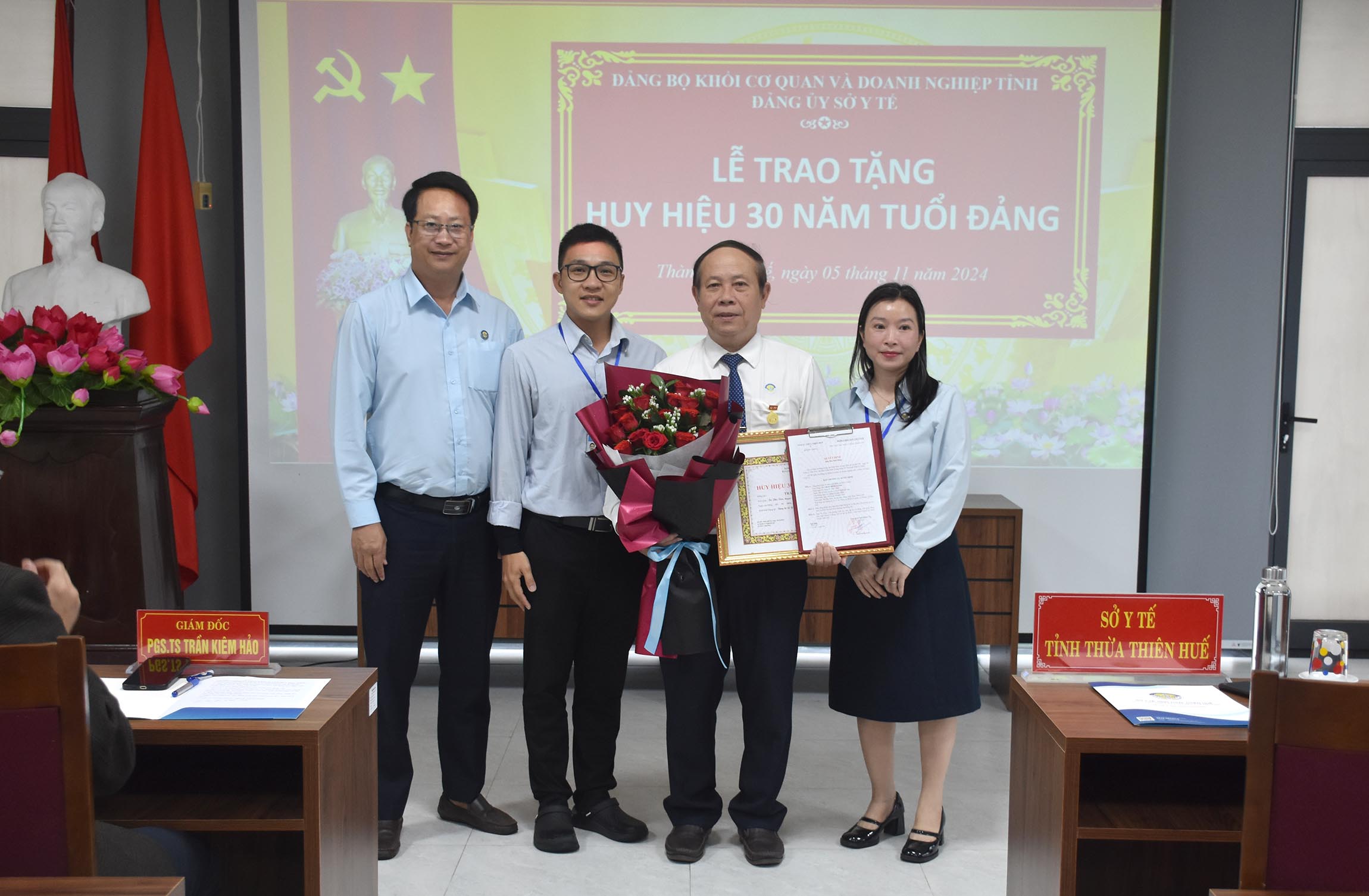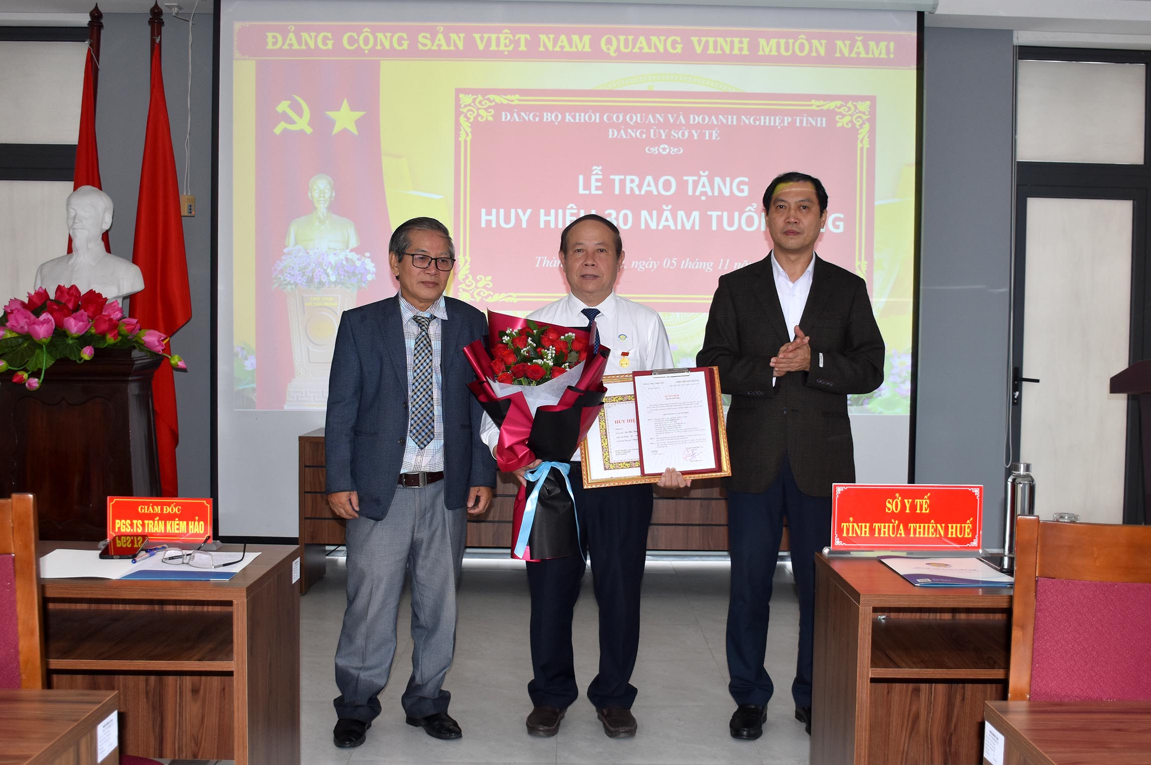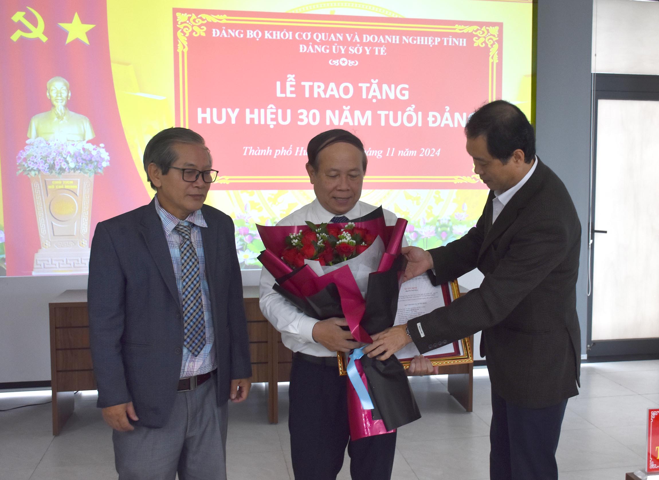 Đồng chí Võ Văn Phúc - UVTV - Trưởng Ban Tổ chức Đảng ủy Khối CQ & DN tỉnh và đồng chí Trần Kiêm Hảo - Bí thư Đảng ủy Sở Y tế trao tặng Huy hiệu, Chứng nhận 30 năm tuổi Đảng và tặng hoa chúc mừng.