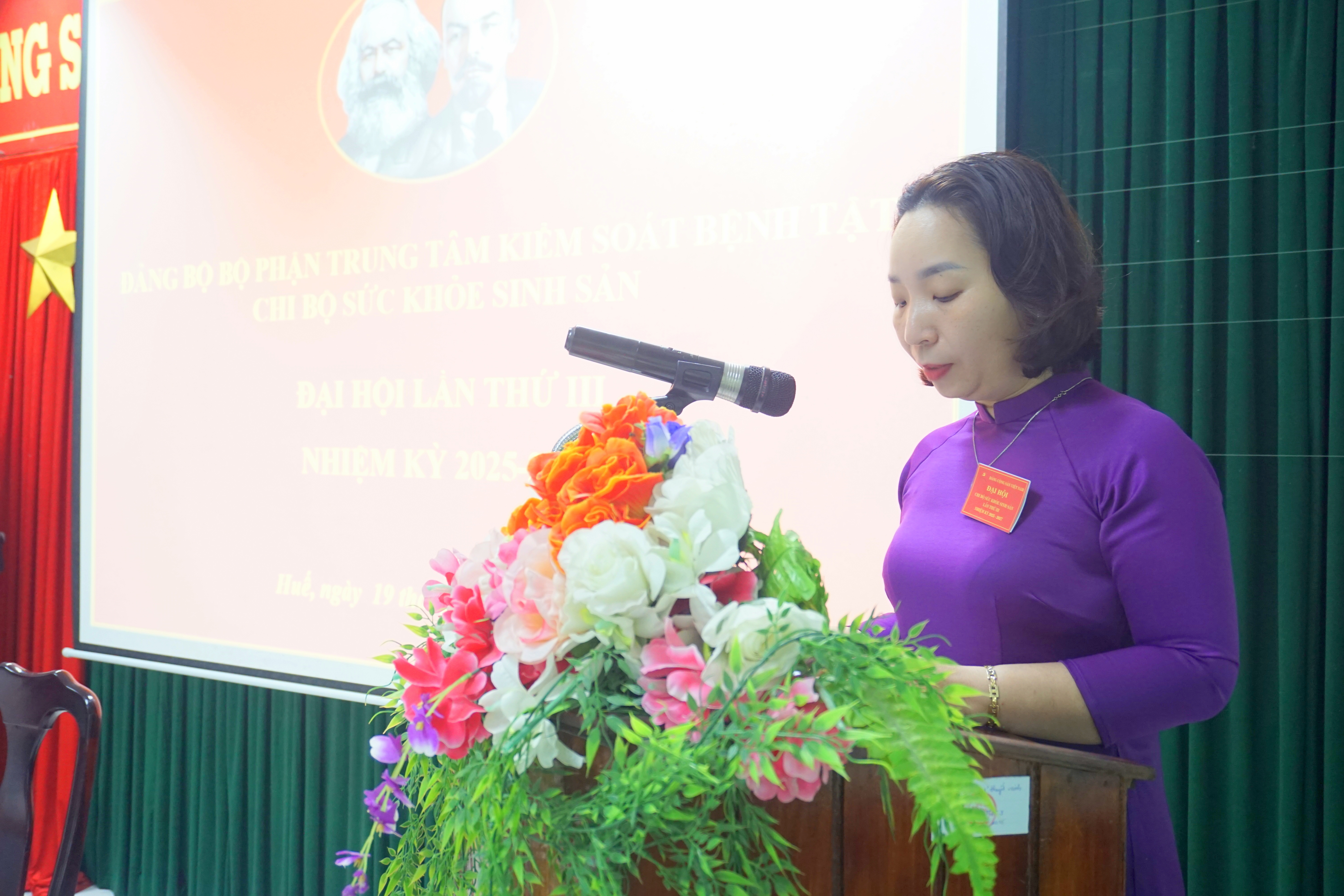 Phát biểu tại Đại hội, đồng chí Hoàng Văn Thám - Uỷ viên BCH Đảng bộ bộ phận đánh giá cao những thành tích của Chi bộ Sức khoẻ sinh sản trong nhiệm kỳ qua, đặc biệt Chi bộ toàn đảng viên nữ nhưng với tinh thần đoàn kết, phê và tự phê cao. Đồng thời BCH Đảng bộ bộ phận cũng kỳ vọng Chi bộ tiếp tục phát huy tinh thần sẵn có thực hiện xuất sắc nhiệm vụ được giao trong nhiệm kỳ 2025-2027.