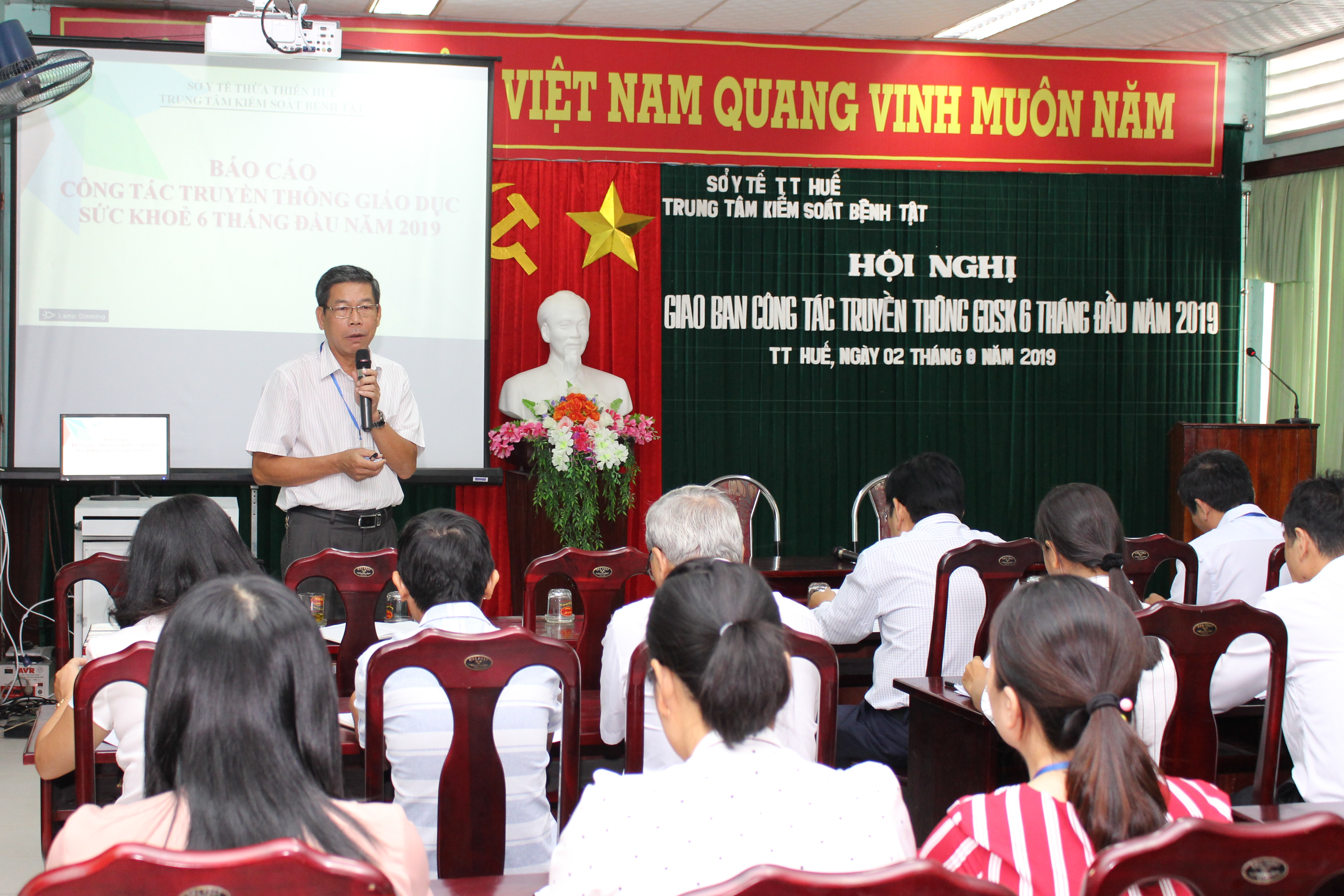 Ngày 2/8/2019 Trung tâm Kiểm soát bệnh tật tỉnh tổ chức Hội nghị giao ban công tác truyền thông giáo dục sức khoẻ 6 tháng đầu năm 2019 và kế hoạch hoạt động trong những tháng tới. Được sự ủy quyền của Giám đốc Sở Y tế, PGS.TS Nguyễn Đình Sơn - Phó Giám đốc phụ trách Trung tâm Kiểm soát bệnh tật tỉnh tham dự và chỉ đạo hội nghị, cùng Ban lãnh đạo Trung tâm, Khoa Truyền thông giáo dục sức khỏe, đại diện lãnh đạo và cán bộ Tổ truyền thông giáo dục sức khỏe của các khoa, phòng Trung tâm Y tế huyện, thị xã, thành phố Huế.