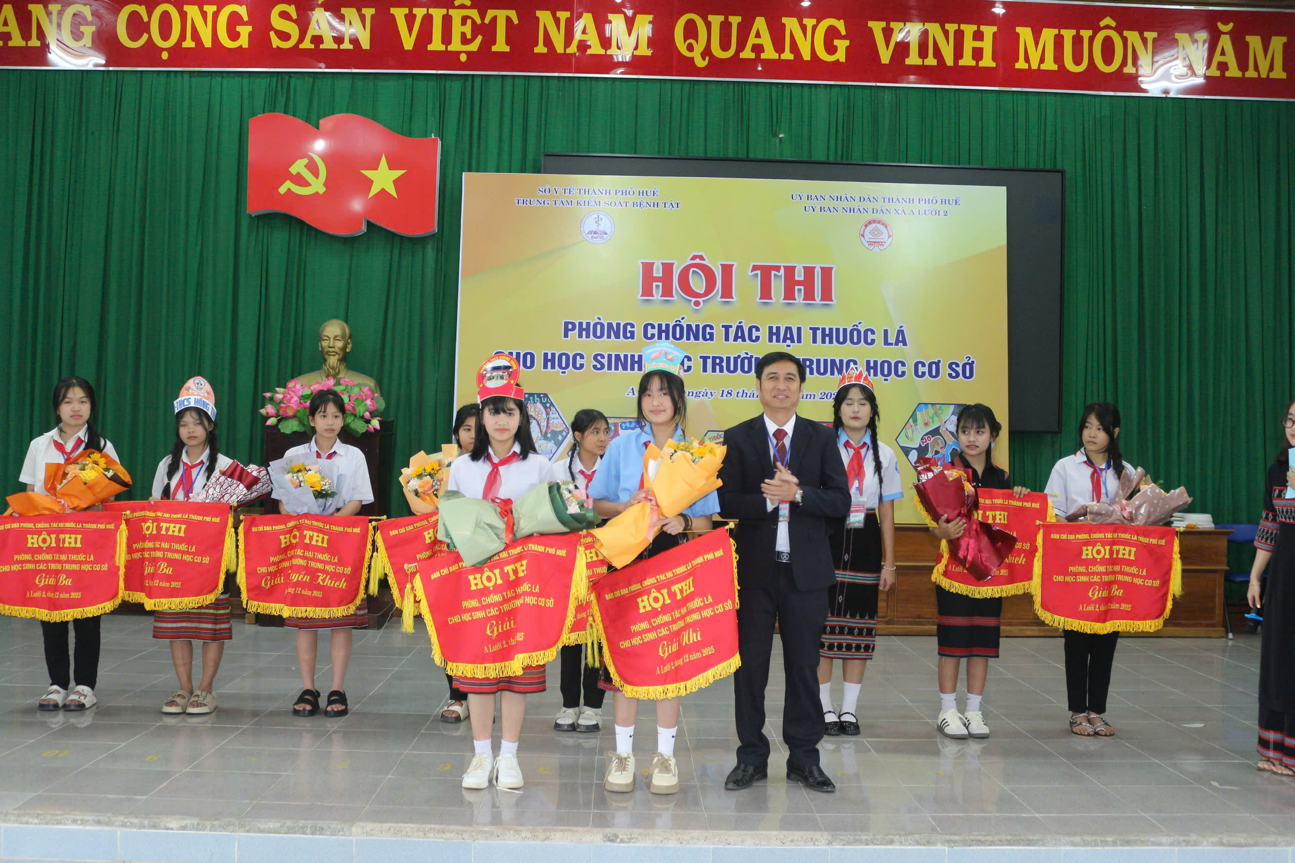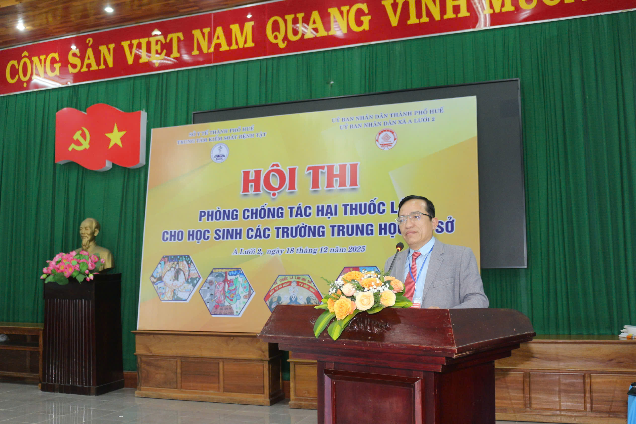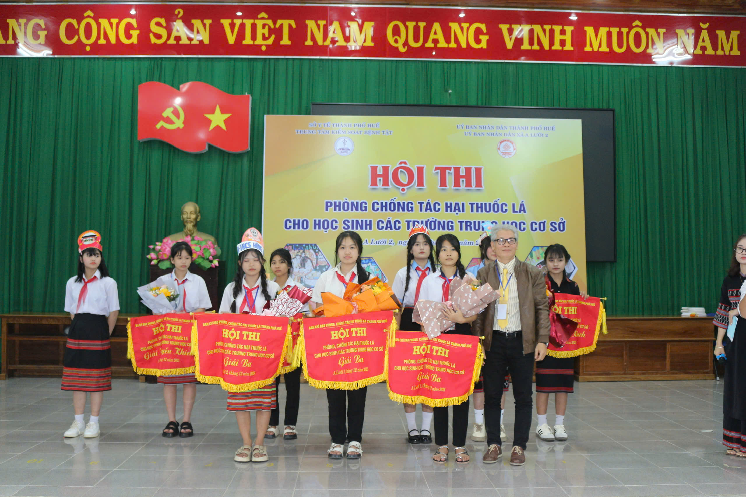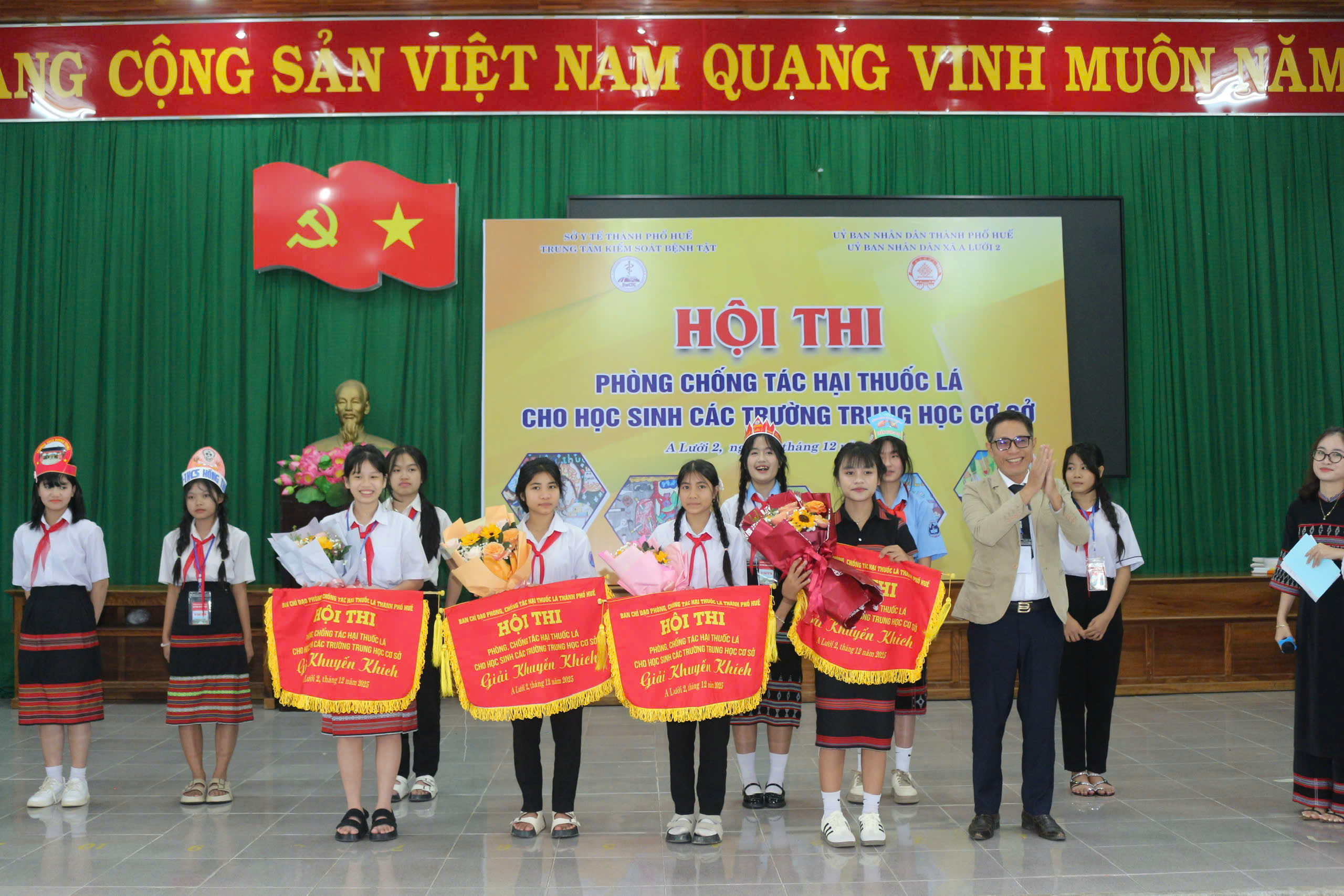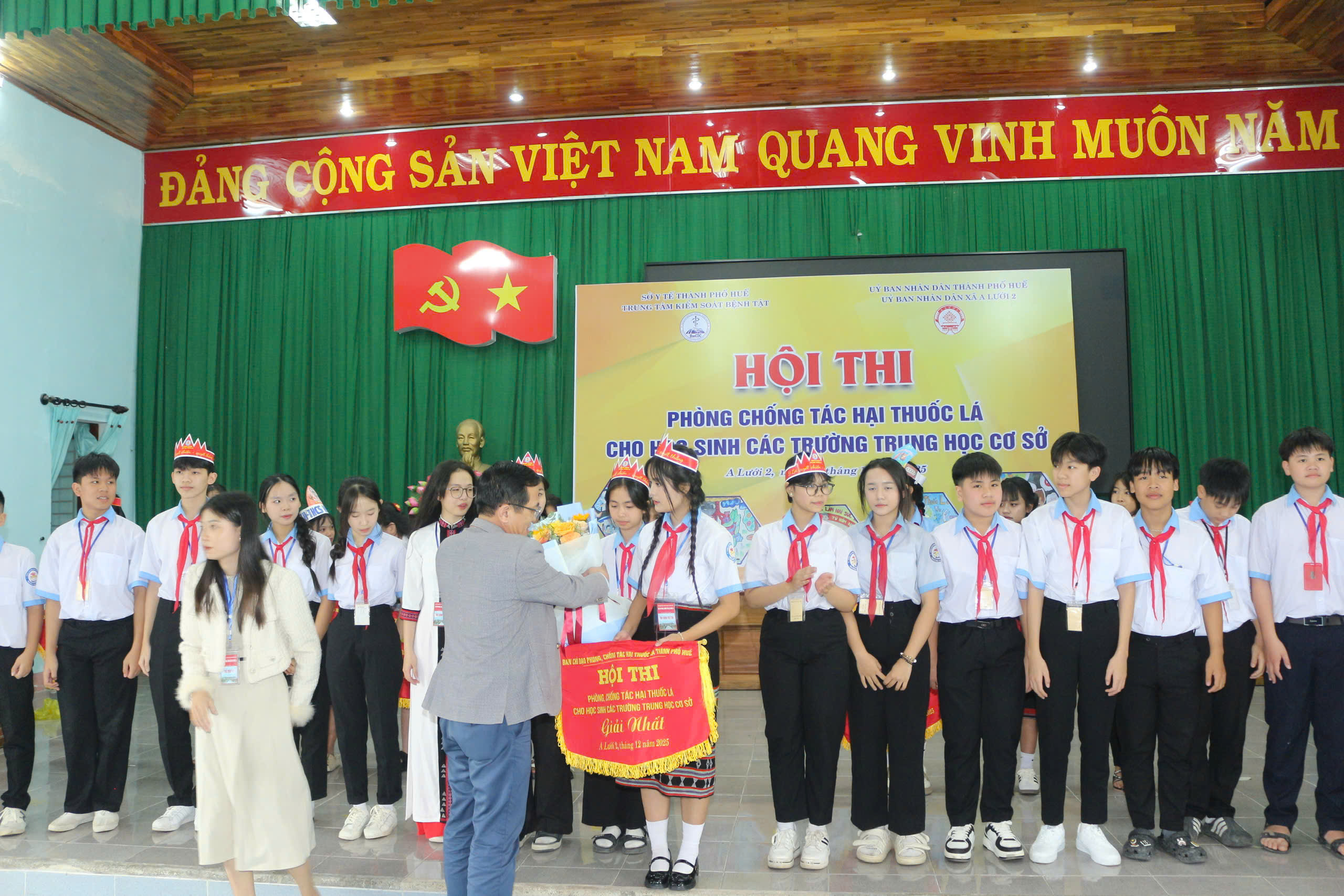 Ngày 18/12/2025, Trung tâm Kiểm soát bệnh tật phối hợp UBND xã A Lưới 2 tổ chức Hội thi phòng, chống tác hại thuốc lá cho học sinh Trung học cơ sở trên địa bàn các xã A Lưới 1, A Lưới 2, A Lưới 3, A Lưới 4 và A Lưới 5. Đến tham dự hội thi có BSCKII Nguyễn Lê Tâm - Phó Giám đốc Trung tâm Kiểm soát bệnh tật thành phố Huế; đại diện lãnh đạo Trung tâm Y tế A Lưới, đại diện lãnh đạo UBND xã A Lưới2, Ban Giám khảo, Ban tổ chức, thư ký Hội thi, đại diện Ban Giám hiệu, giáo viên, học sinh cùng 10 đội thi đến từ các trường THCS xã A Lưới 1, A Lưới 2, A Lưới 3, A Lưới 4 và A Lưới 5.
