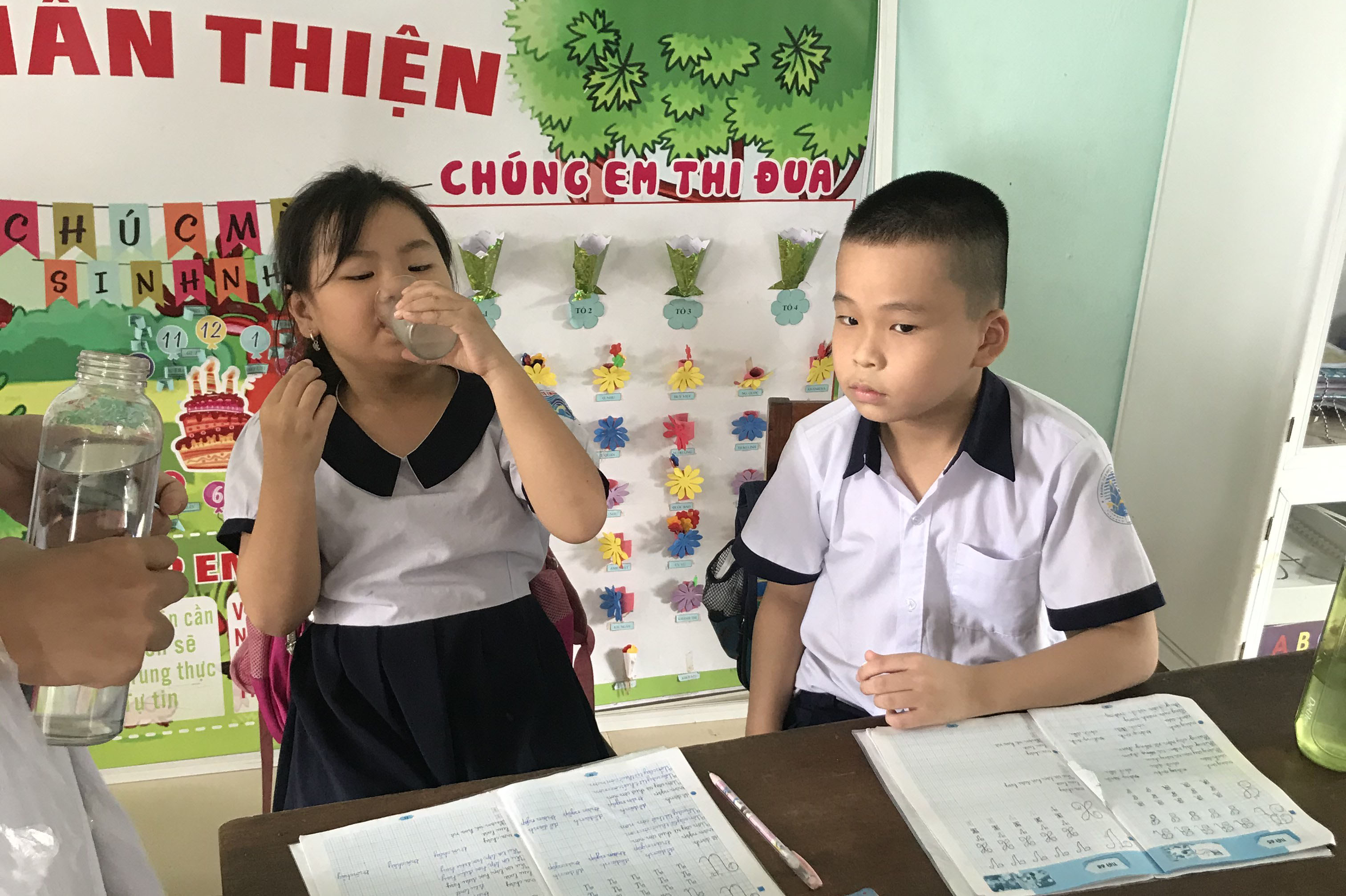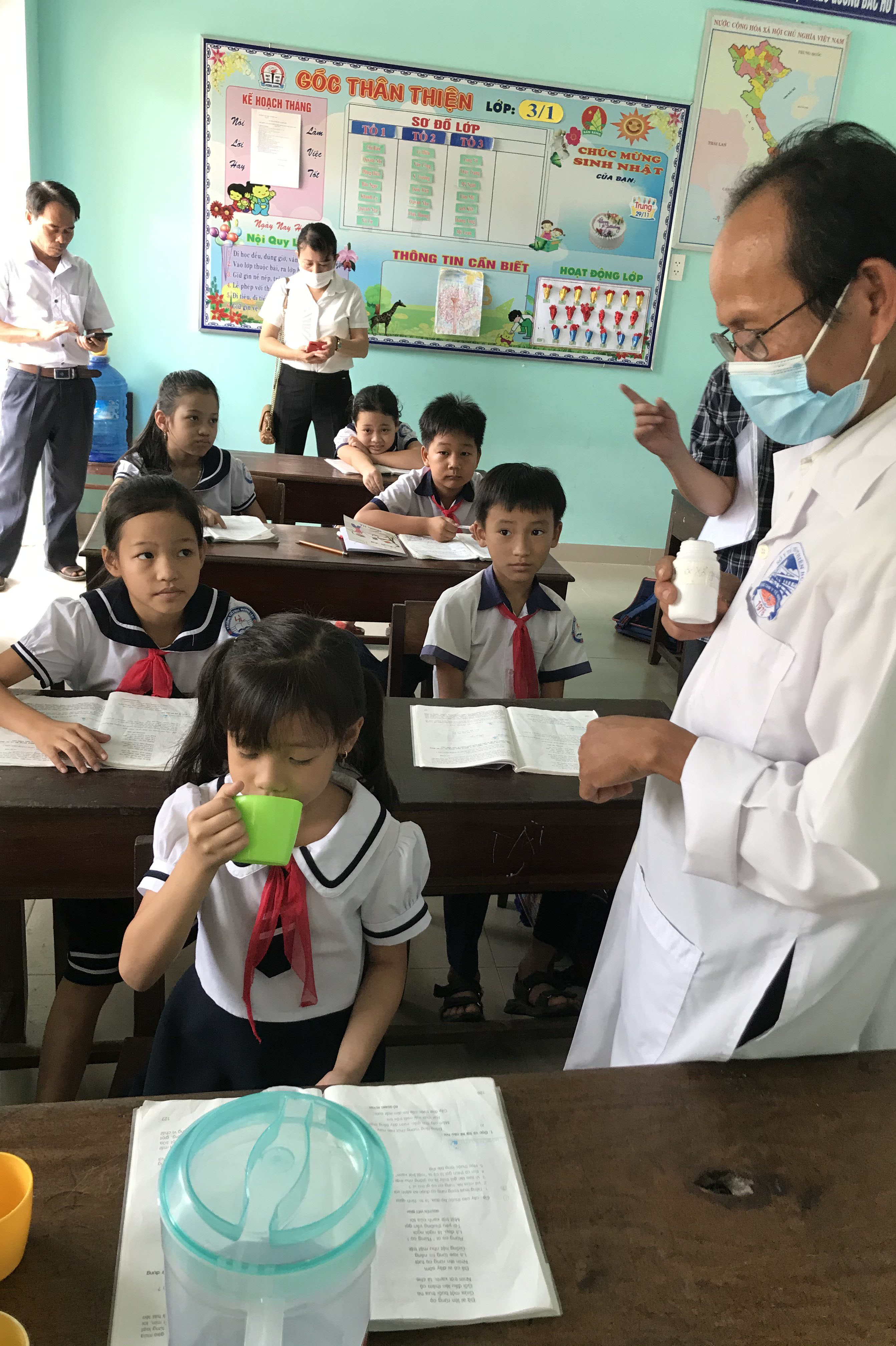 Các em học sinh đang uống thuốc tẩy giun tại trường tiểu học Phú Hòa