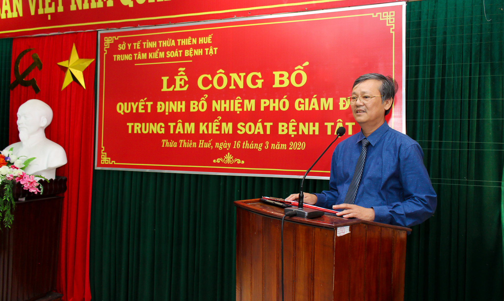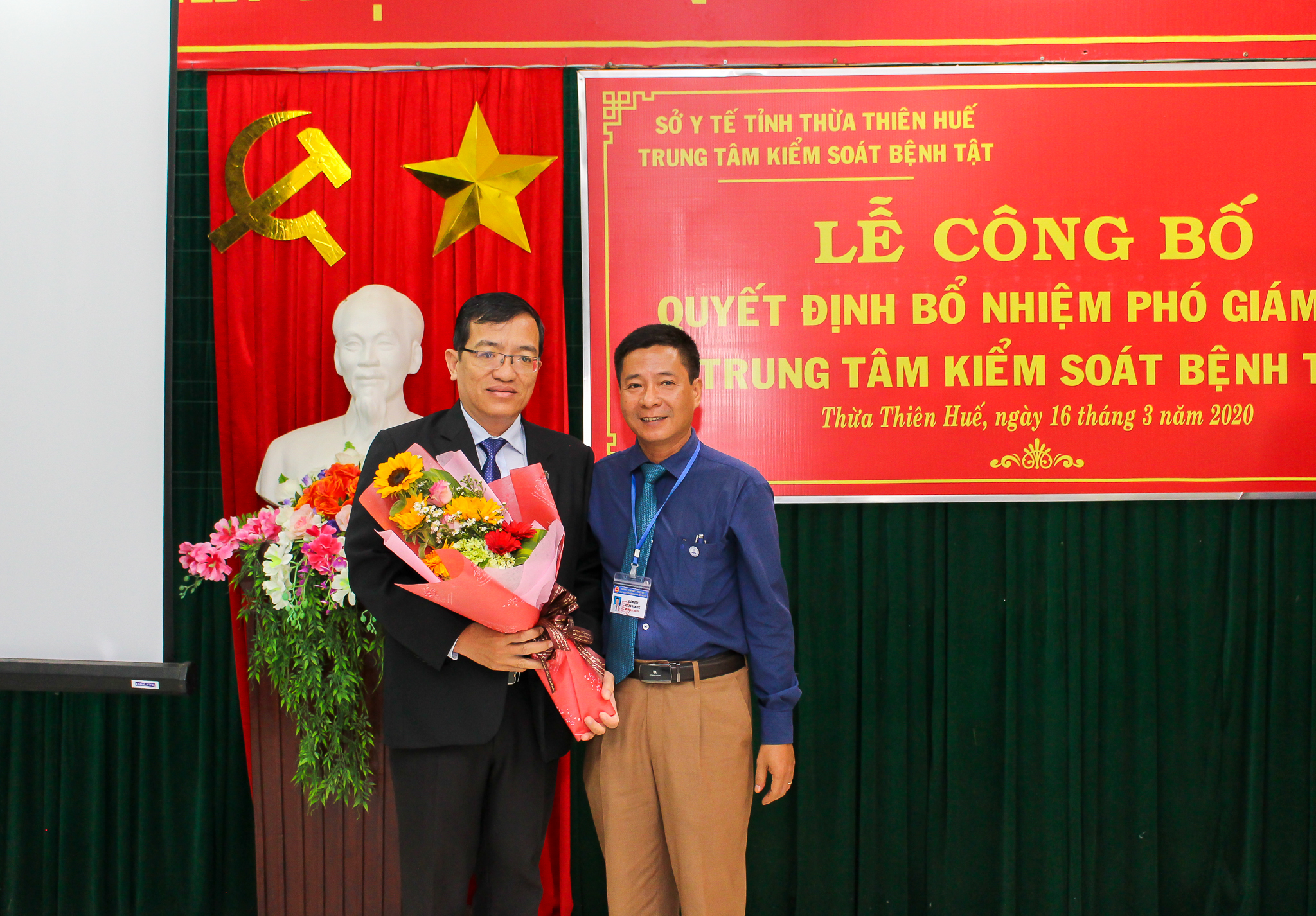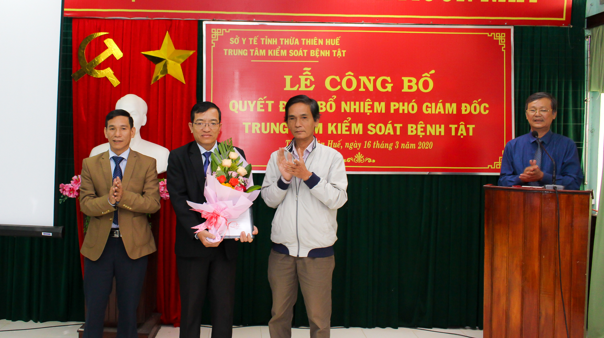 Sáng ngày 16 tháng 3 năm 2020, Trung tâm Kiểm soát bệnh tật tỉnh đã long trọng tổ chức Lễ công bố Quyết định của Sở Y tế tỉnh Thừa Thiên Huế về việc bổ nhiệm Phó Giám đốc Trung tâm Kiểm soát bệnh tật tỉnh Thừa Thiên Huế. Tham dự buổi lễ có Ths.BS Hoàng Hữu Nam - Phó Giám đốc Sở Y tế, DS Lê Viết Bắc - Phó Giám đốc Sở Y tế tỉnh Thừa Thiên Huế, BSCKII Nguyễn Đắc Ngọc - Trưởng phòng Tổ chức cán bộ Sở Y tế cùng Ban giám đốc và các trưởng phó khoa, phòng, tập thể cán bộ, viên chức Trung tâm Kiểm soát bệnh tật tỉnh.