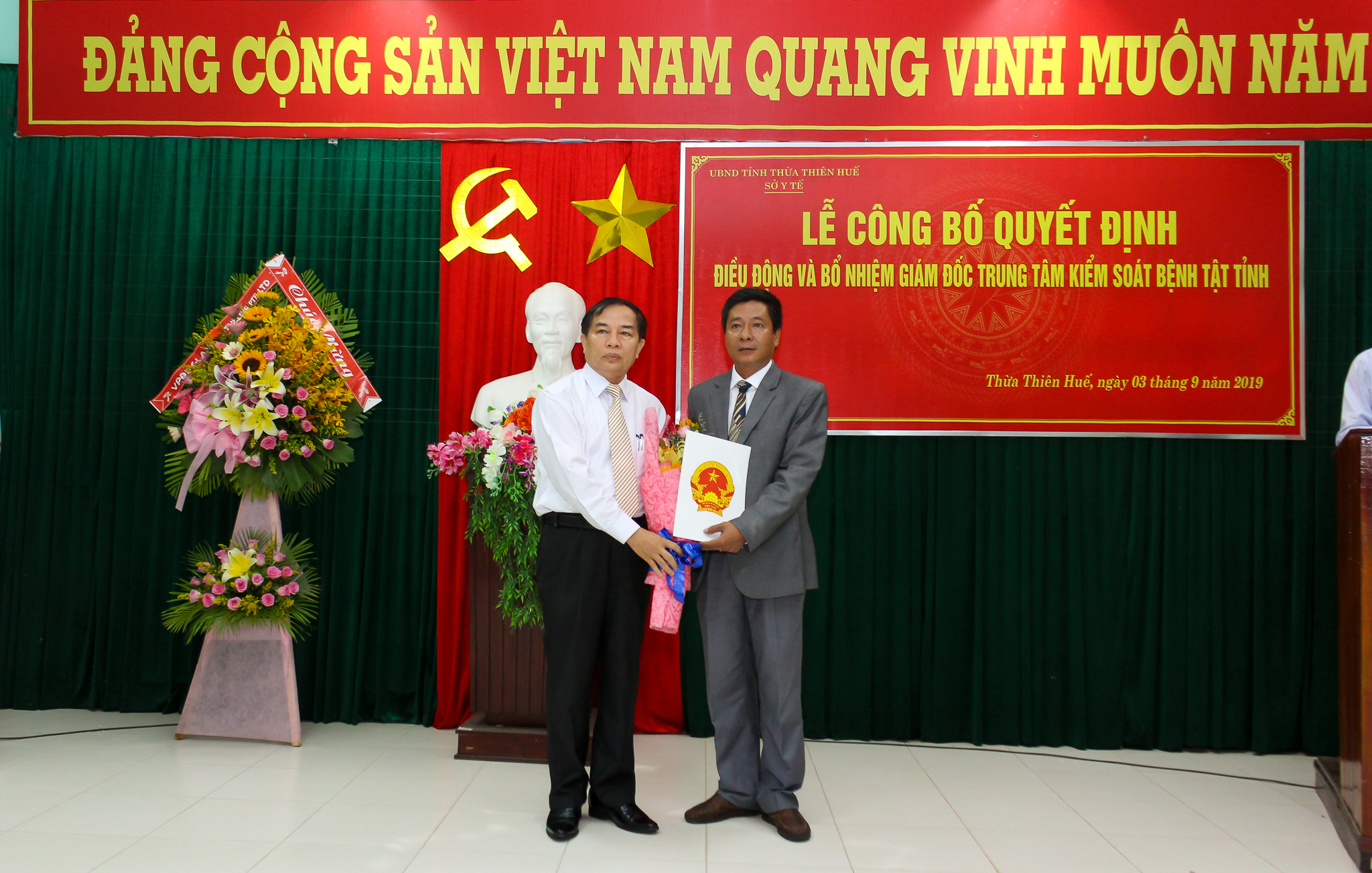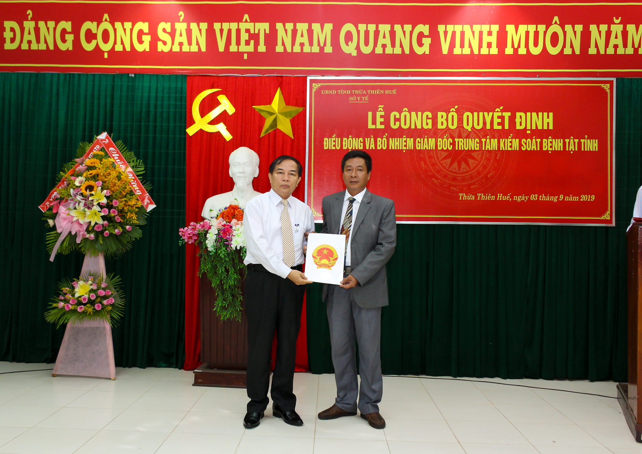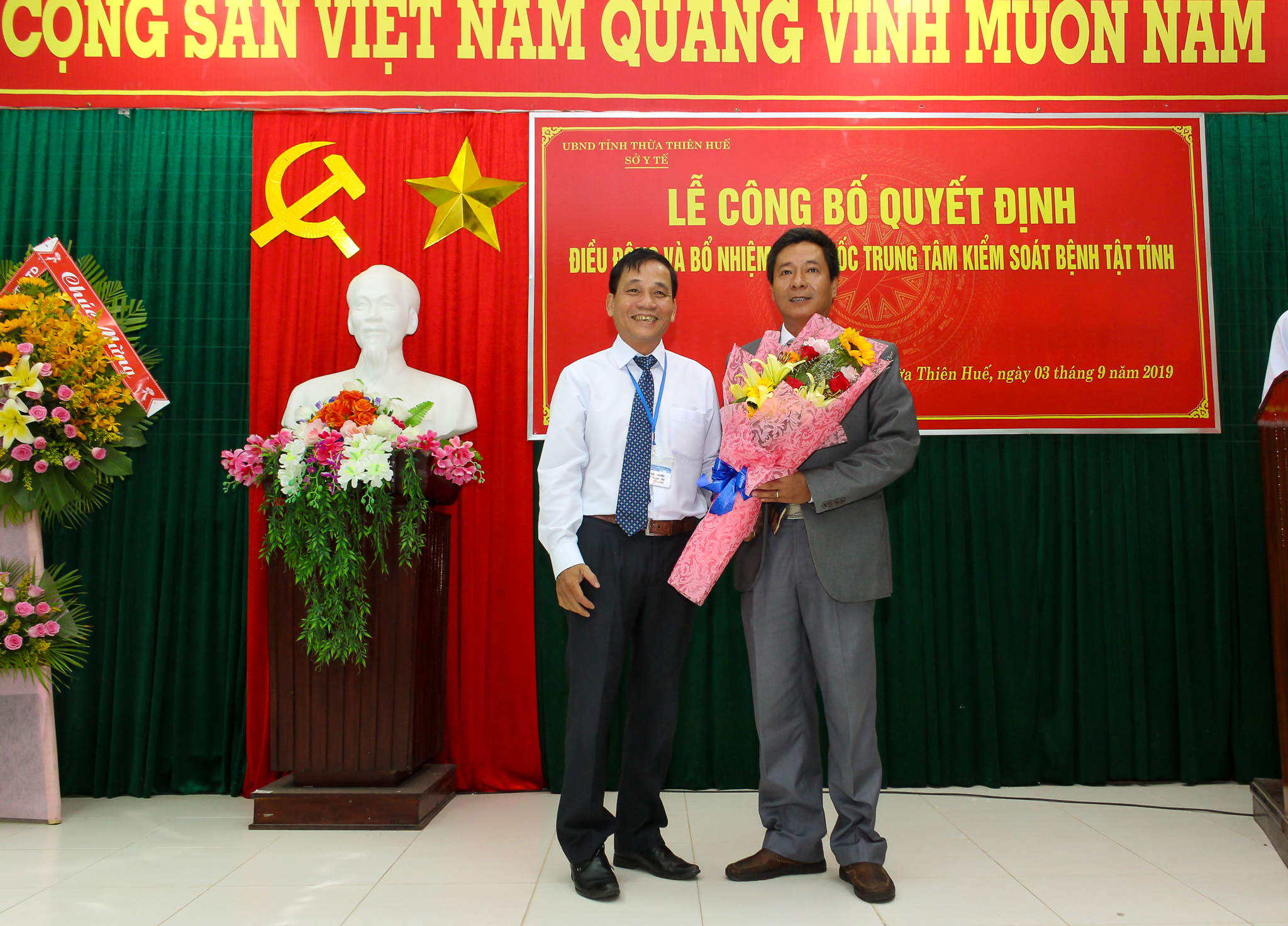 Sáng ngày 03 tháng 9 năm 2019, Sở Y tế tỉnh Thừa Thiên Huế đã long trọng tổ chức Lễ công bố Quyết định của UBND tỉnh Thừa Thiên Huế về việc điều động và bổ nhiệm Giám đốc Trung tâm Kiểm soát bệnh tật tỉnh Thừa Thiên Huế. Tham dự buổi lễ có TS.BS Nguyễn Nam Hùng - TUV, Bí thư Đảng ủy, Giám đốc Sở Y tế tỉnh Thừa Thiên Huế, BSCKII Nguyễn Đắc Ngọc - Trưởng phòng Tổ chức cán bộ Sở Y tế cùng Ban giám đốc và các trưởng phó khoa, phòng, tập thể cán bộ, viên chức Trung tâm Kiểm soát bệnh tật tỉnh.