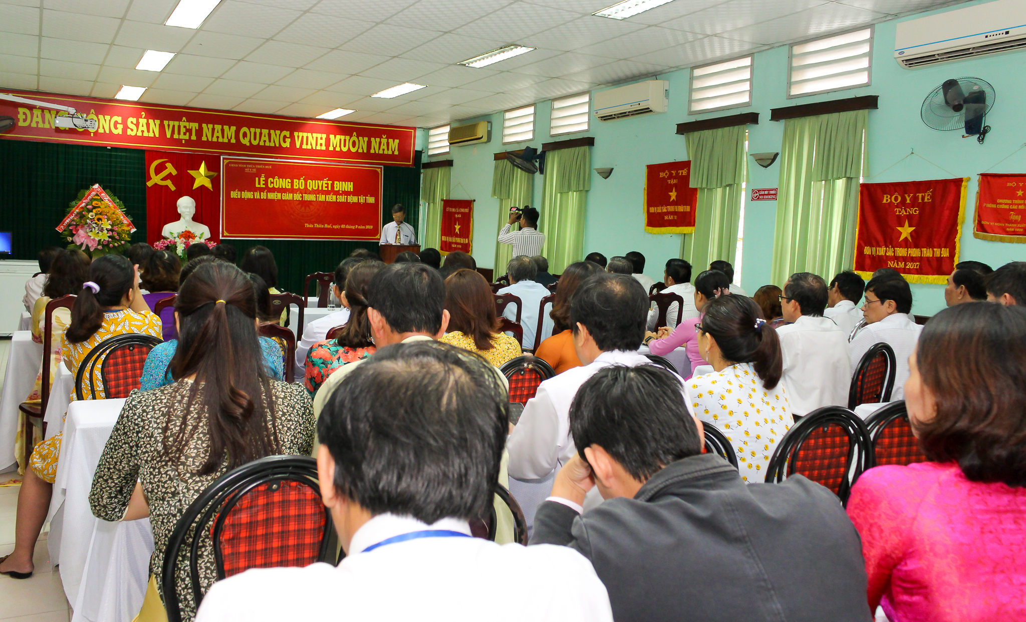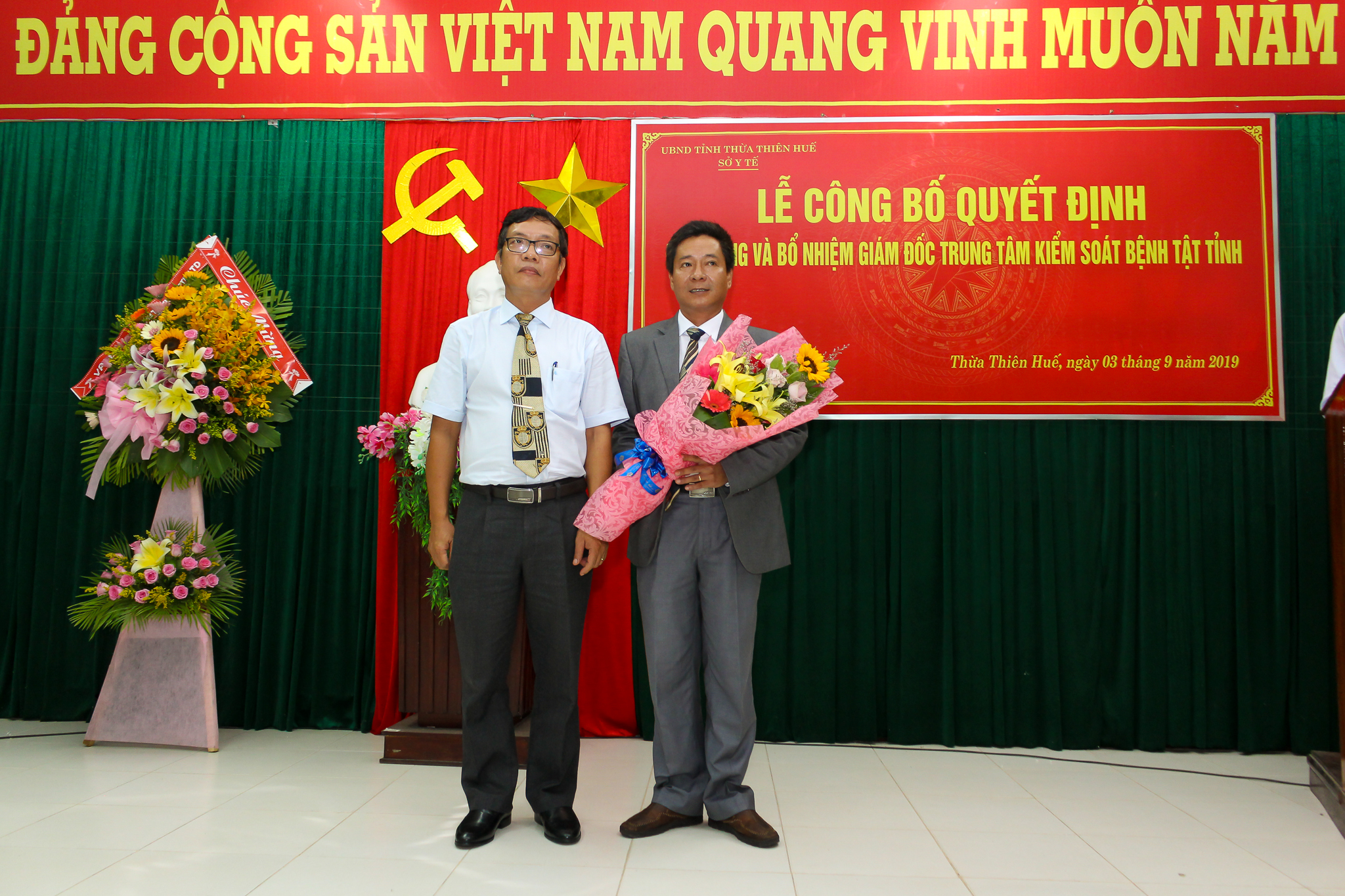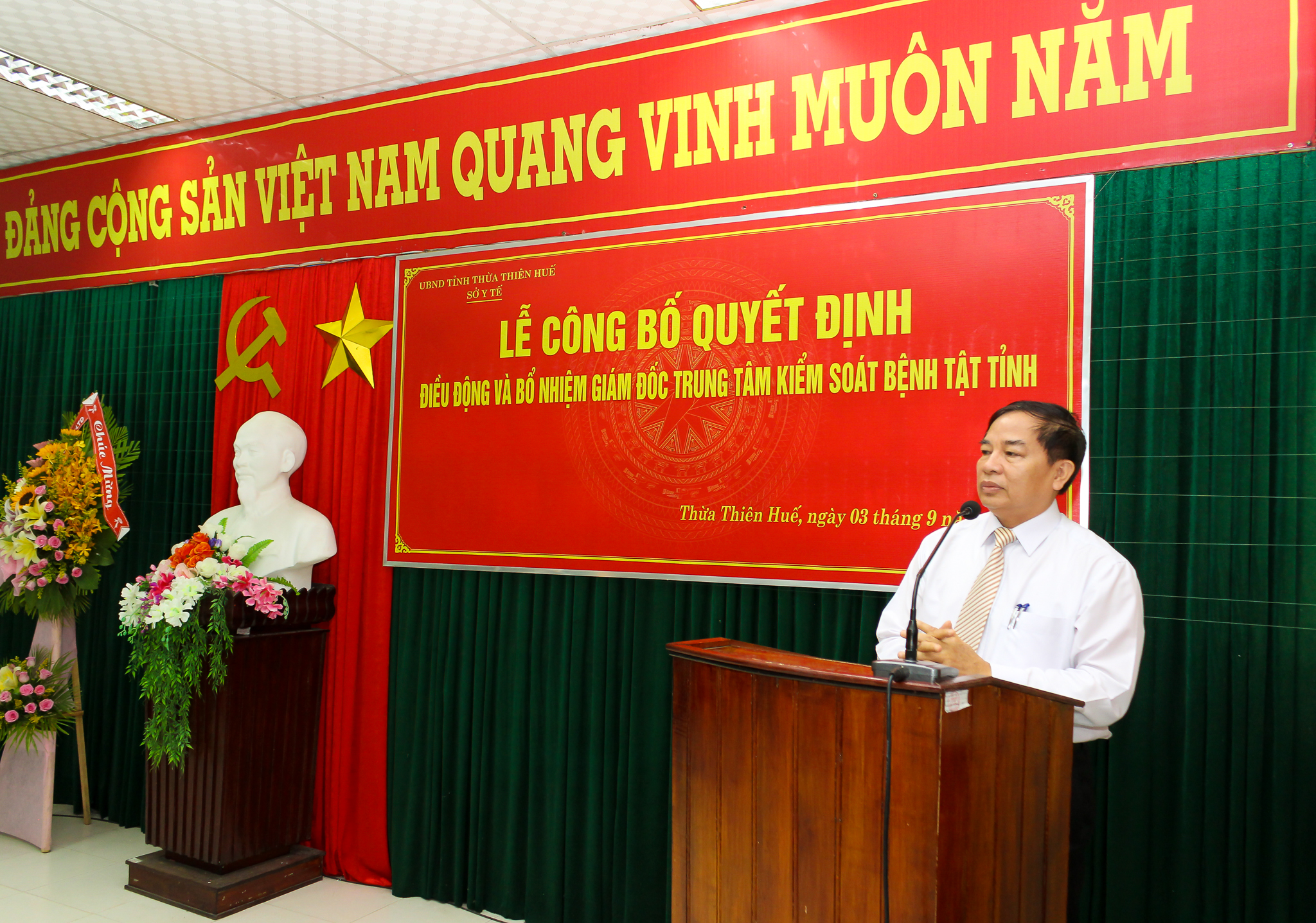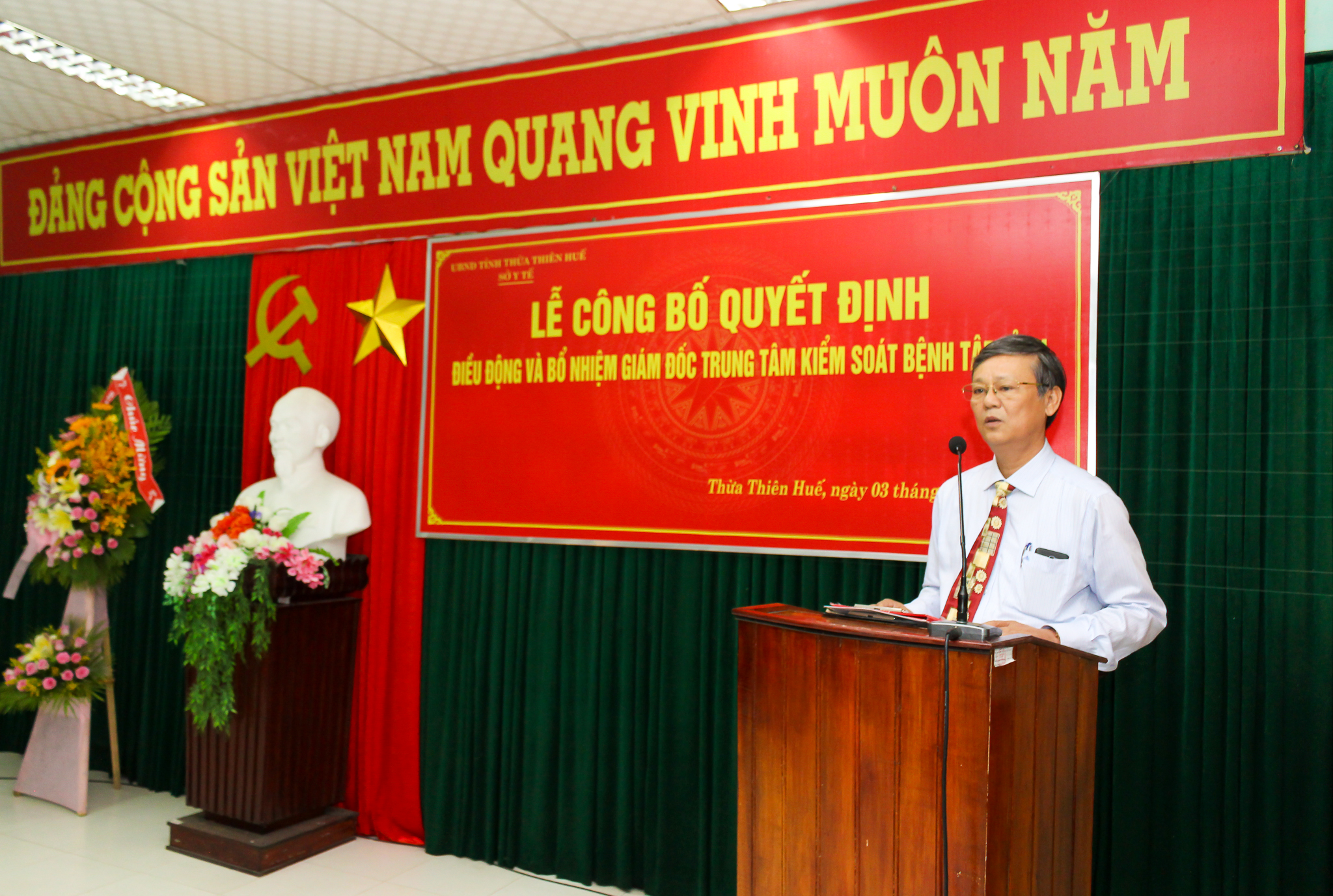 Sáng ngày 03 tháng 9 năm 2019, Sở Y tế tỉnh Thừa Thiên Huế đã long trọng tổ chức Lễ công bố Quyết định của UBND tỉnh Thừa Thiên Huế về việc điều động và bổ nhiệm Giám đốc Trung tâm Kiểm soát bệnh tật tỉnh Thừa Thiên Huế. Tham dự buổi lễ có TS.BS Nguyễn Nam Hùng - TUV, Bí thư Đảng ủy, Giám đốc Sở Y tế tỉnh Thừa Thiên Huế, BSCKII Nguyễn Đắc Ngọc - Trưởng phòng Tổ chức cán bộ Sở Y tế cùng Ban giám đốc và các trưởng phó khoa, phòng, tập thể cán bộ, viên chức Trung tâm Kiểm soát bệnh tật tỉnh.
