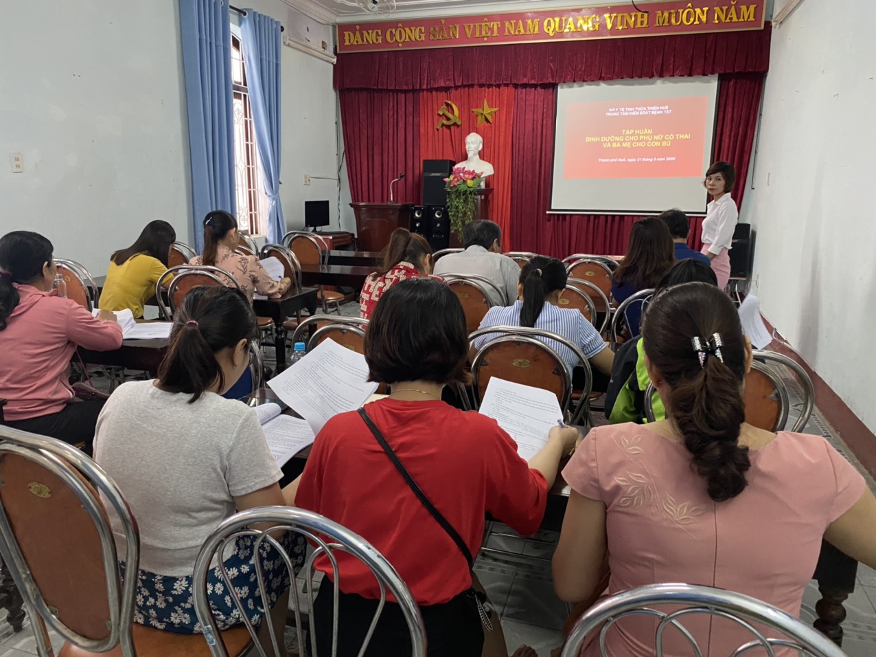Từ ngày 10 đến 21/9/2020, Thực hiện Kế hoạch của Trung tâm Kiểm soát bệnh tật về công tác Chăm sóc sức khỏe sinh sản tại tỉnh Thừa Thiên Huế năm 2020. Trung tâm Kiểm soát bệnh tật tỉnh đã tổ chức thực hiện tập huấn chuyên môn về nội dung Dinh dưỡng cho phụ nữ có thai và bà mẹ cho con bú cho 100 cán bộ y tế là các bác sỹ, nữ hộ sinh, điều dưỡng trong thực hiện công tác chăm sóc sức khỏe sinh sản trên địa bàn tỉnh.