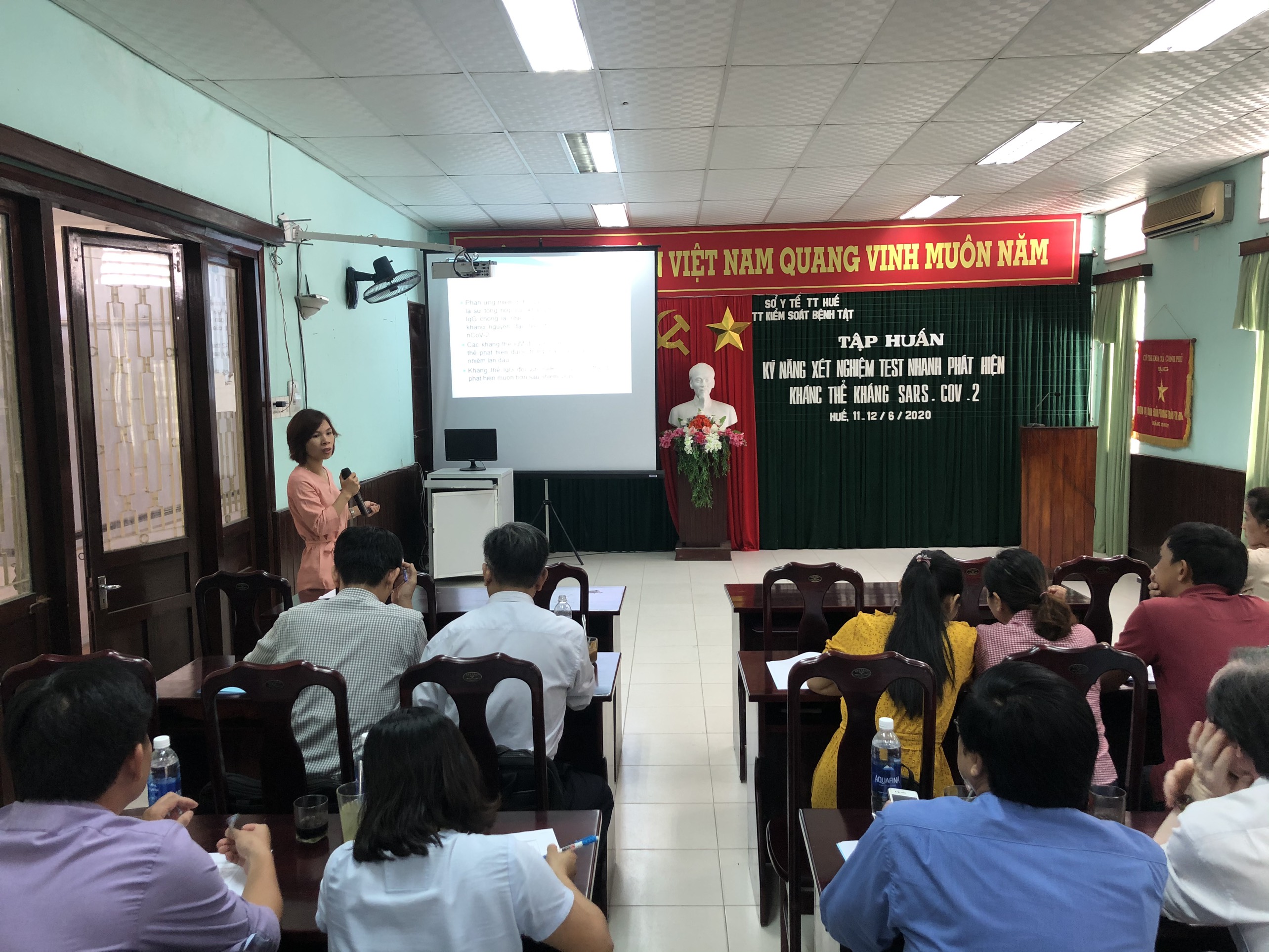 Trung tâm kiểm soát bệnh tật (CDC) tỉnh Thừa Thiên Huế tổ chức tập huấn kỹ thuật xét nghiệm test nhanh phát hiện kháng thể kháng SARS-CoV-2 cho cán bộ xét nghiệm của 9 Trung tâm y tế huyện, thị xã, thành phố và bệnh viện đa khoa, chuyên khoa trên địa bàn tỉnh