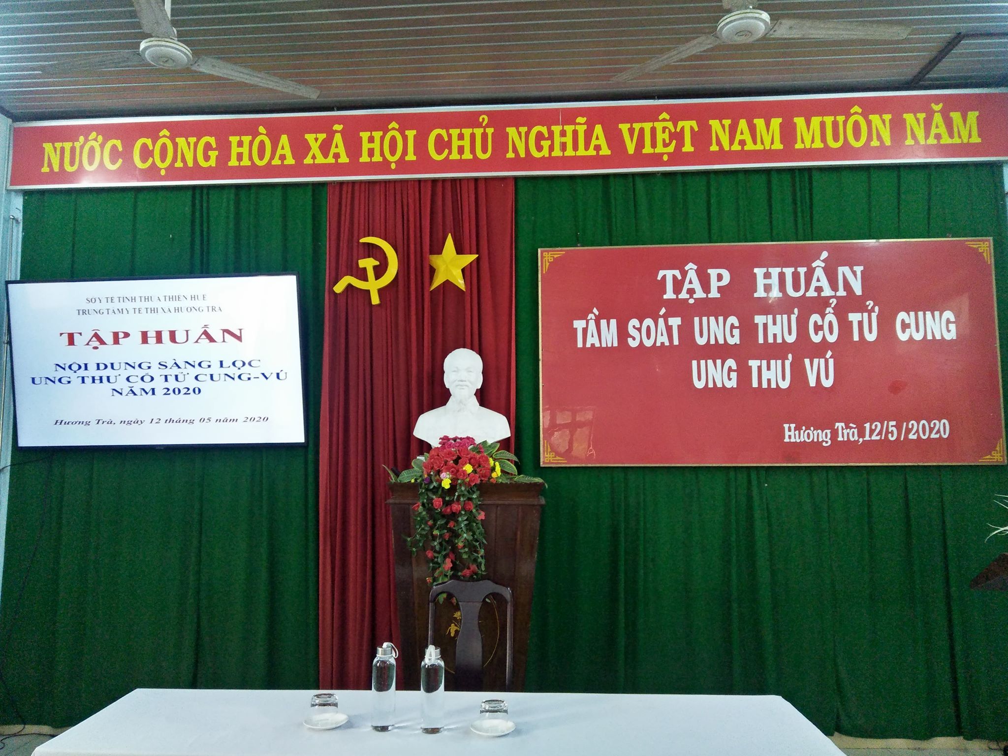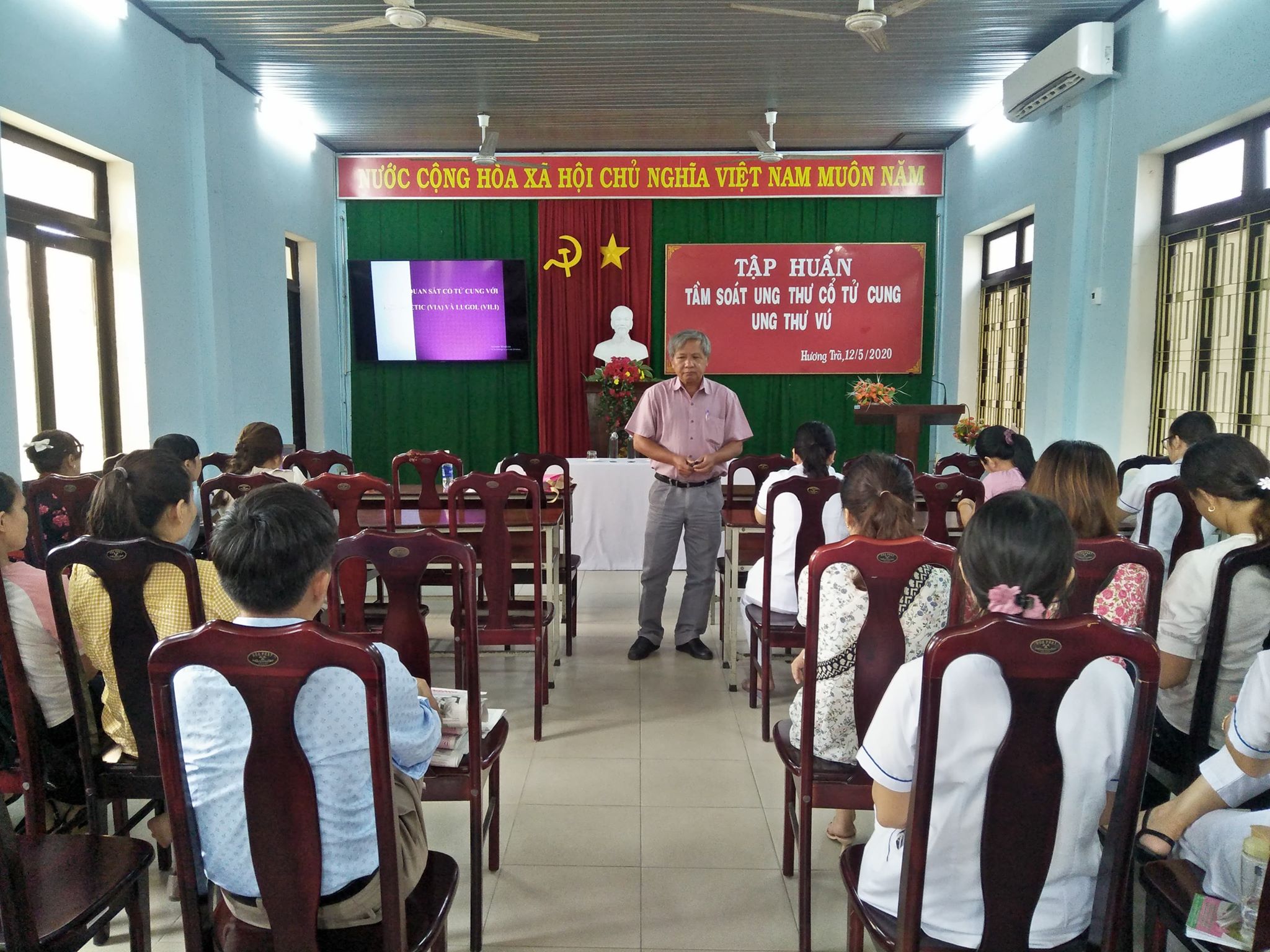 Ung thư cổ tử cung (UTCTC) là bệnh lý ác tính của biểu mô lát hoặc biểu mô tuyến cổ tử cung, thường gặp từ độ tuổi 30 trở đi, đứng hàng thứ hai trong các ung thư sinh dục ở nữ giới về tỷ lệ mắc cũng như tỷ lệ tử vong. Nhằm nâng cao năng lực và hệ thống qui trình chuyên môn cho cán bộ cung cấp dịch vụ Chăm sóc sức khỏe sinh sản tại tuyến tỉnh, huyện, xã, trong đó có nội dung khám sàng lọc ung thư cổ tử cung, ung thư vú tại 09 huyện/thị/thành phố trên địa bàn tỉnh Thừa Thiên Huế. Từ ngày 04 tháng 05 đến ngày 13 tháng 05 năm 2020, Trung tâm Kiểm soát bệnh tật (KSBT) tỉnh triển khai tổ chức 4 lớp tập huấn chuyên môn “Dự phòng và sàng lọc ung thư cổ tử cung- vú” tại trung tâm Y tế Thị xã Hương Thủy, Thị xã Hương Trà và Thành phố Huế.