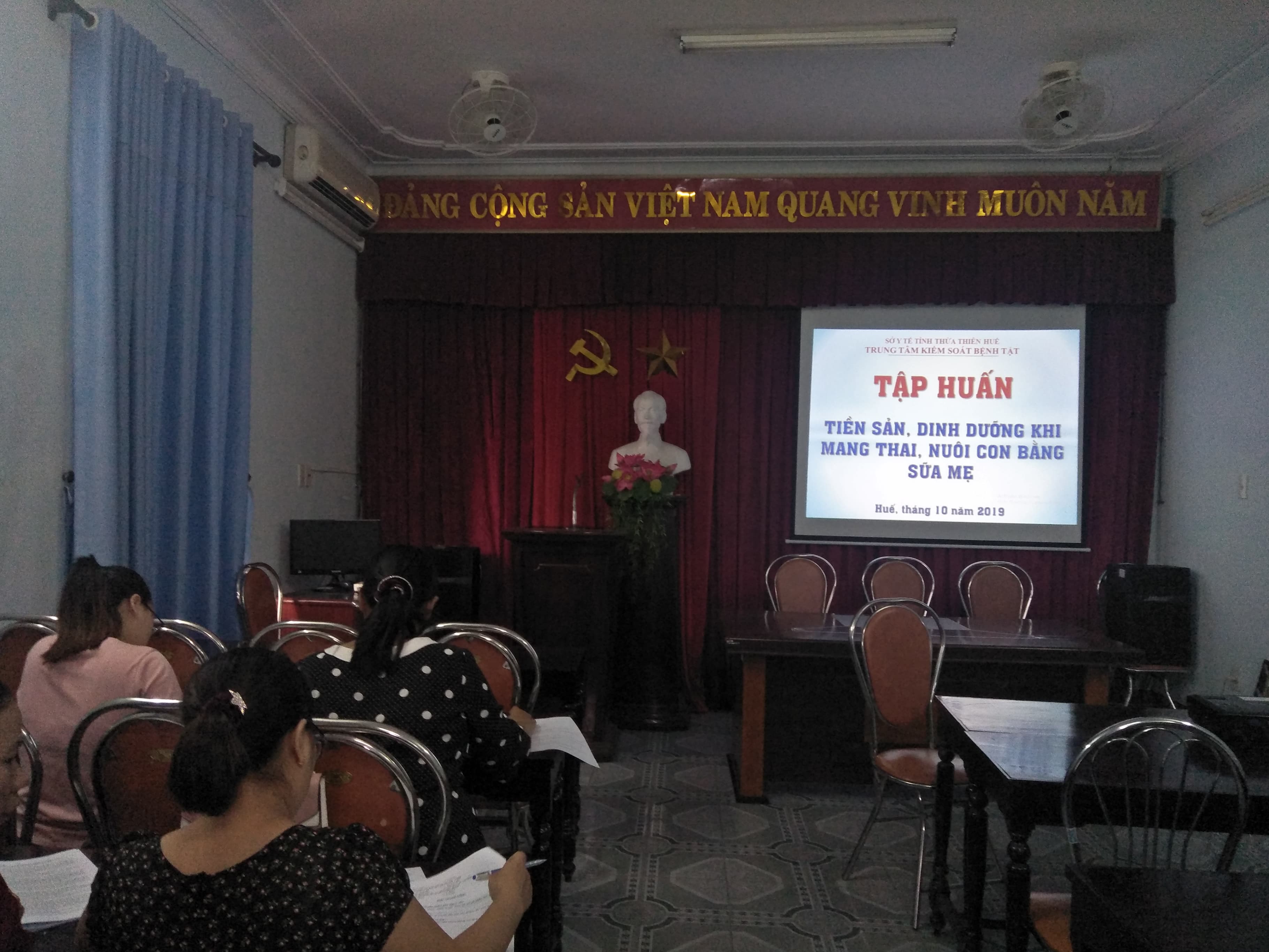 Thực hiện kế hoạch của trung tâm Kiểm soát bệnh tật về các hoạt động Chăm sóc sức khỏe sinh sản trên địa bàn tỉnh Thừa Thiên Huế năm 2019. Từ ngày 04/10 đến ngày 11/10/2019. Tại Hội trường Cơ sở 2 số 30 Lý Thường Kiệt, Trung tâm Kiểm soát bệnh tật tỉnh đã triển khai tập huấn nội dung "tiền sản, dinh dưỡng khi mang thai, nuôi con bằng sữa mẹ" cho 60 cán bộ là bác sĩ, nữ hộ sinh ở tuyến huyện/thị xã/thành phố và tuyến tỉnh, được chia làm 03 lớp, mỗi lớp được tổ chức 02 ngày.