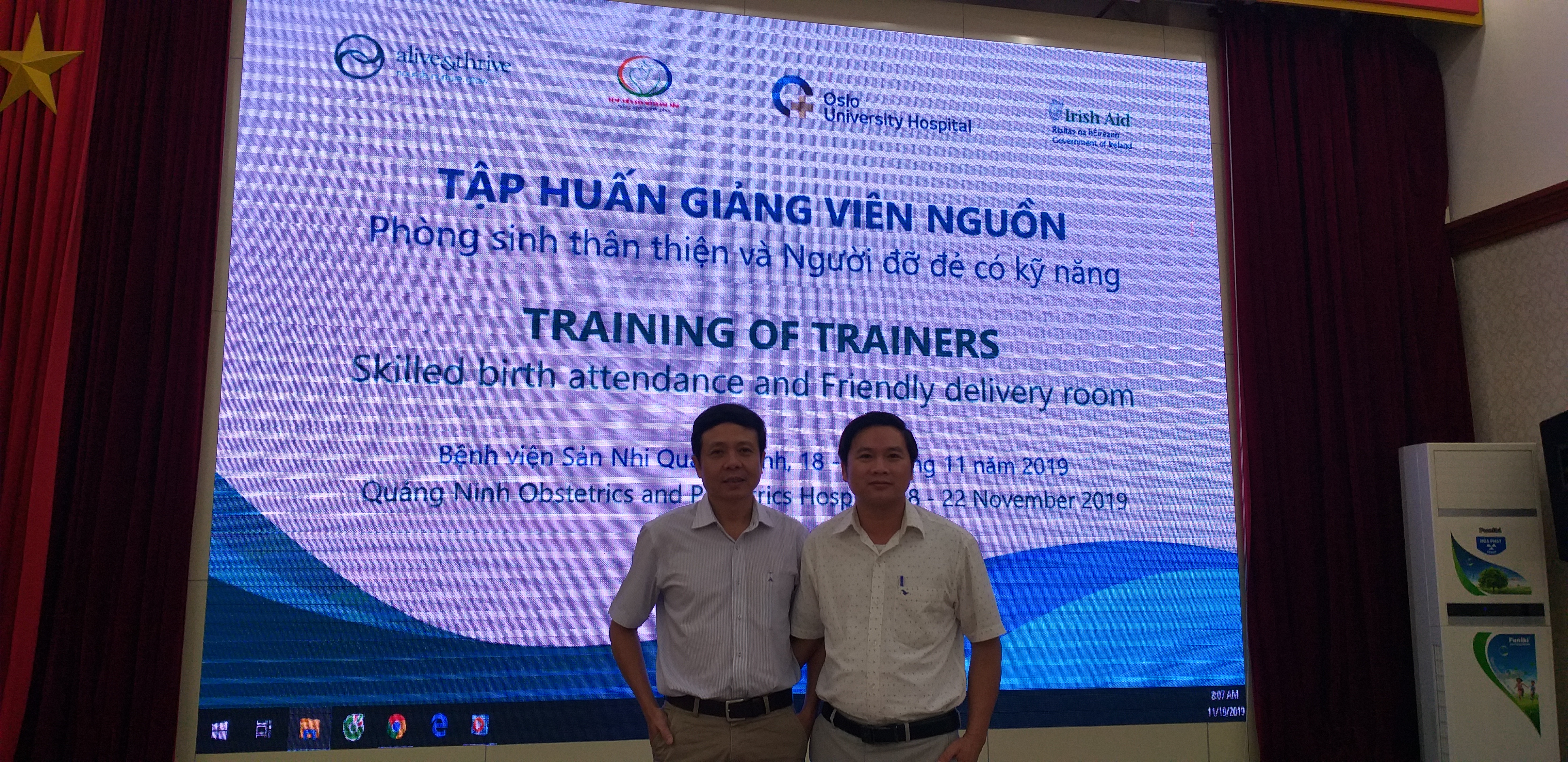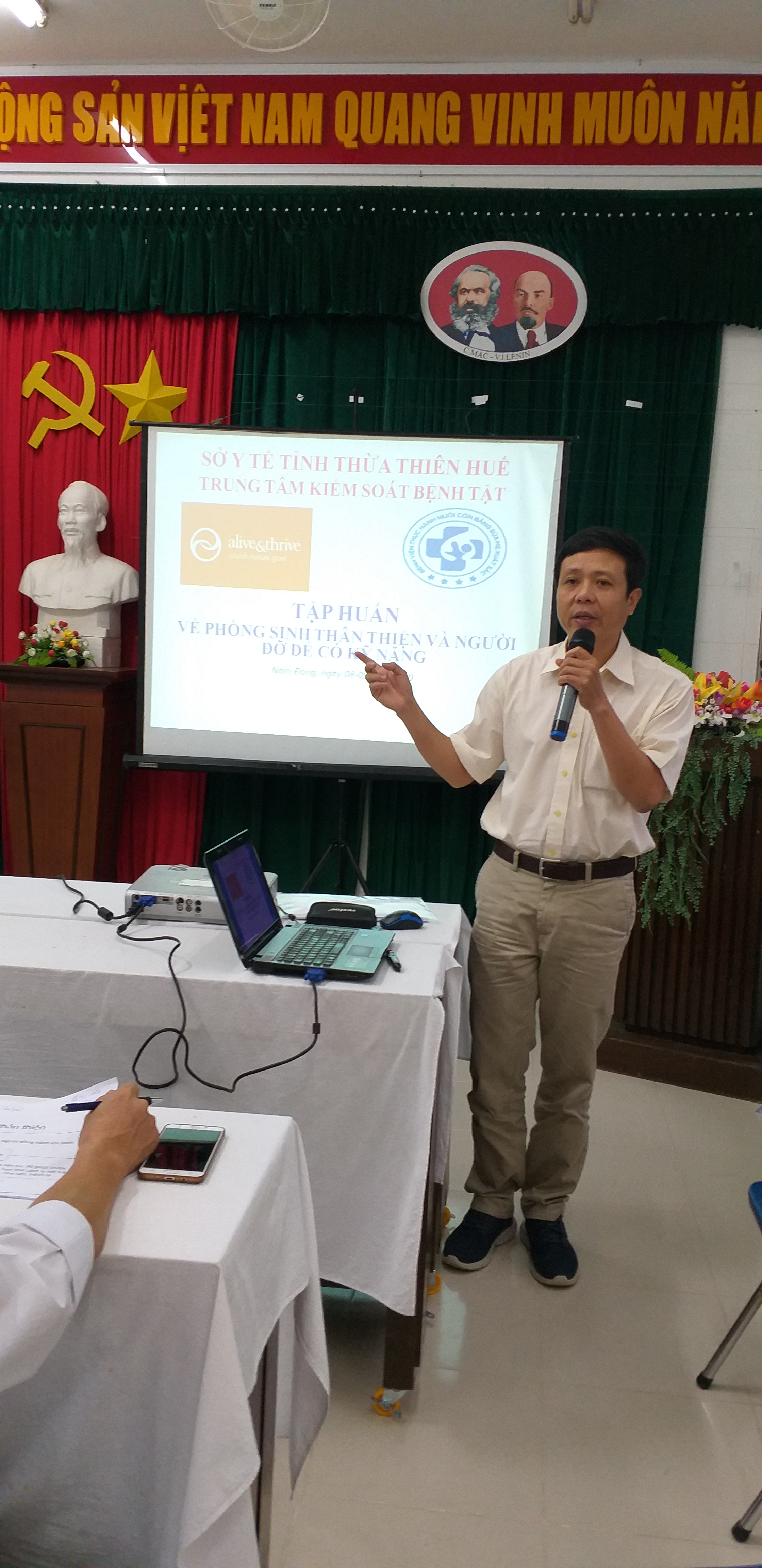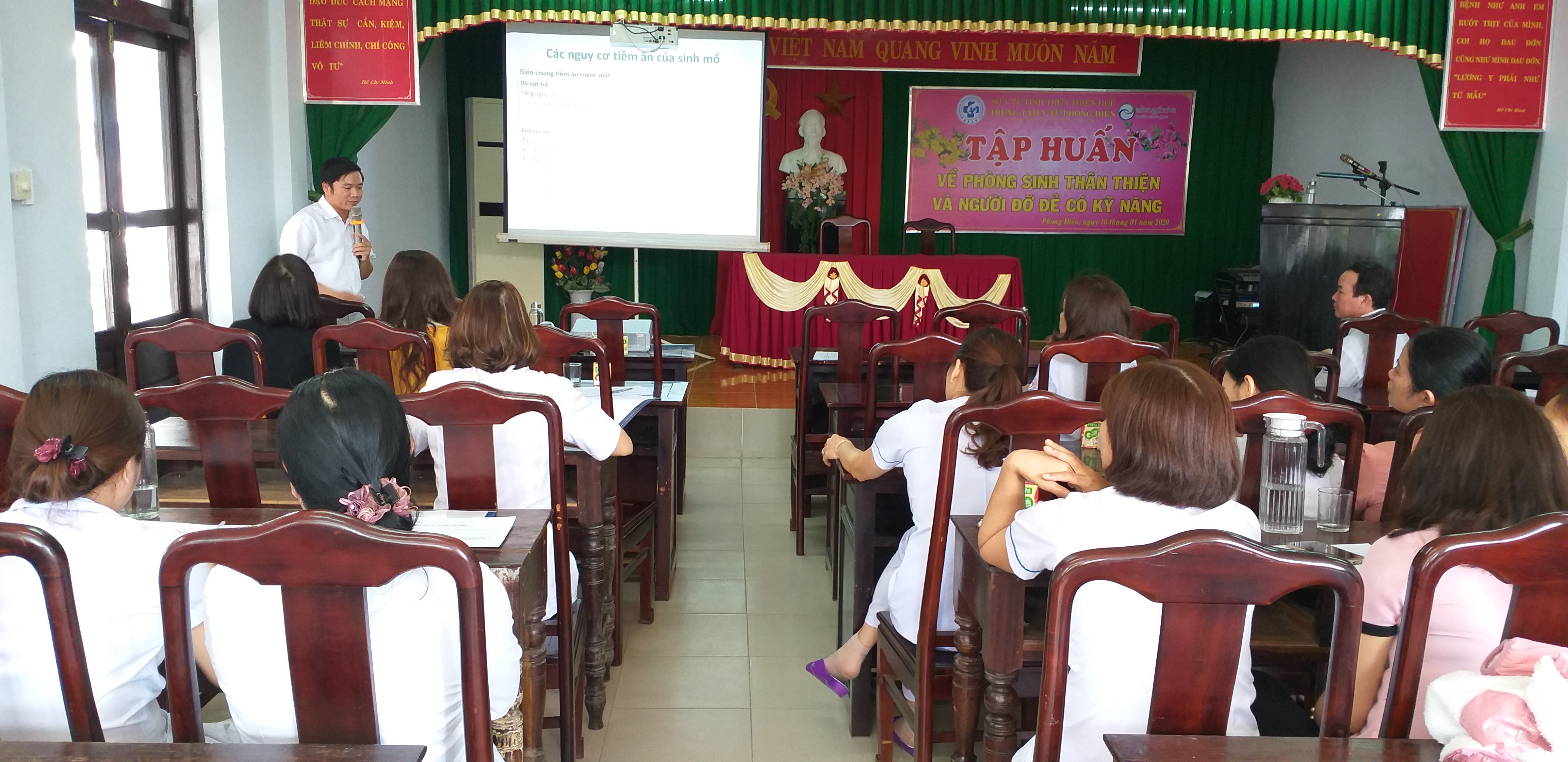 Được sự chỉ đạo của Vụ sức khỏe bà mẹ - Trẻ em, Bộ Y tế. Tổ chức FHI360 (Alive & Thrive) đã phối hợp với Trung tâm Kiểm soát bệnh tật (KSBT) tỉnh Thừa Thiên Huế mời cán bộ là bác sỹ của Trung tâm KSBT và Khoa CSSKSS của TTYT huyện Phú Vang để đào tạo Giảng viên nguồn tại Bệnh viện Sản Nhi Quảng Ninh về Phòng sinh thân thiện và NGười đỡ đẻ có kỹ năng, sau 05 ngày đào tạo Giảng viên đã có được những kiến thức cơ bản để về tổ chức tập huấn lại cho 03 Bệnh viện của TTYT huyện Nam Đông, Phong Điền, Quảng Điền. Từ ngày 08/01/2020 đến 17/01/2020 sẽ triển khai tập huấn xong 03 Bệnh viện (Nam Đông, Phong Điền, Quảng Điền), mỗi Bệnh viện có 20 học viên tham dự là bác sỹ, hộ sinh, điều dưỡng có liên quan đến việc chăm sóc sức khỏe bà mẹ trẻ em. Học viên nắm được nội dung Phòng sinh thân thiện (có người đồng hành khi sinh); việc cắt may tầng sinh môn có chỉ định; thống kê được phân loại Robson để góp phần hạn chế sinh mổ. Từ đó xây dựng quy trình chuyên môn trình cấp có thẩm quyền ban hành để đưa vào hoạt động có hiệu quả.