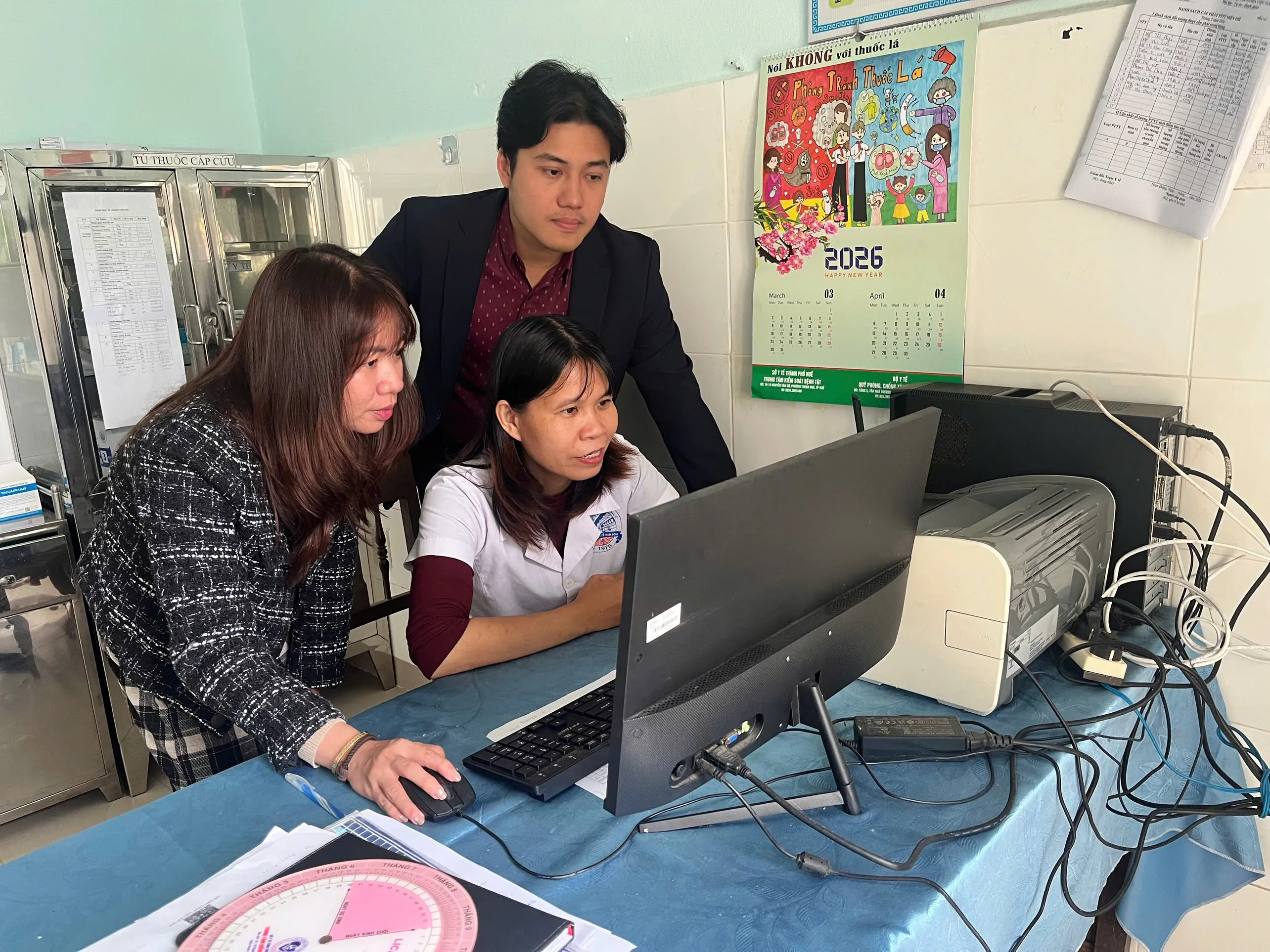 Đoàn trực tiếp hướng dẫn cán bộ chuyên trách xử lý các vấn đề khi sử dụng bộ công cụ đánh giá tình trạng dinh dưỡng