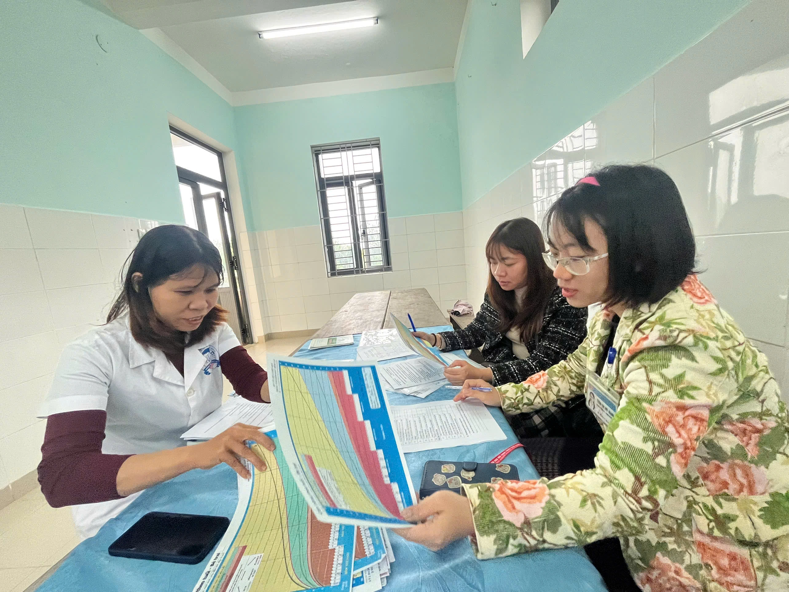 Đoàn kiểm tra biểu đồ tăng trưởng của trẻ bị SDD đang được quản lý trên địa bàn