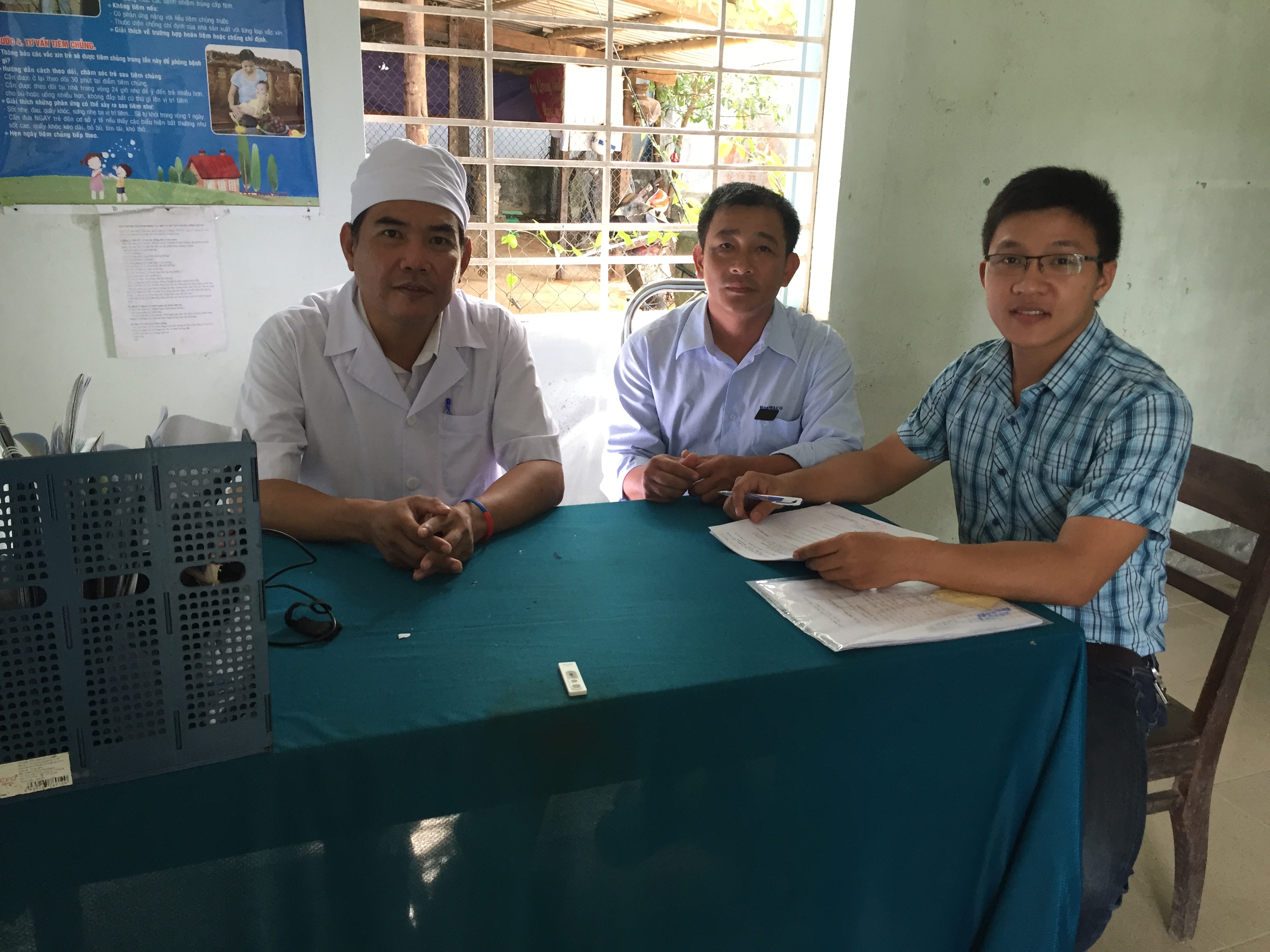 Cán bộ TT KSBT làm việc với nhân viên công ty nước HueWaCo phụ trách tại thị xã Hương Trà