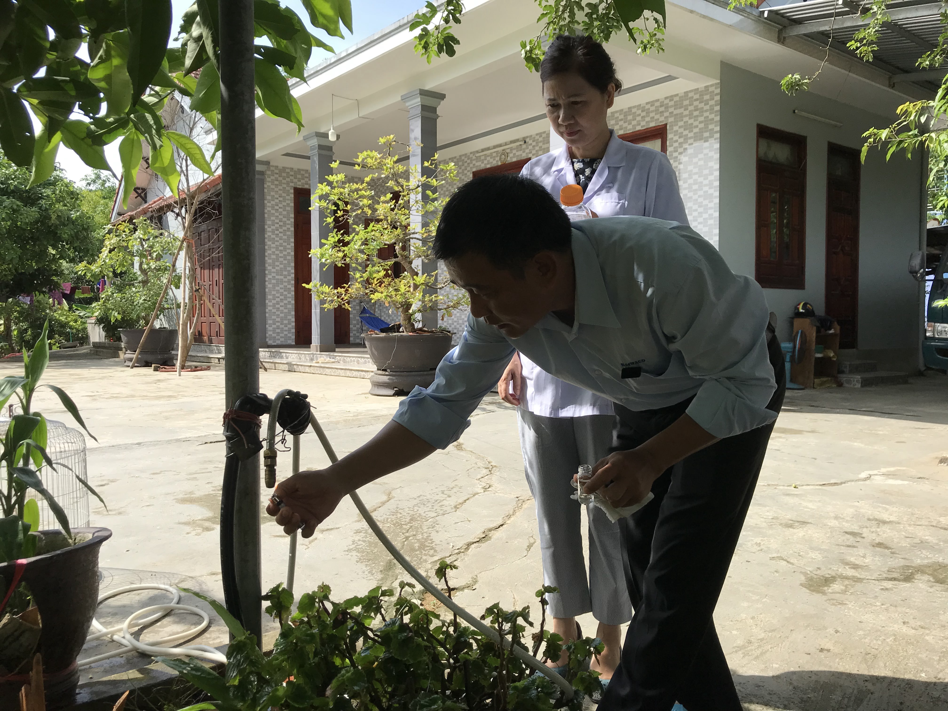 Nhân viên công ty HueWaCo cùng cán bộ TTKSBT kiểm tra chất lượng nước tại hộ gia đình ông Đỗ Xuân V., tại xã Hồng Tiến, thị xã Hương Trà