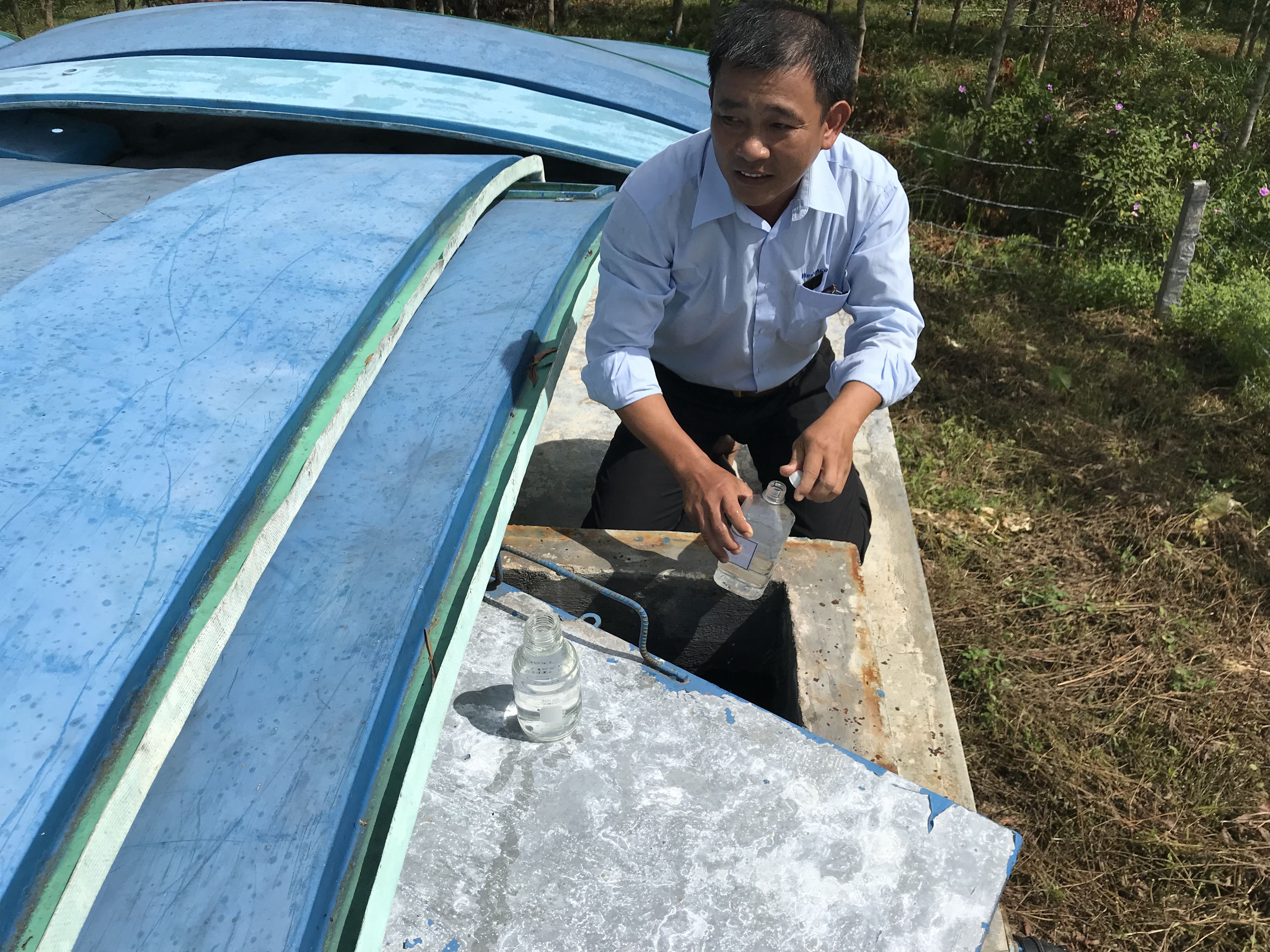 Lấy mẫu nước xét nghiệm tại bể chứa sau xử lý tại công trình nước tự chảy Hồng Tiến
