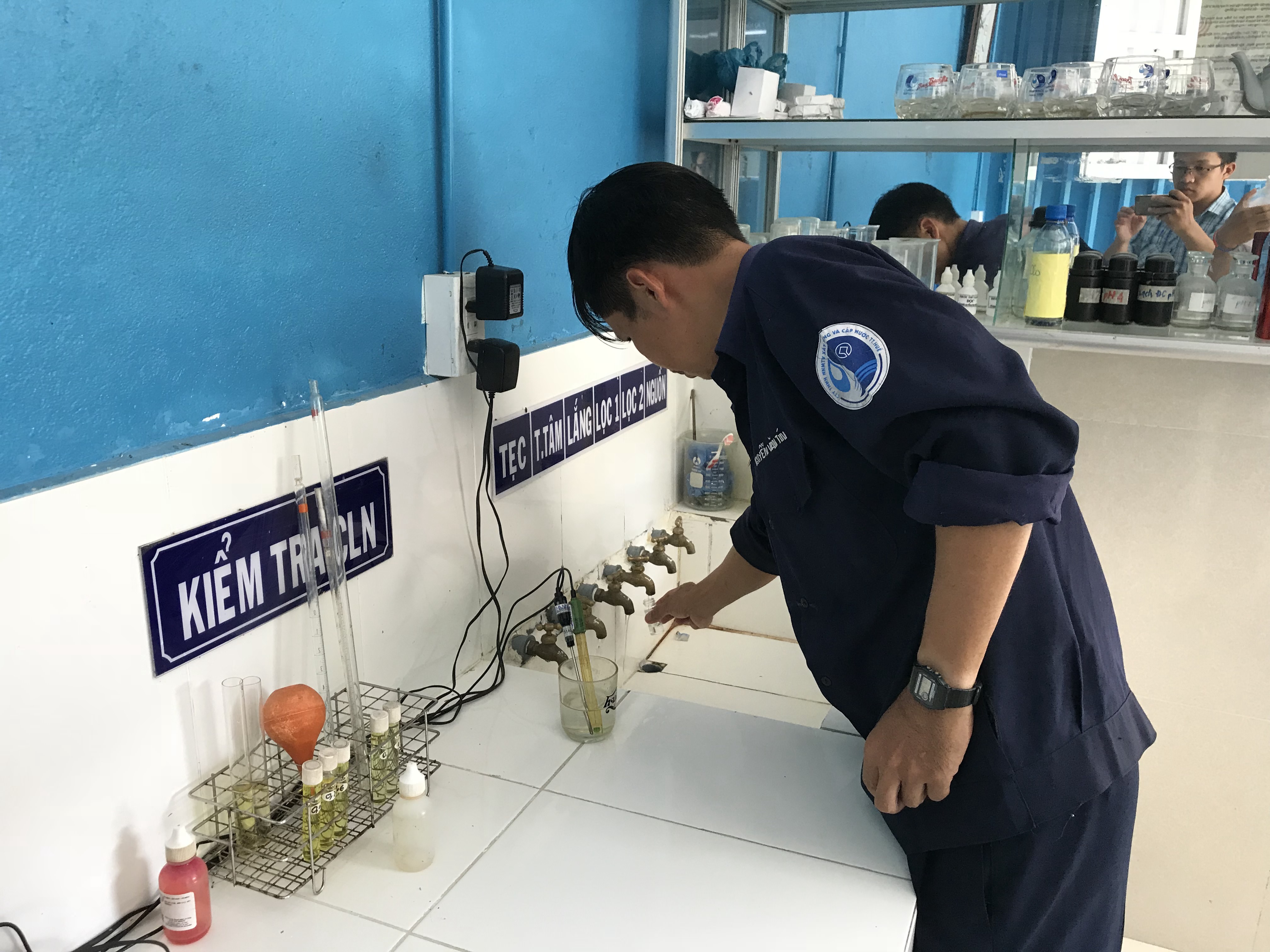 Cán bộ TTKSBT kiểm tra chất lượng nước tại Nhà máy nước sạch Bình Điền