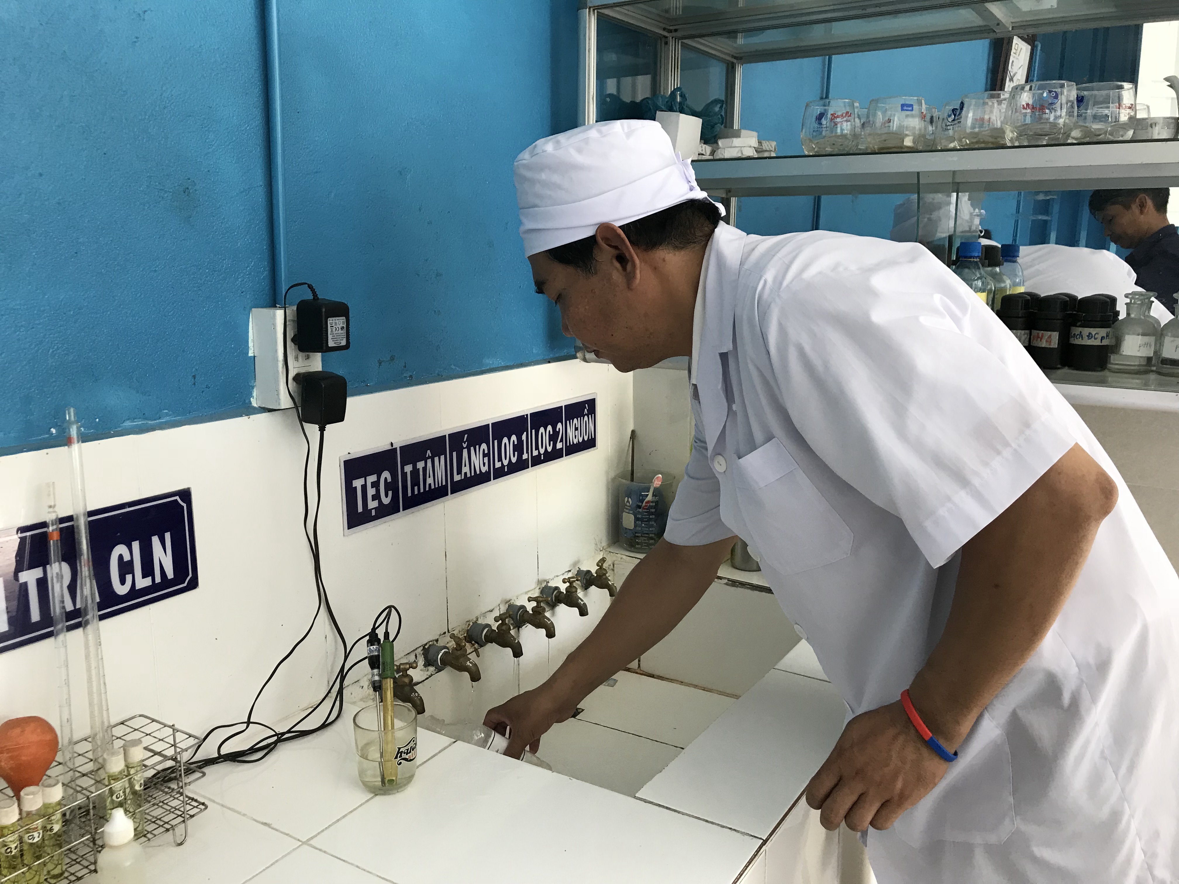 Nhân viên công ty HueWaCo kiểm tra chất lượng nước tại Nhà máy nước sạch Bình Điền