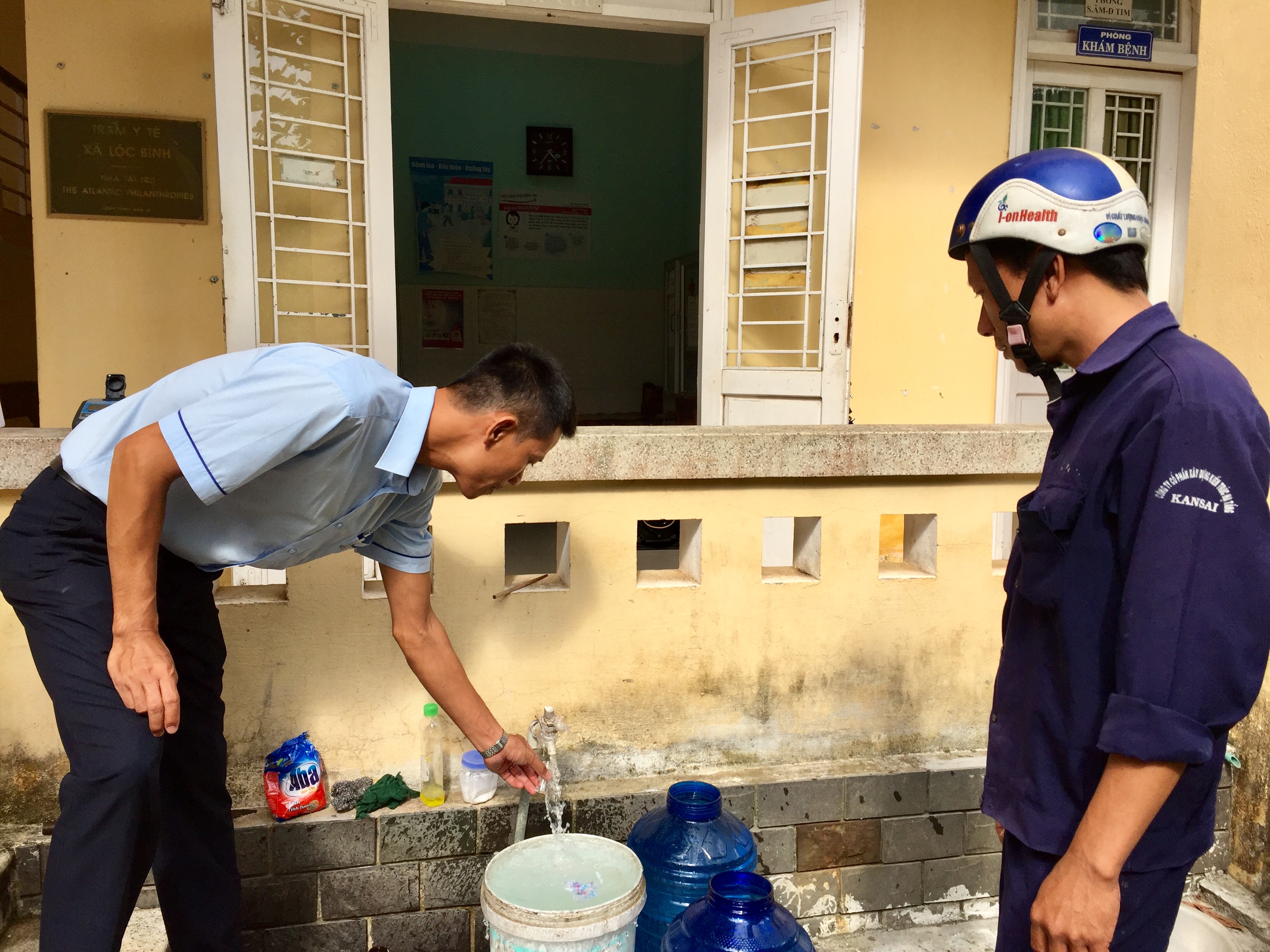 Nhân viên công ty HueWaCo phối hợp kiểm tra chất lượng nước tại trạm y tế Lộc Bình