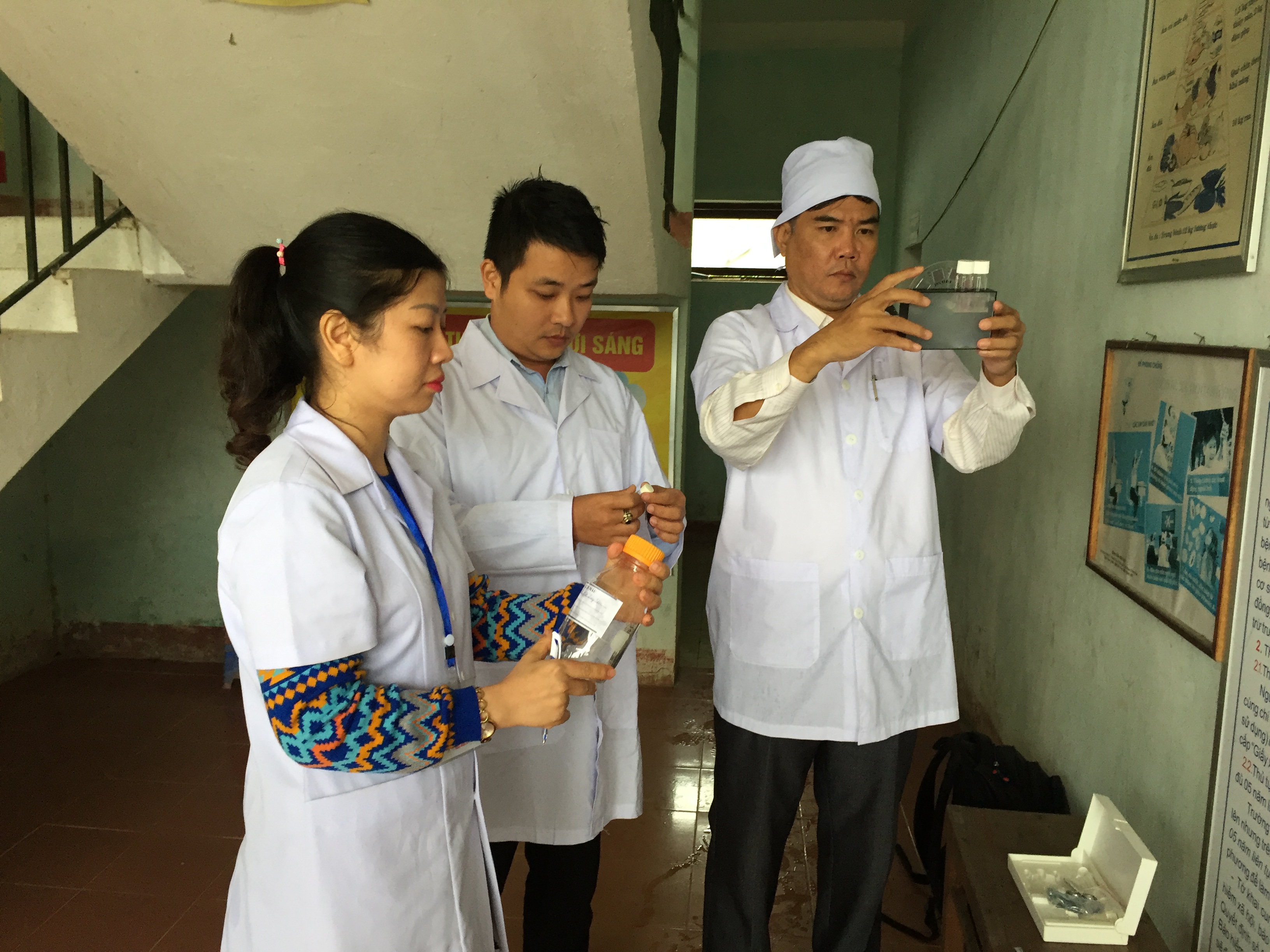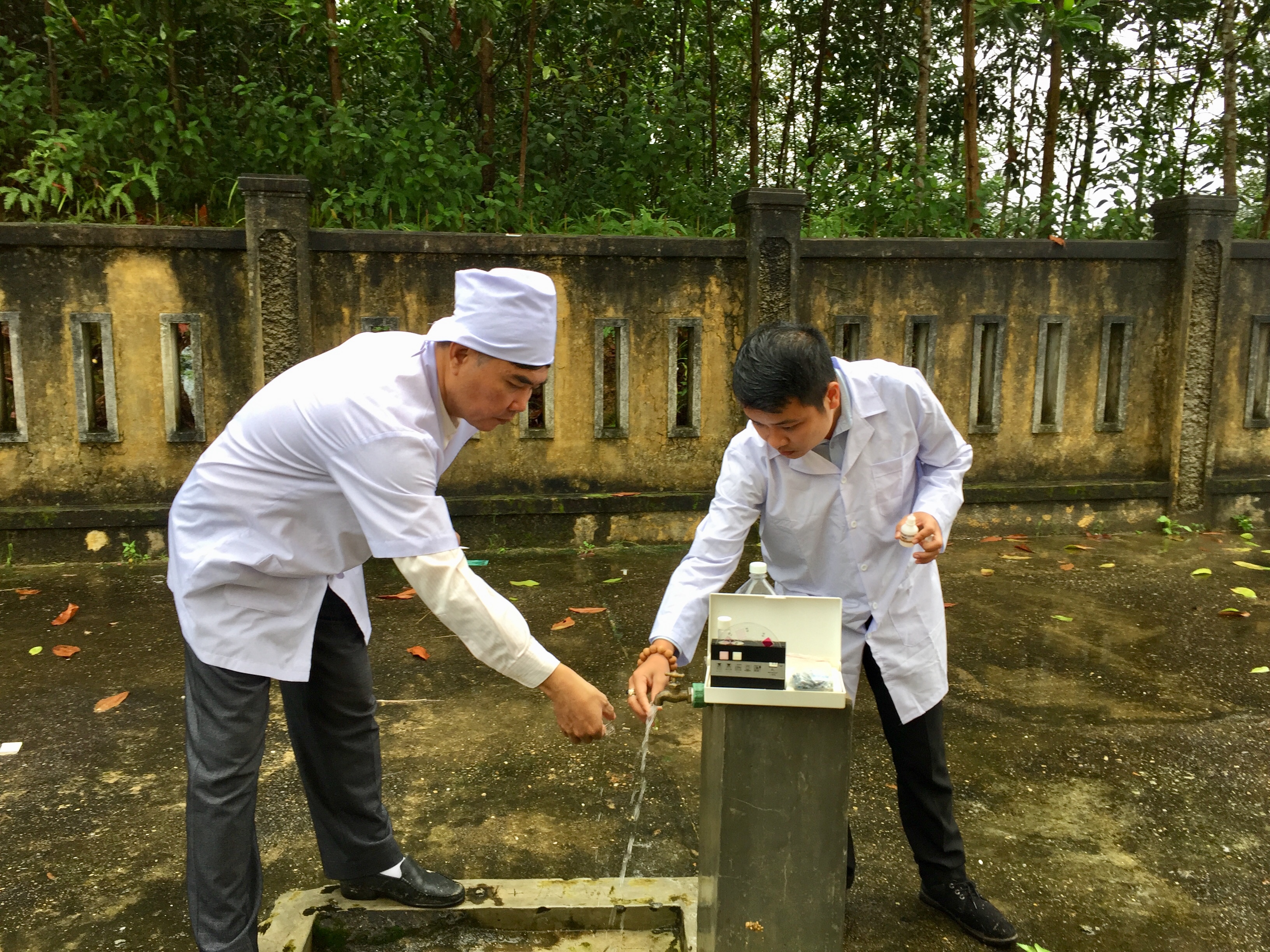 Nhân viên công ty HueWaCo cùng phối hợp kiểm tra vệ sinh chất lượng nước tại TYT A Roàng