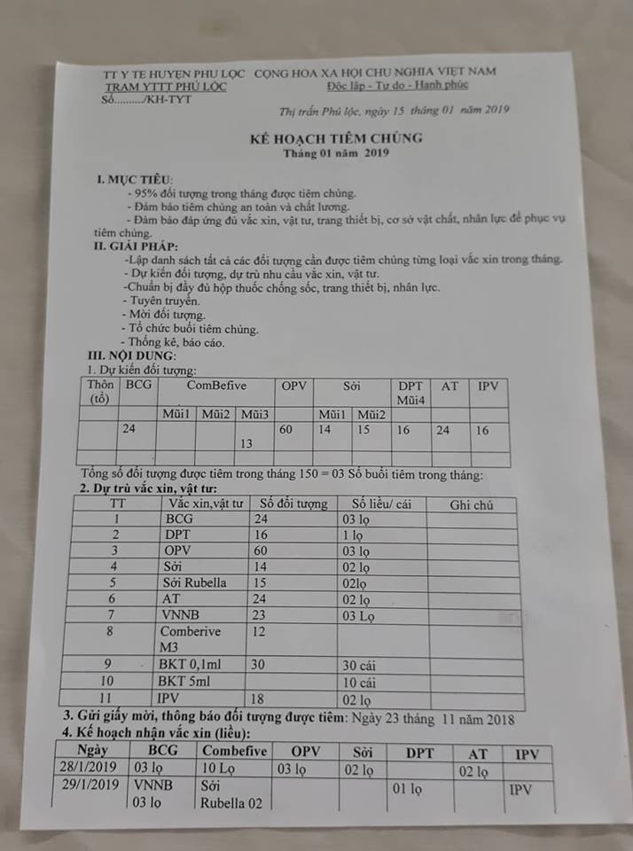 Ngày 28/01/2019 các Trạm y tế xã thuộc Phú Lộc tổ chức tiêm chủng thường xuyên theo lịch tiêm chủng. Trong buổi tiêm chủng, Đoàn giám sát Trung tâm Kiểm soát bệnh tật tỉnh kiểm tra, giám sát công tác tiêm chủng tại Trạm y tế các xã. Tất cả các bà mẹ đưa trẻ đến tiêm được y, bác sĩ tư vấn trước, trong và sau khi tiêm vắc xin ComBE Five. Đoàn đã kiểm tra, giám sát các cán bộ tiêm chủng của các Trạm về quy trình tiêm chủng, quy trình tư vấn, theo dõi phản ứng sau tiêm chủng, theo dõi trực tiếp nhân viên y tế tư vấn và thực hành tiêm chủng cho trẻ được tiêm vắc-xin ComBE Five. Phương án sẵn sàng xử trí cấp cứu cơ động tại các điểm tiêm chủng như hộp thuốc chống sốc, phác đồ điều trị sốc phản vệ.