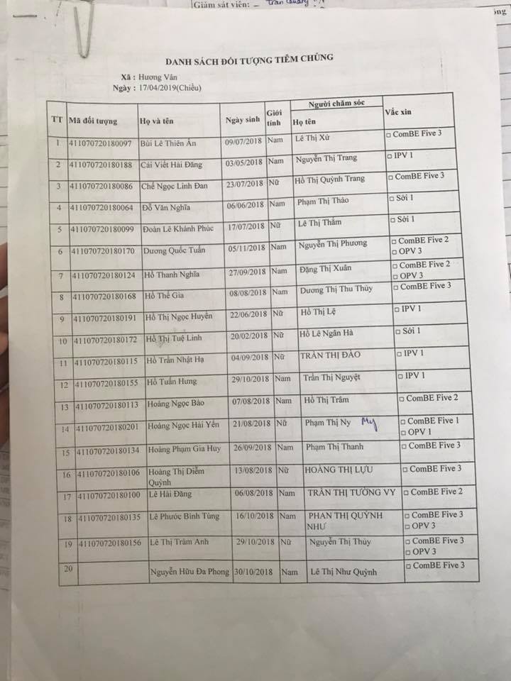 Thực hiện chỉ đạo của Sở Y tế, nhằm tăng cường an toàn và chất lượng trong tiêm chủng, ngày 17/4/2019, cán bộ Khoa Phòng, chống bệnh truyền nhiễm thực hiện giám sát buổi tiêm chủng thường xuyên tại các Trạm Y tế phường Hương Vân, phường Hương Văn thuộc thị xã Hương Trà.