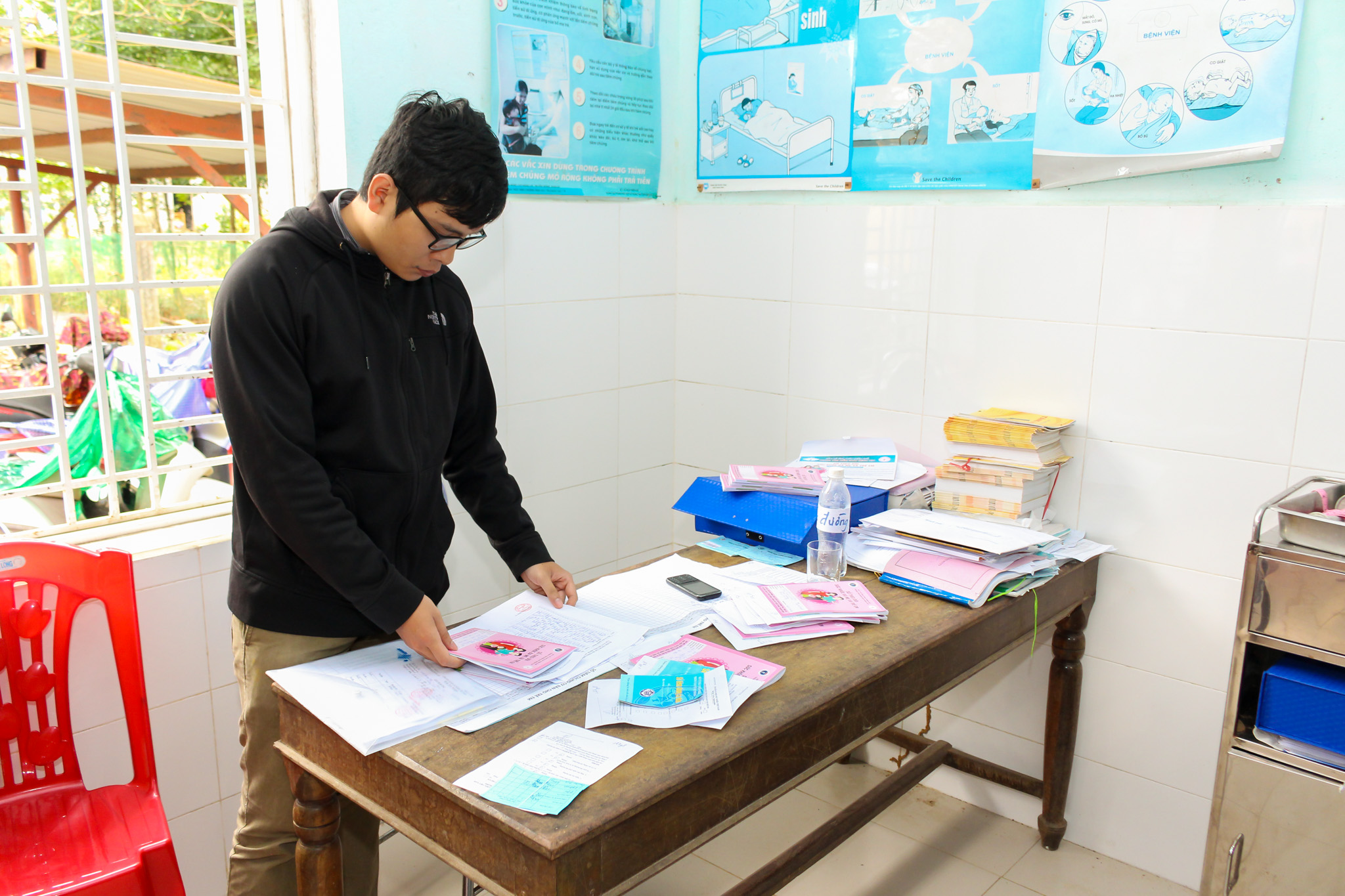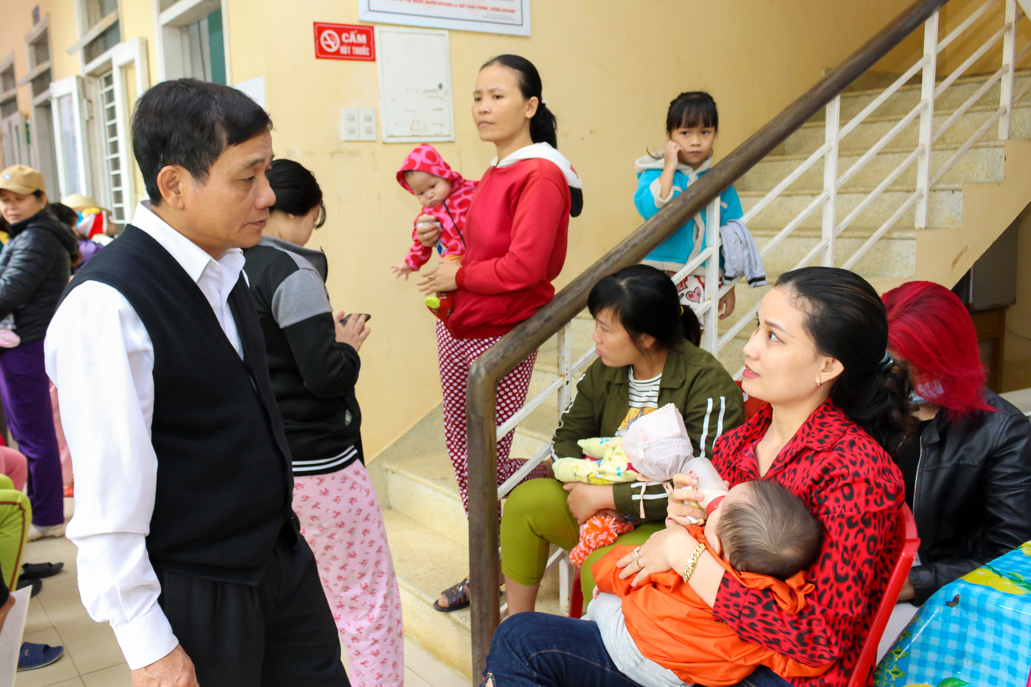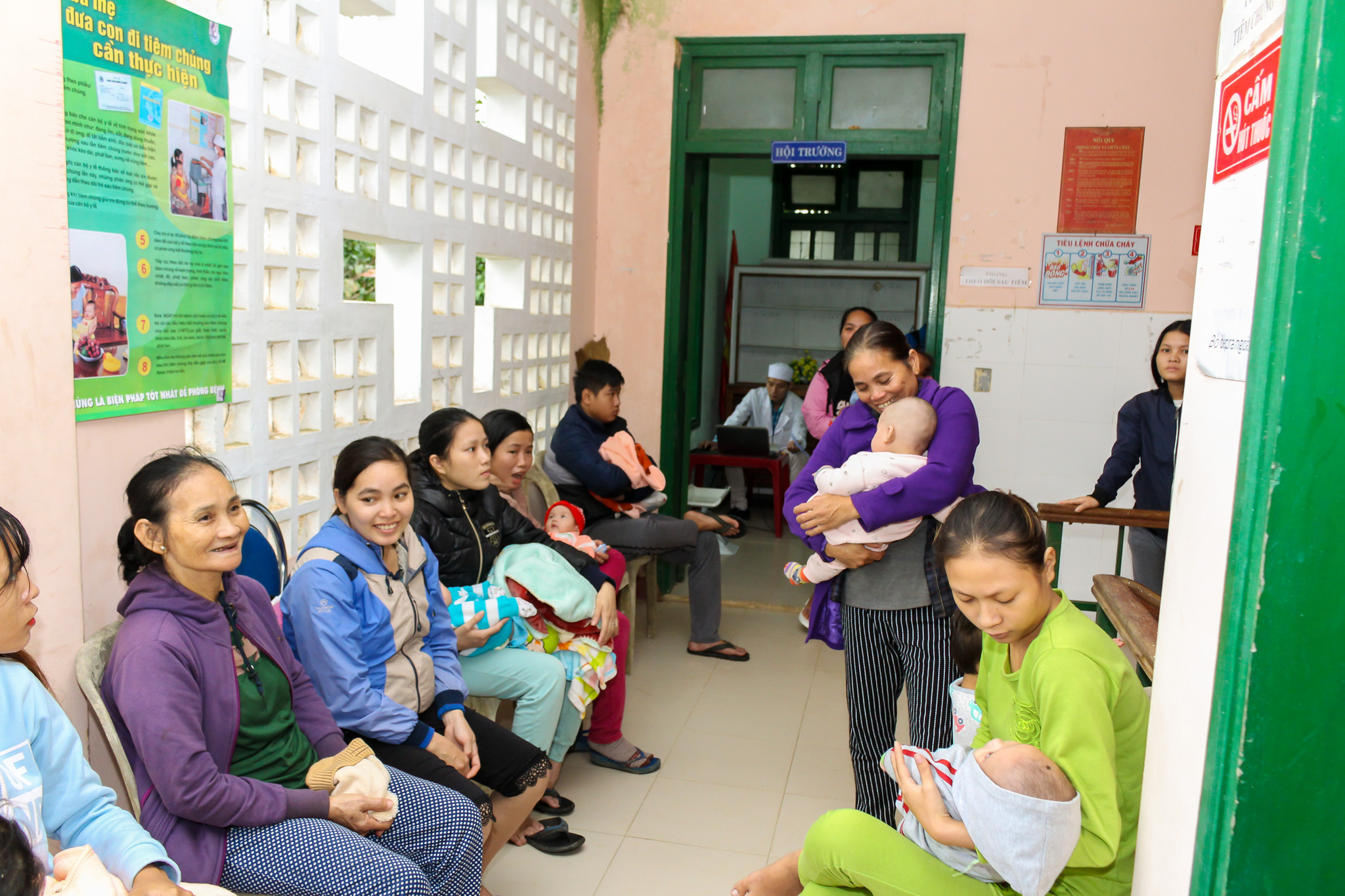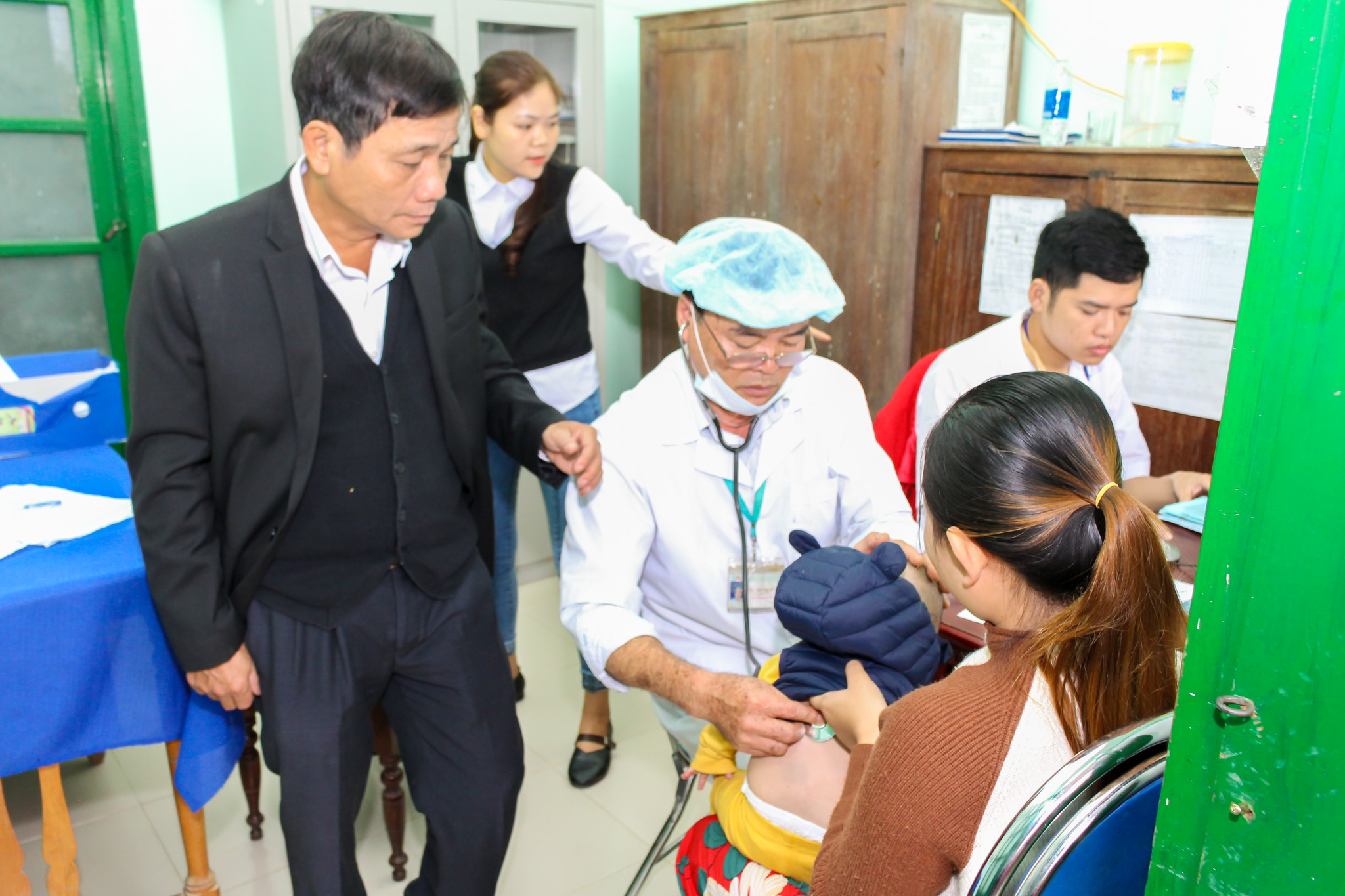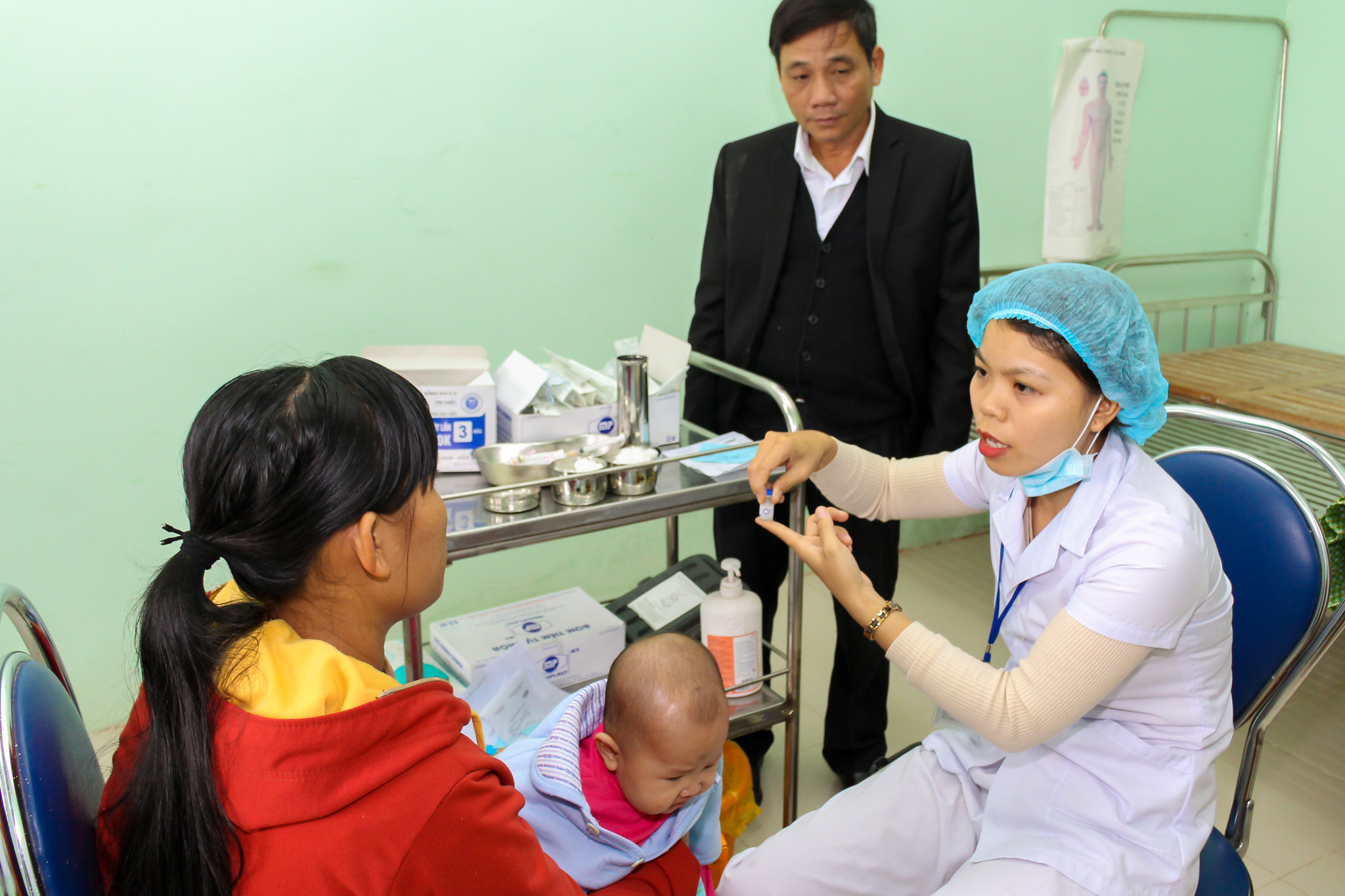 Tại Trạm y tế các xã Bình Thành, Hương Bình và Hồng Tiến, Ths.BS Phan Đăng Tâm cùng các thành viên trong Đoàn đã kiểm tra, giám sát các cán bộ tiêm chủng của các Trạm về quy trình tiêm chủng, quy trình tư vấn, theo dõi phản ứng sau tiêm chủng, theo dõi trực tiếp nhân viên y tế tư vấn và thực hành tiêm chủng cho trẻ được tiêm vắc-xin ComBE Five. Đặc biệt đoàn quan tâm đến các phương án sẵn sàng xử trí cấp cứu cơ động tại các điểm tiêm chủng như hộp thuốc chống sốc, phác đồ điều trị sốc phản vệ, việc vận hành và sử dụng bình ô xy.