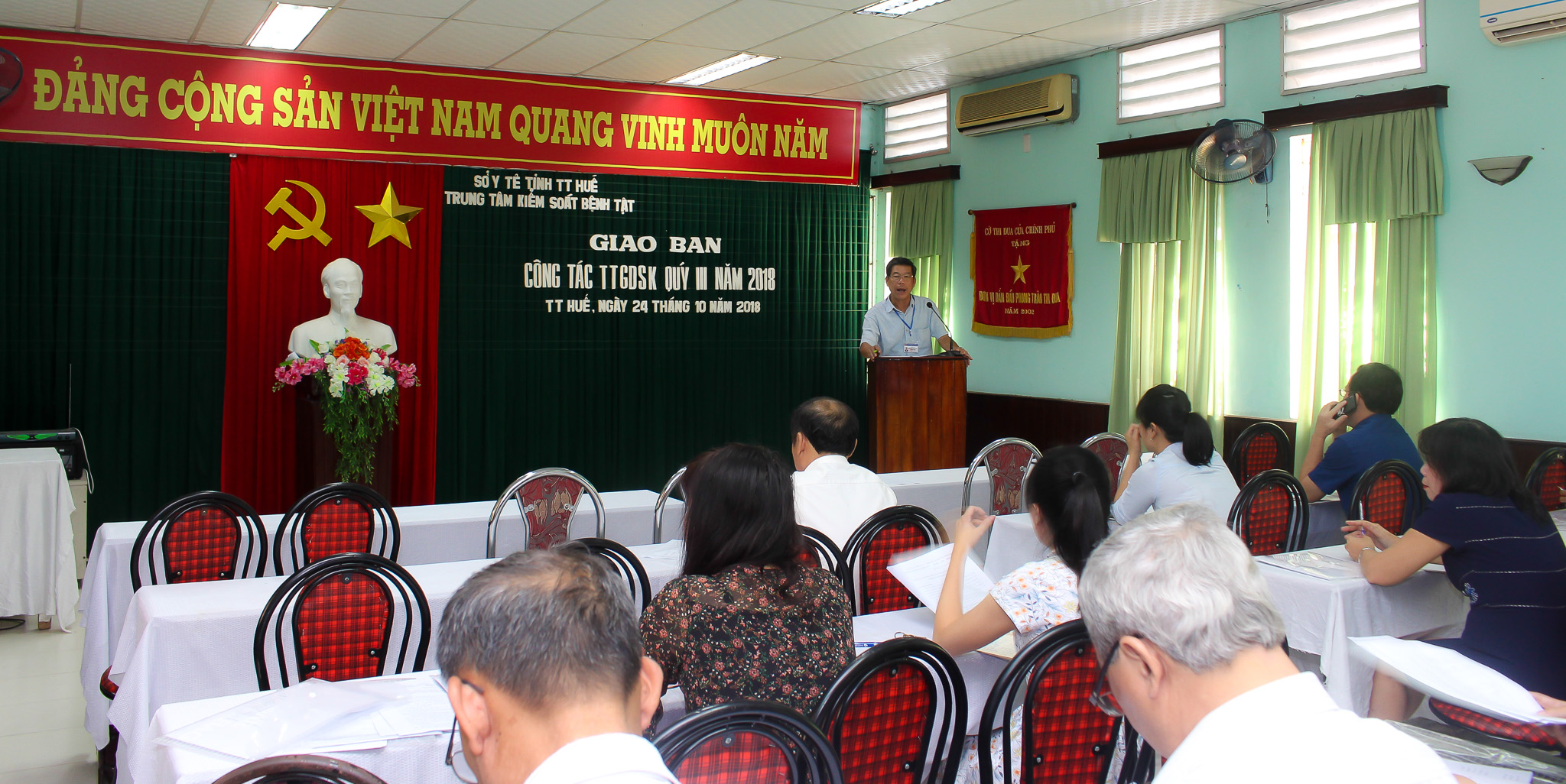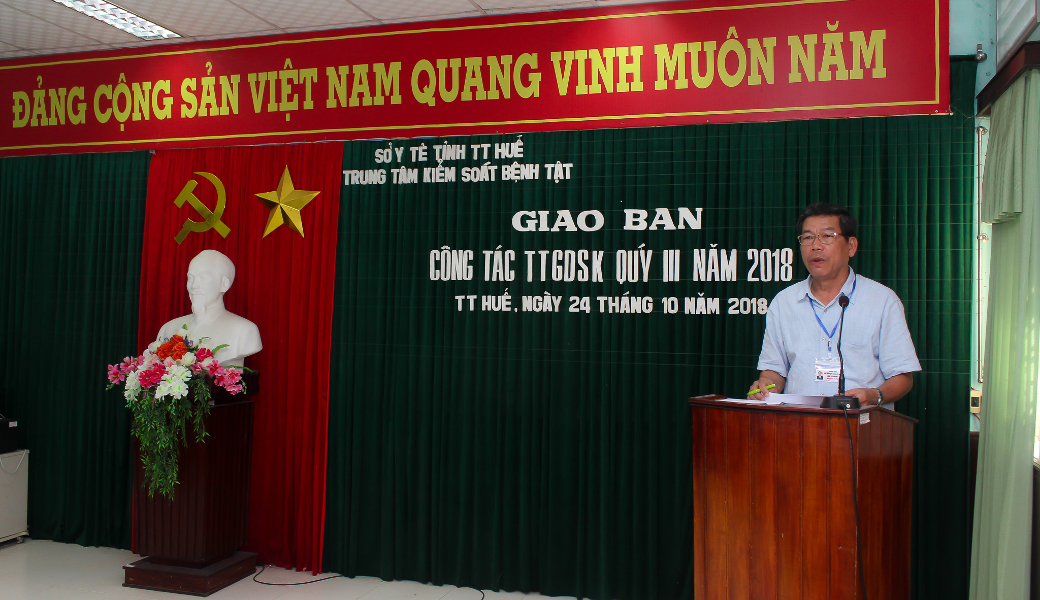 Ngày 24/10/2018 Trung tâm Kiểm soát bệnh tật tỉnh tổ chức Giao ban công tác truyền thông giáo dục sức khỏe quý III năm 2018. Được sự ủy quyền của Lãnh đạo Trung tâm KSBT tỉnh, BS.CKII Hầu Văn Nam - Trưởng khoa TTGDSK tham dự và chủ trì hội nghị cùng với các cán bộ phụ trách công tác truyền thông của 9 TTYT huyện/thị xã/thành phố và Trung tâm KSBT tỉnh.