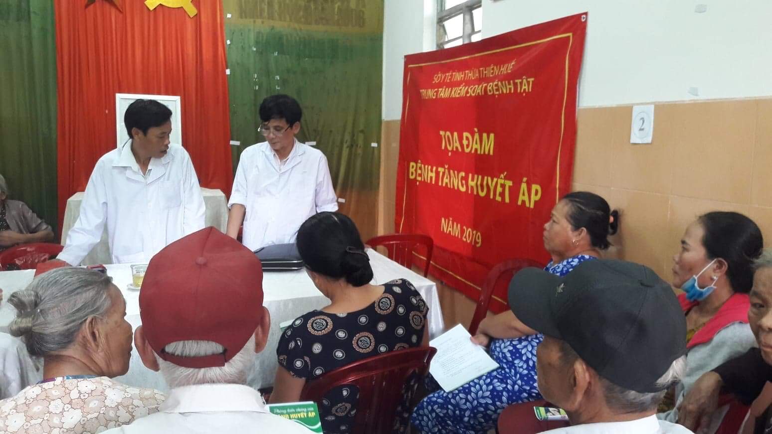 Triển khai hoạt động phòng chống bệnh tăng huyết áp của chương trình mục tiêu Y tế - Dân số năm 2019, Trung tâm kiểm soát bệnh tật tỉnh phối hợp với các trạm y tế xã Quảng Thành, Lộc Trì, Thủy Châu tổ chức buổi sinh hoạt câu lạc bộ bệnh nhân tăng huyết áp cho các bệnh nhân đang được quản lý, theo dõi và điều trị bệnh tăng huyết áp tại tuyến y tế cơ sở.