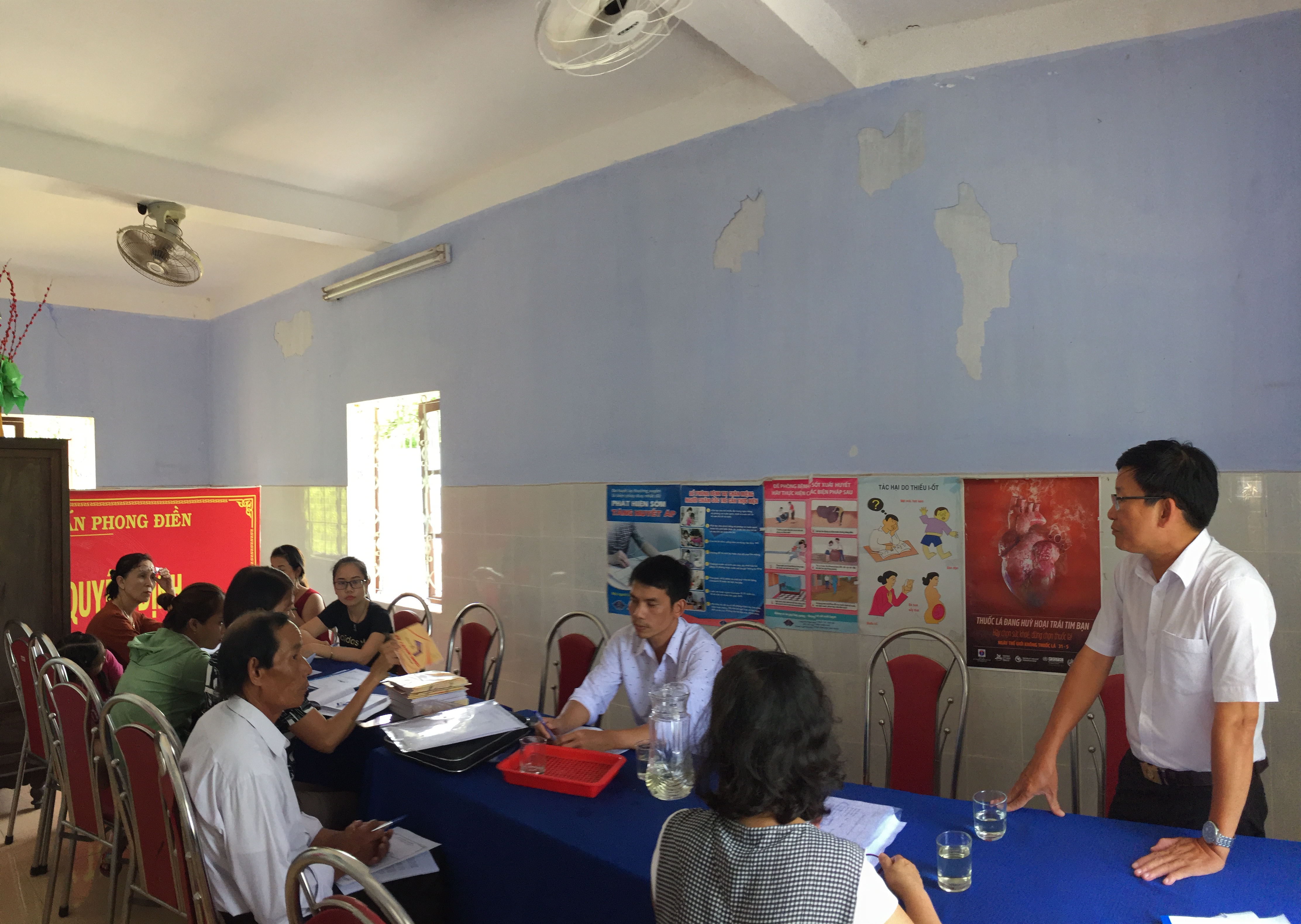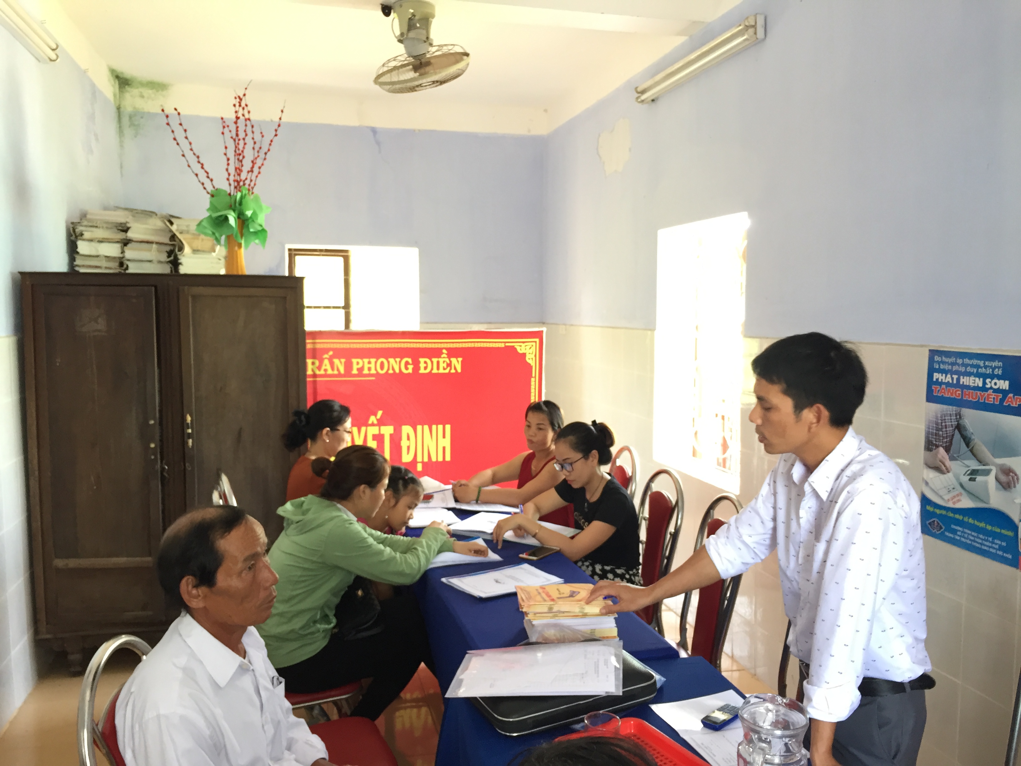 - Trạm y tế đón tiếp đối tượng, đo chiều cao, cân nặng, kiểm tra huyết áp. Đánh giá nguy cơ tim mạch, tư vấn và theo dõi quản lý các bệnh nhân tăng huyết áp.