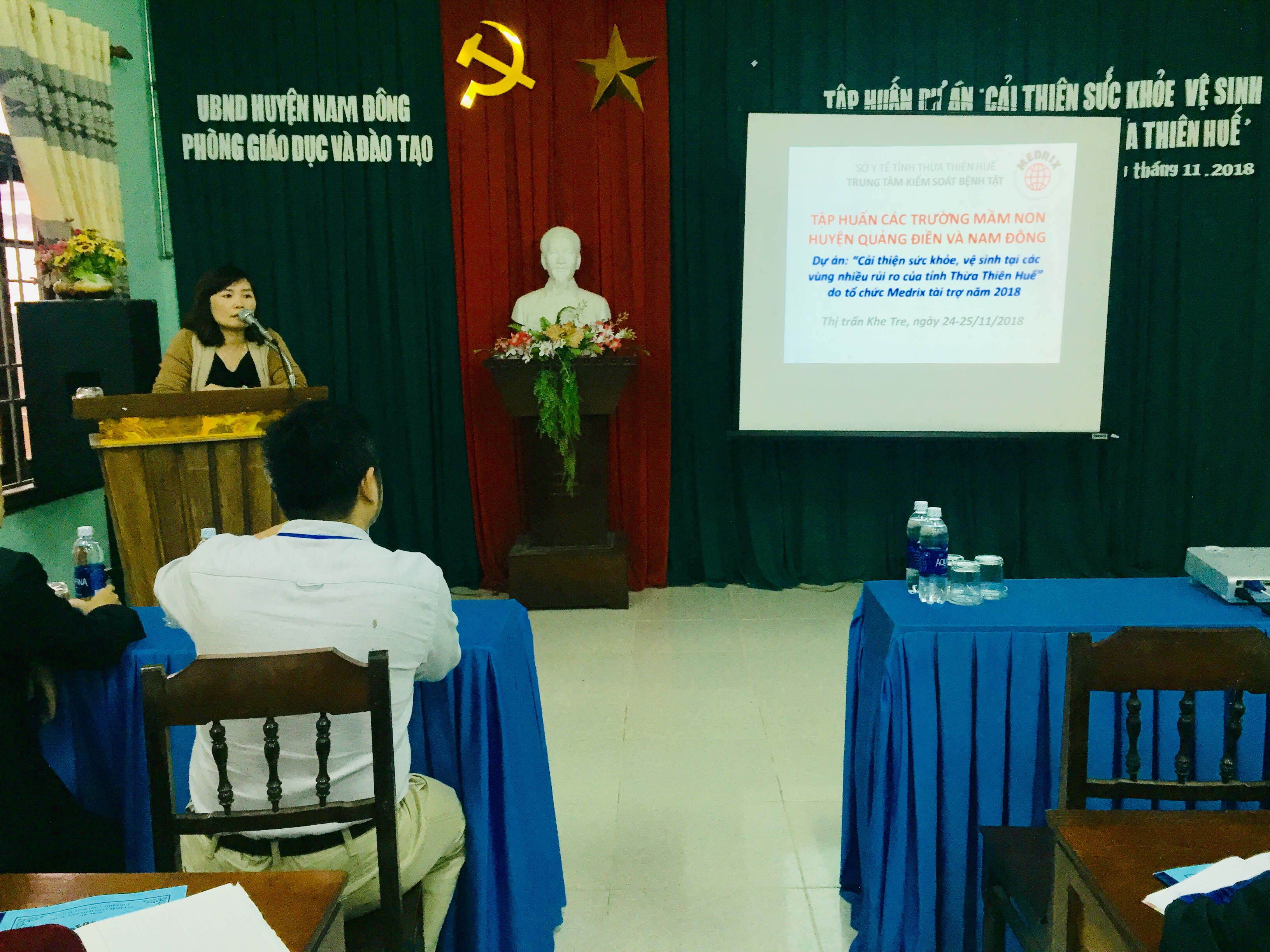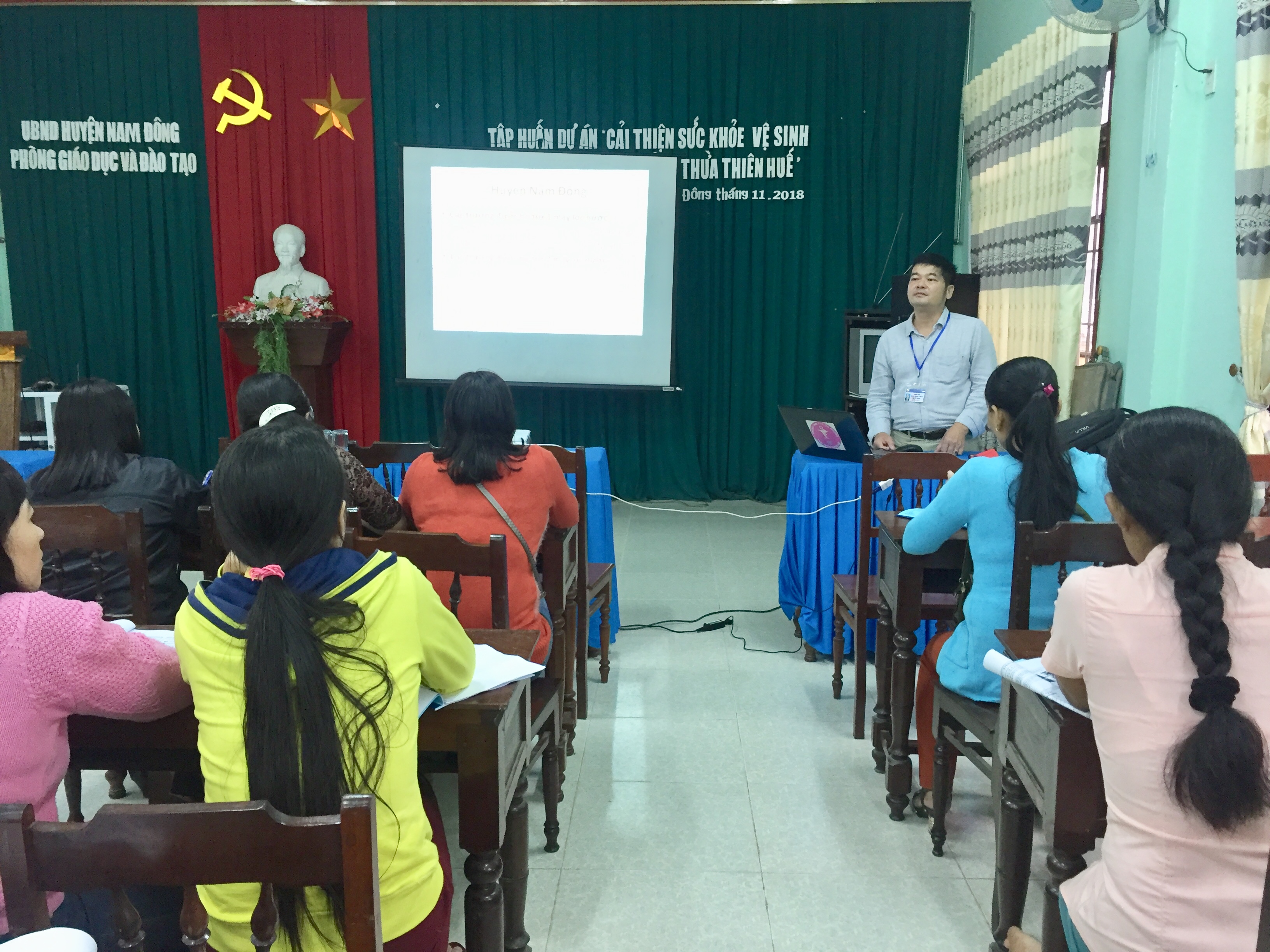 Từ ngày 24/11 đến 25/11/2018, tại Hội trường Phòng Giáo dục và Đào tạo huyện Nam Đông, Trung tâm Kiểm soát bệnh tật Tỉnh đã tổ chức các lớp tập huấn cho cán bộ y tế trường học và Ban giám hiệu và toàn bộ giáo viên của 04 trường Mầm non trên địa bàn huyện tham gia dự án.