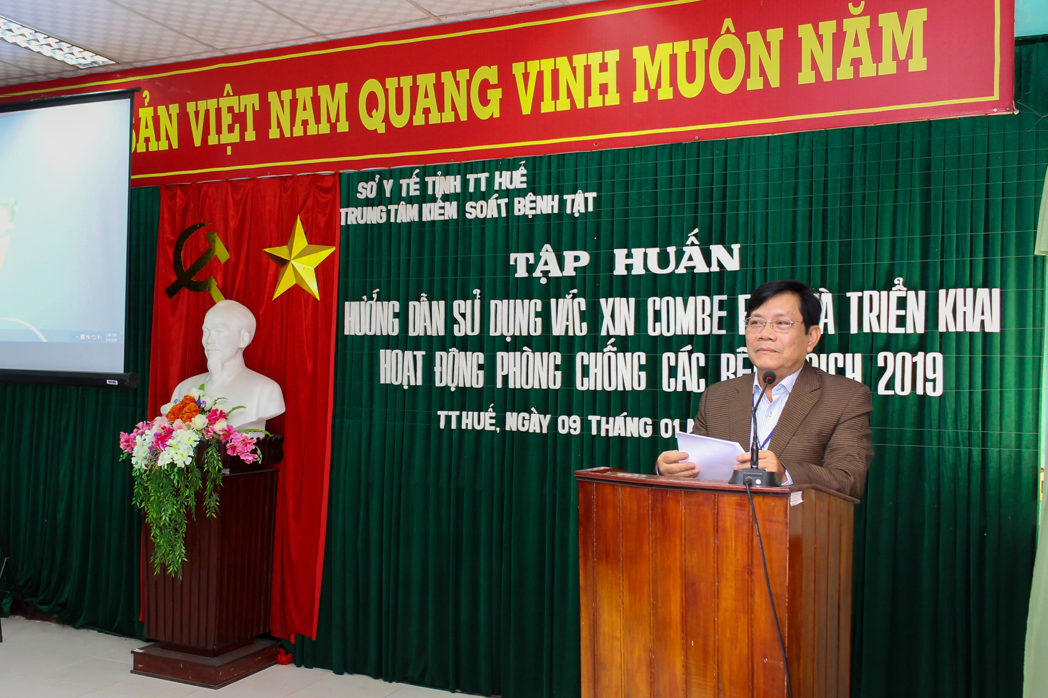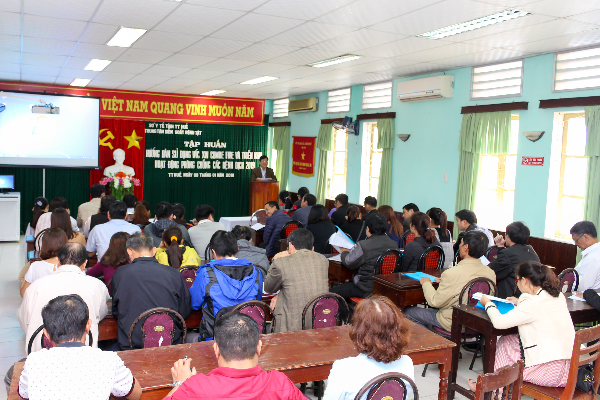 Ngày 9/1/2019, Trung tâm Kiểm soát bệnh tật tỉnh tổ chức Tập huấn hướng dẫn xử dụng vắc xin ComBE-Five và triển khai hoạt động phòng chống các bệnh dịch năm 2019. Đến dự khai mạc và chỉ đạo lớp tập huấn có PGS.TS Nguyễn Đình Sơn - Phó Giám đốc phụ trách Trung tâm Kiểm soát bệnh tật tỉnh; các đ/c trong Ban lãnh đạo Trung tâm, đại diện lãnh đạo các khoa, phòng của Trung tâm KSBT. Về phía huyện, thị xã, thành phố có đại diện lãnh đạo các TTYT, phòng Kế hoạch nghiệp vụ, khoa KSBT và HIV/AIDS và các cán bộ chuyên trách phòng chống dịch.