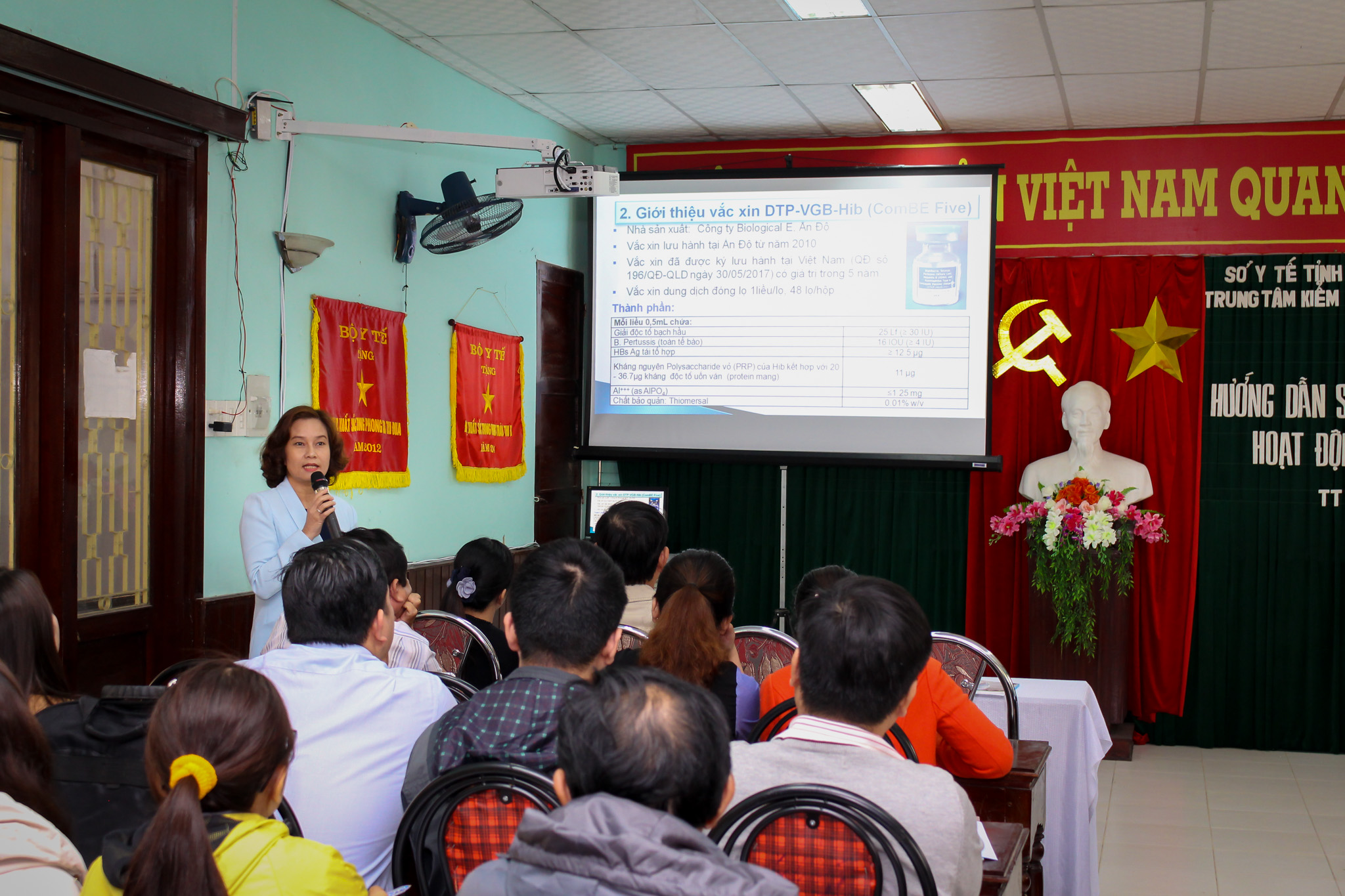 Nhằm cung cấp những thông tin cần thiết về vắc xin ComBE Five, tại lớp tập huấn BS Đặng Thị Diệu Thúy - Phó trưởng Khoa phòng chống bệnh truyền nhiễm - Trung tâm Kiểm soát bệnh tật tỉnh đã hướng dẫn sử dụng vắc xin phối hợp DPT-VGB- Hib trong tiêm chủng mở rộng cho các cán bộ phụ trách tiêm chủng tại các đơn vị y tế trên địa bàn toàn tỉnh, tài liệu này sẽ giúp cán bộ y tế sử dụng vắc xin an toàn cũng như truyền thông đến cho các bậc cha mẹ và cộng đồng trong quá trình triển khai tiêm chủng vắc xin này.