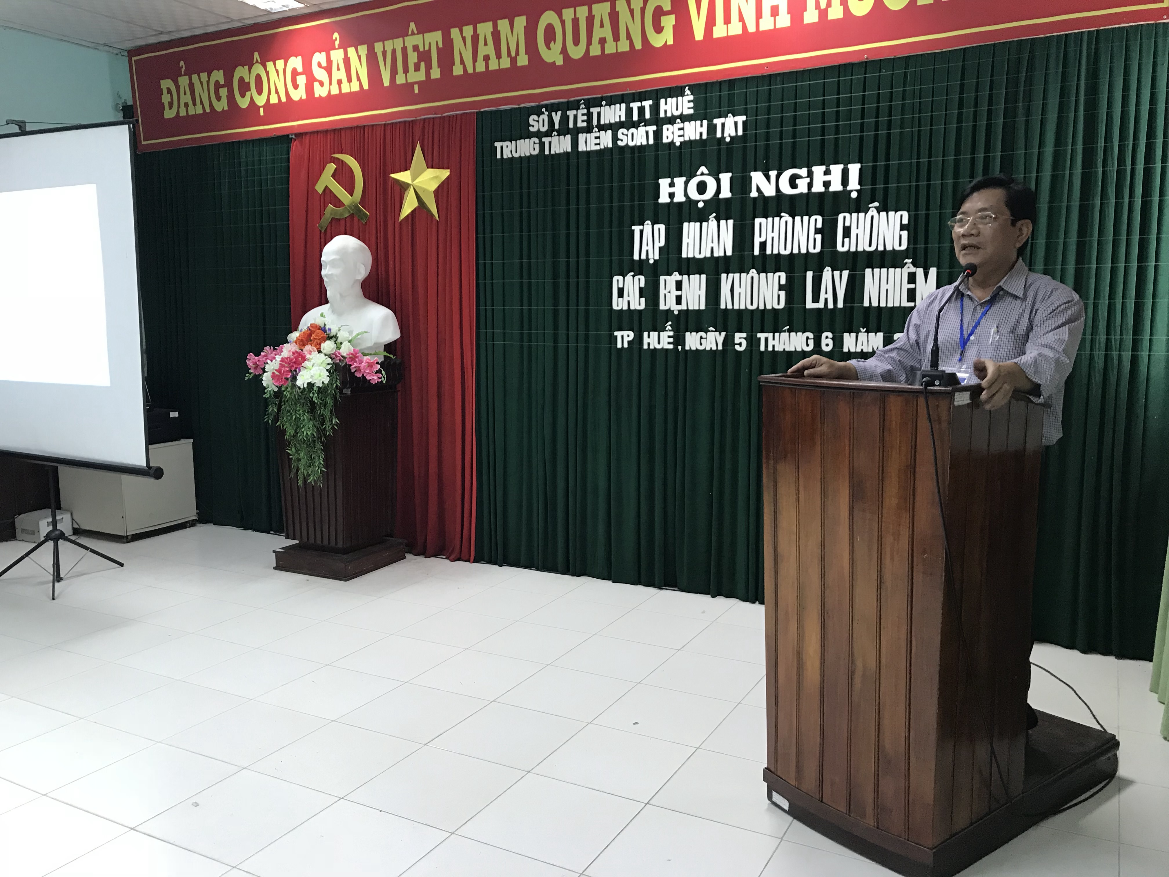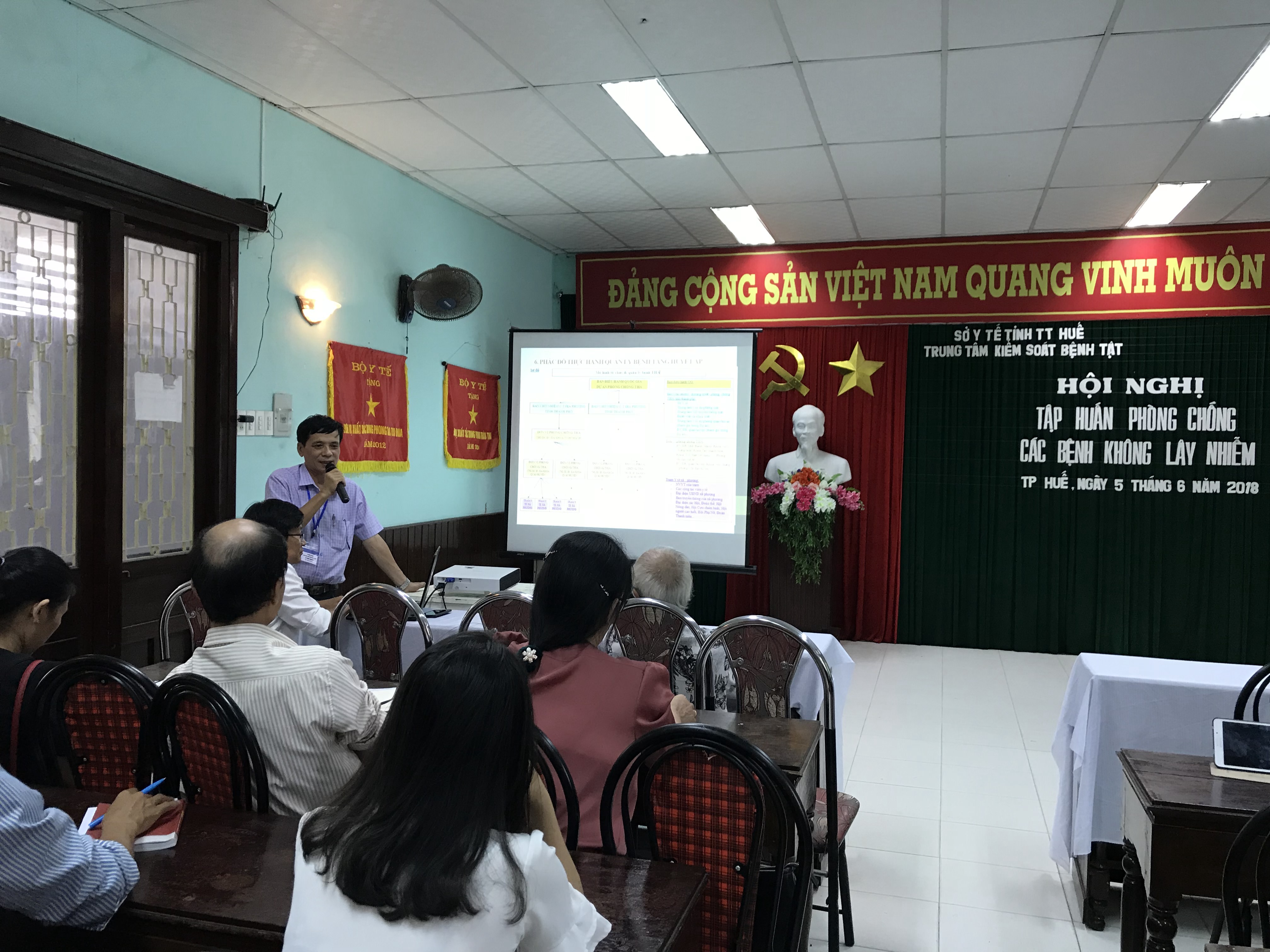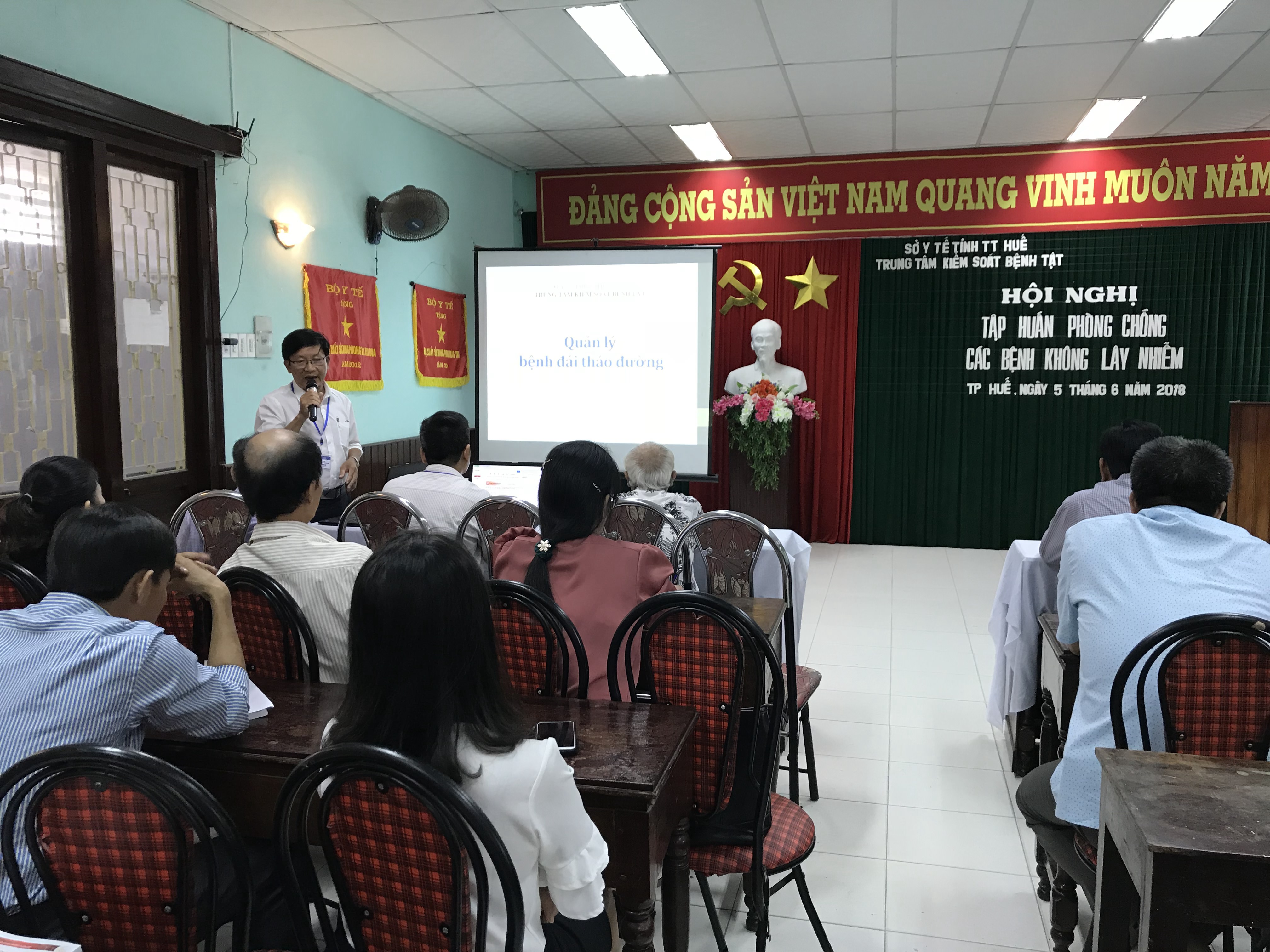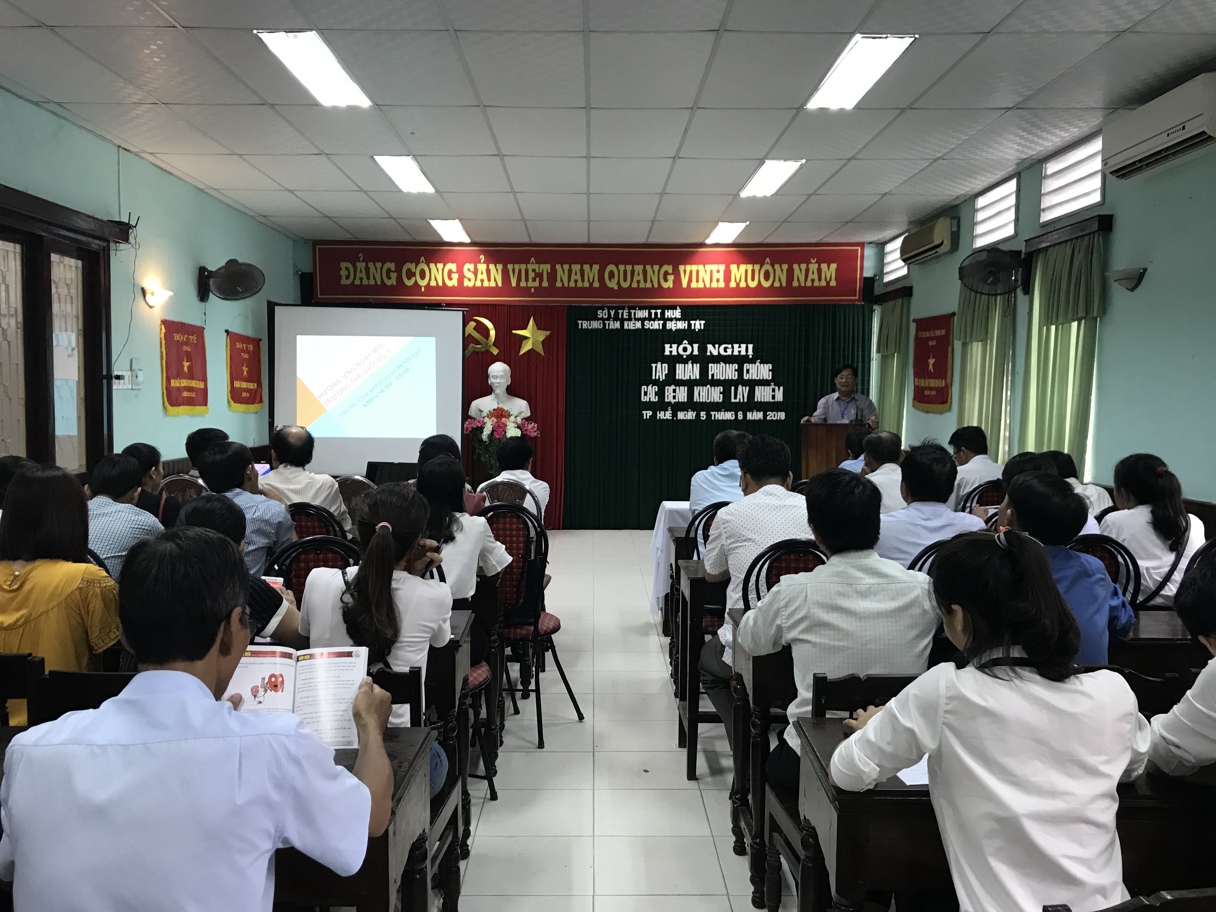 Ngày 05/06/2018, tại hội trường số 10-12 Nguyễn Văn Cừ, Trung tâm Kiểm soát Bệnh tật tỉnh Thừa Thiên Huế tổ chức tập huấn phòng chống các bệnh không lây nhiễm và triển khai các hoạt động hưởng ứng Ngày môi trường thế giới 5/6 cho cán bộ lãnh đạo và chuyên trách 9 huyện, thị xã, thành phố Huế.
