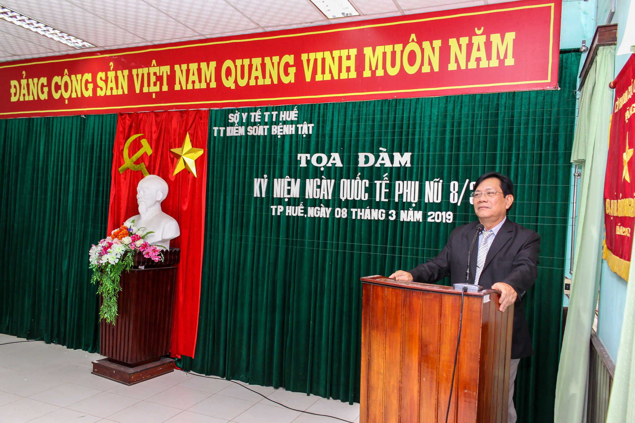 Phát biểu tại buổi Tọa đàm PGS.TS Nguyễn Đình Sơn – Bí thư Đảng ủy, Phó Giám đốc phụ trách Trung tâm KSBT tỉnh đã biểu dương và ghi nhận những nỗ lực đóng góp và thành tích mà các chị em phụ nữ toàn Trung tâm đã đạt được trong thời gian qua. Đồng thời đồng chí đã chia sẻ những khó khăn và động viên kịp thời chị em cố gắng khắc phục để hoàn thành nhiệm vụ. Mong rằng chị em phát huy truyền thống người phụ nữ Việt Nam “Trung hậu, đảm đang” để khẳng định vị thế và vai trò của người phụ nữ trong thời kỳ mới.