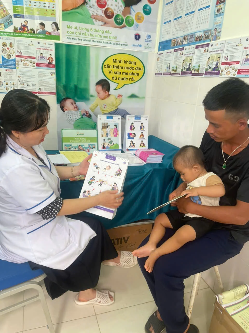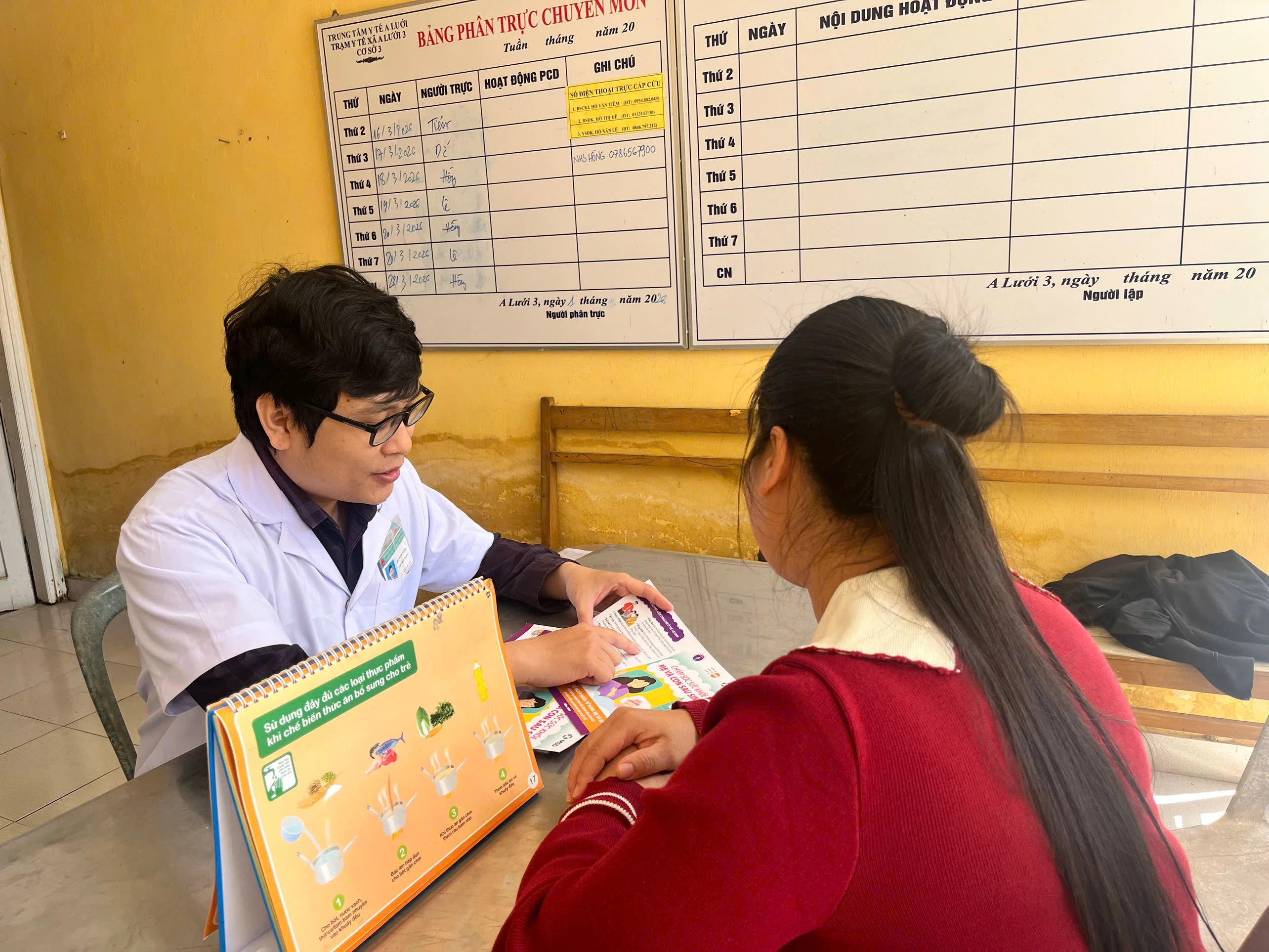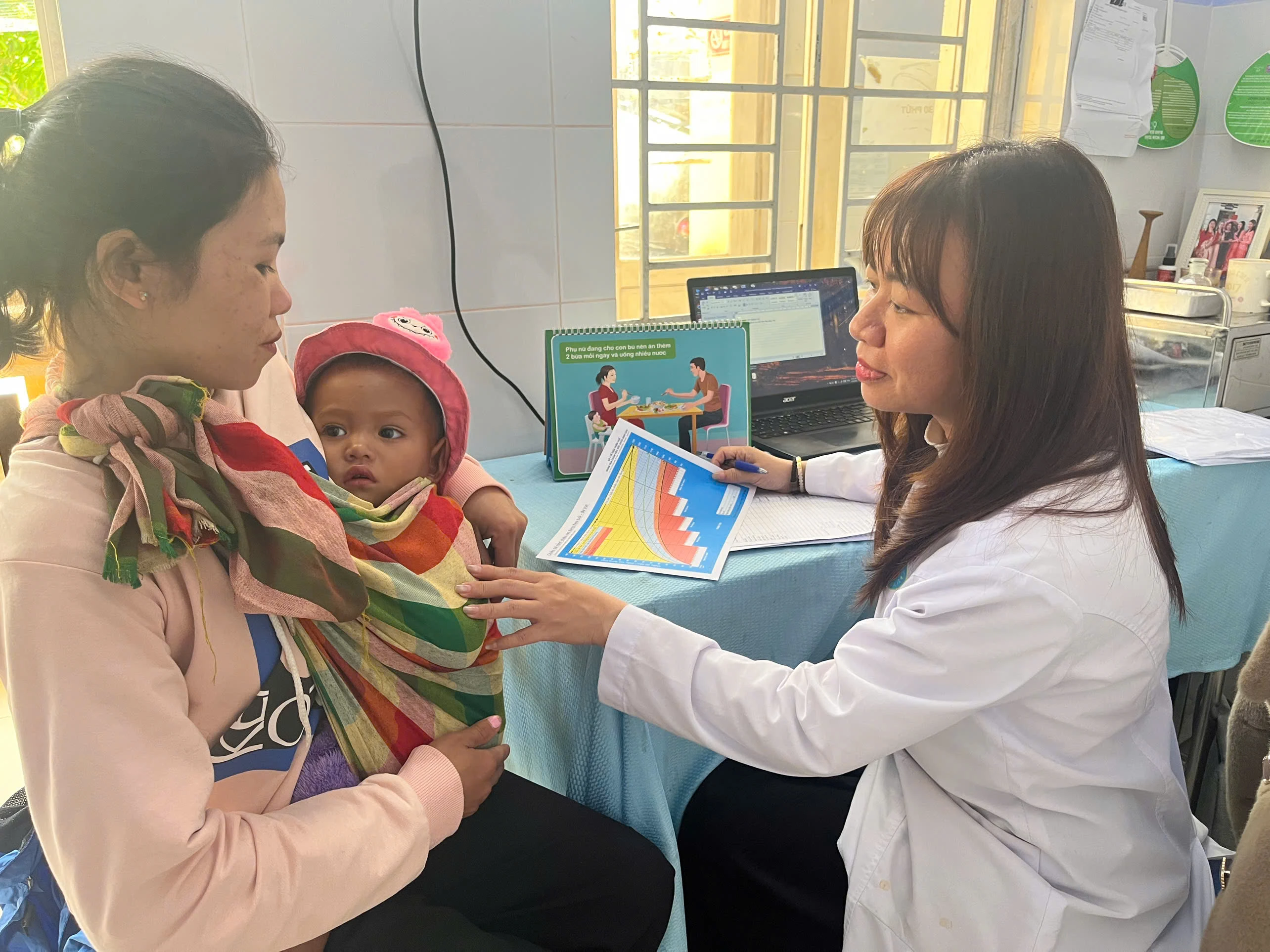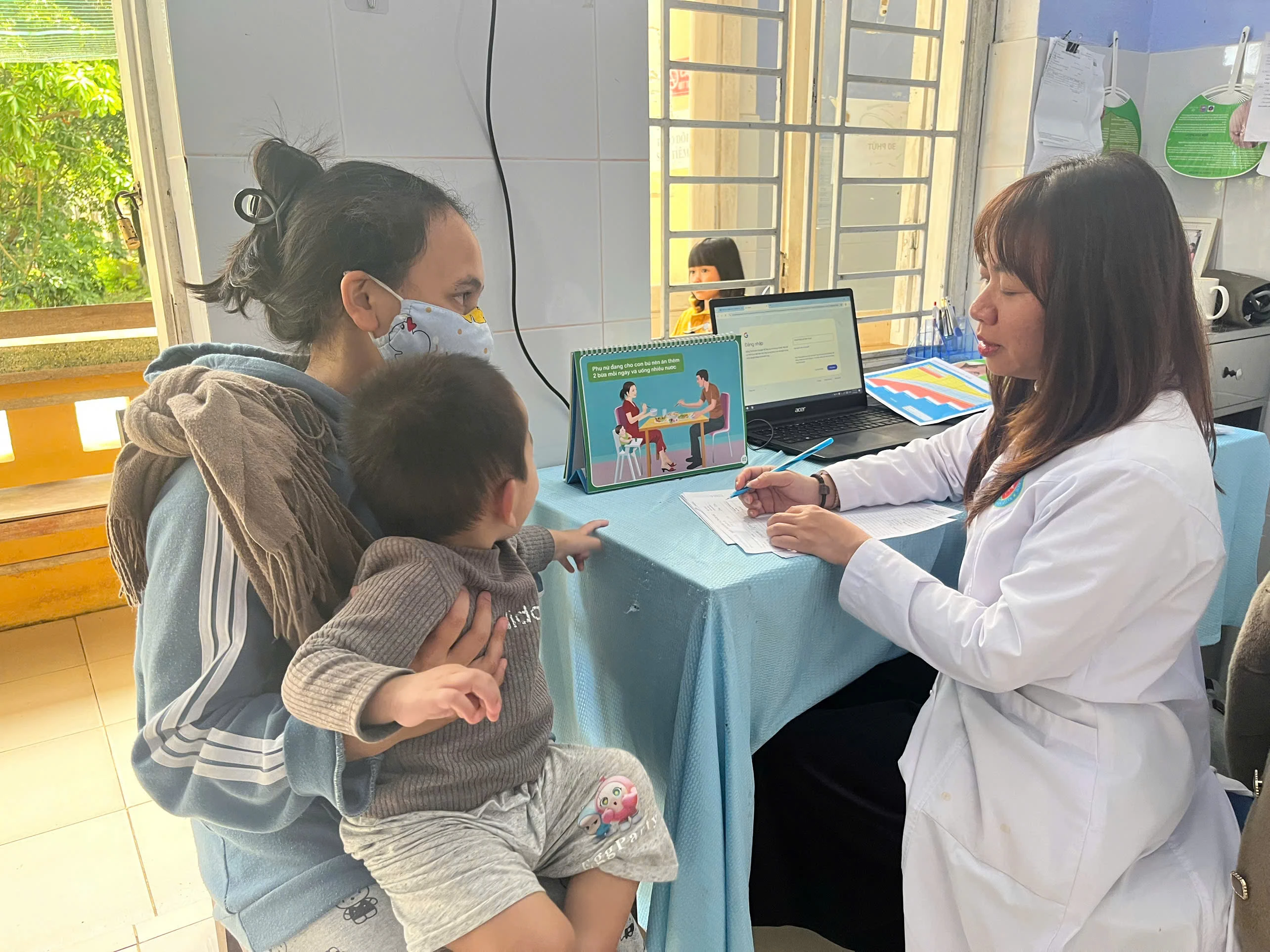 Cán bộ y tế tư vấn, hướng dẫn chăm sóc dinh dưỡng cho trẻ nhỏ trong giai đoạn 1.000 ngày đầu đời cho người chăm sóc trẻ tại Trạm Y tế.