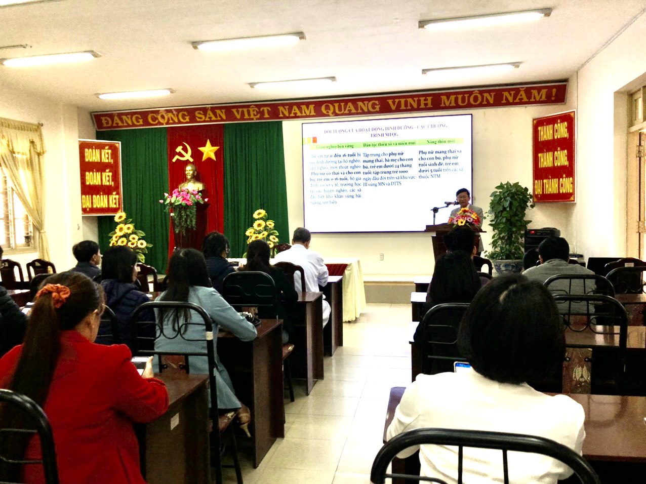 Tham dự lớp tập huấn có các đại diện lãnh đạo của TTKSBT, TTYT huyện, thị xã, thành phố và trưởng/phó trạm y tế, chuyên trách dinh dưỡng, chuyên trách vitamin A của các xã nông thôn mới trên địa bàn tỉnh. Trong suốt quá trình tập huấn các học viên đã được các giảng viên tuyến tỉnh giới thiệu các hoạt động được triển khai trong chương trình MTQG nông thôn mới như: cập nhật chuyên môn về dinh dưỡng, chăm sóc dinh dưỡng trong 1000 ngày đầu đời, phòng chống suy dinh dưỡng thấp còi và phòng chống thiếu vi chất, các hoạt động bổ sung sắt/ đa vi chất cho phụ nữ mang thai, bổ sung vi chất dinh dưỡng cho trẻ bị suy dinh dưỡng thấp còi. Đồng thời các học viên cũng được trao đổi, chia sẻ cũng như cập nhật một số nội dung liên quan đến dinh dưỡng về cách đo chu vi vòng cánh tay xác định tình trạng dinh dưỡng của trẻ và được giới thiệu về mô hình hành trình đầu đời ( EJOL) đây là chương trình đào tạo kỹ năng làm cha mẹ tích cực với ba mô hình ( trực tiếp, phối hợp và trực tuyến) với mong muốn nhân rộng mô hình hành trình đầu đời tại các xã nông thôn mới nhằm nâng cao kiến thức, kỹ năng chăm sóc trẻ trong 1000 ngày đầu đời. Các học viên đã tích cực tham gia thực hành, chia sẻ kinh nghiệm và có kết quả lượng giá đầu ra 100% đạt.