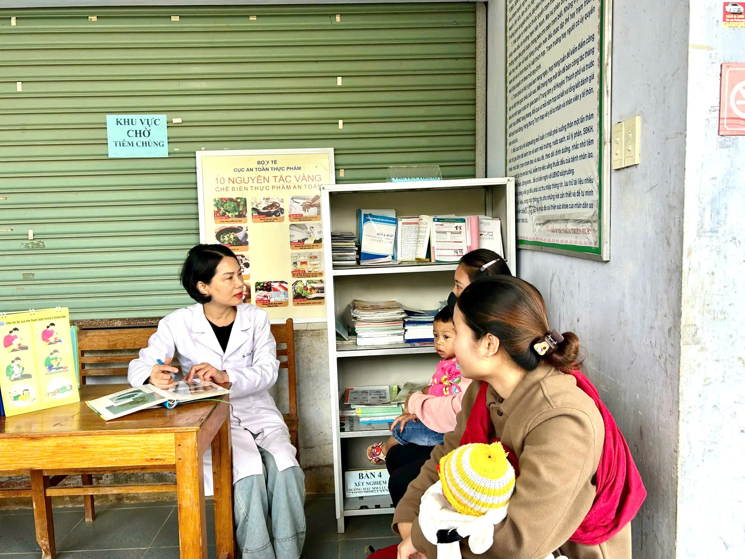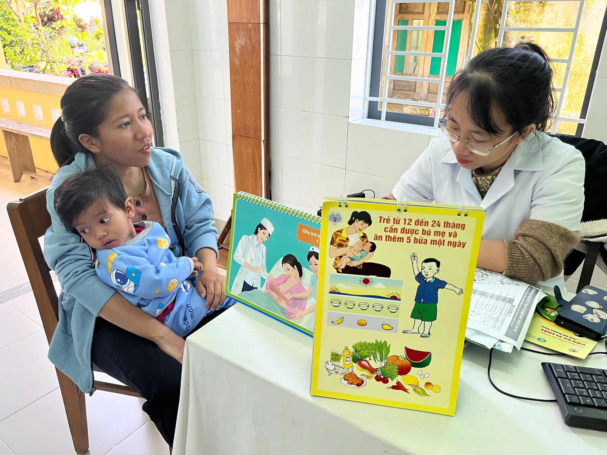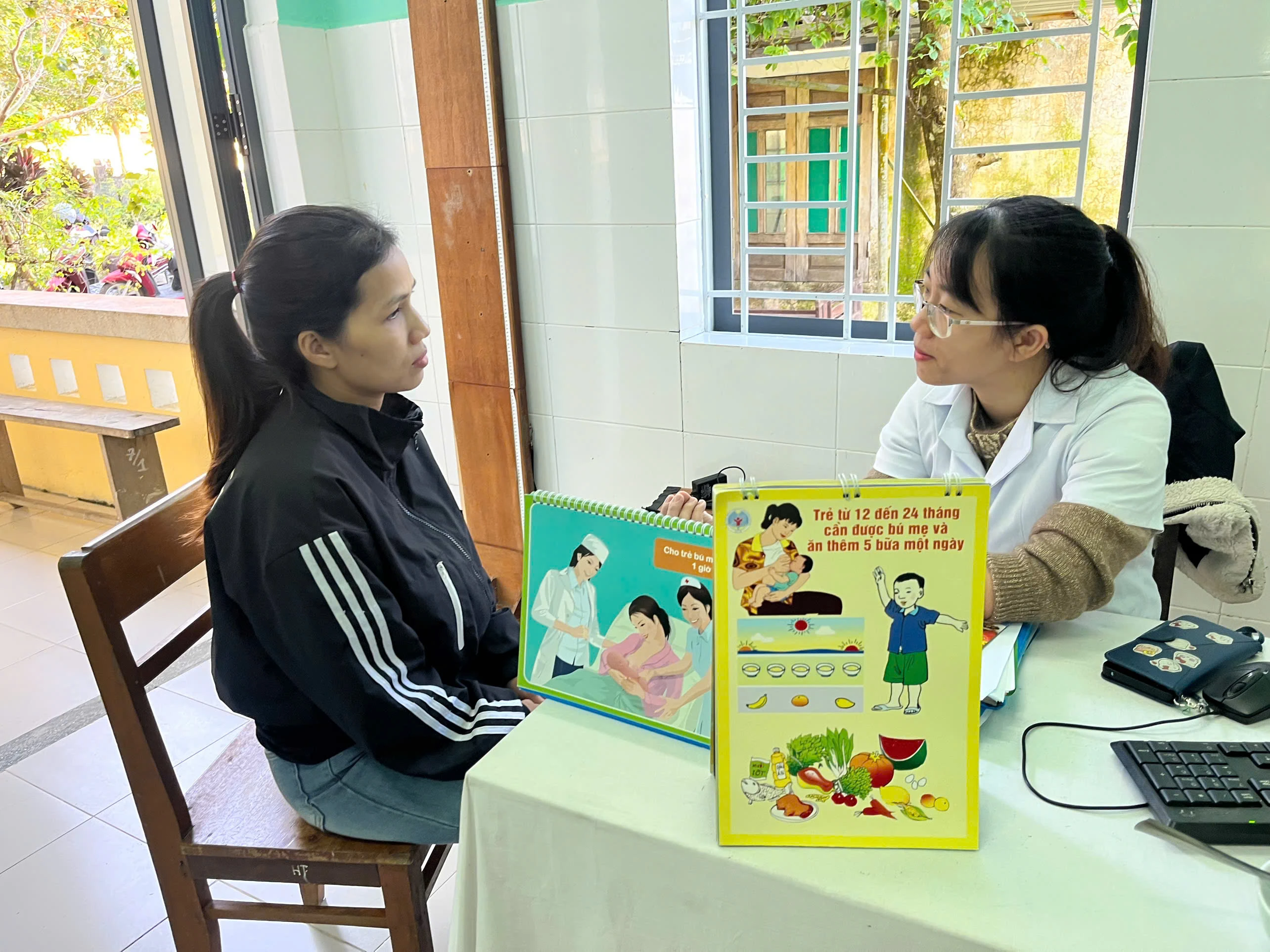 Cán bộ y tế tư vấn dinh dưỡng cho bà mẹ có con nhỏ trong độ tuổi 6–24 tháng